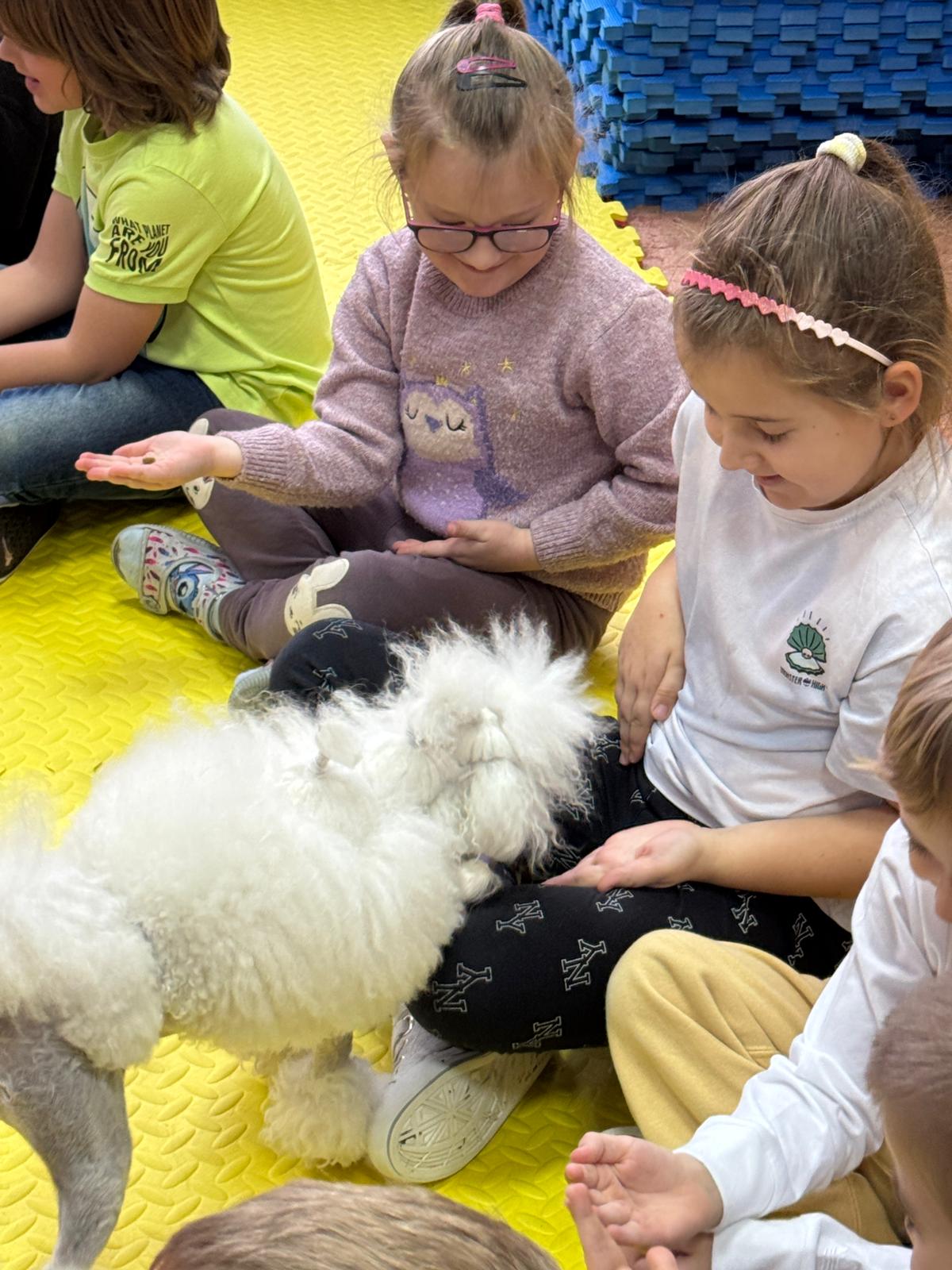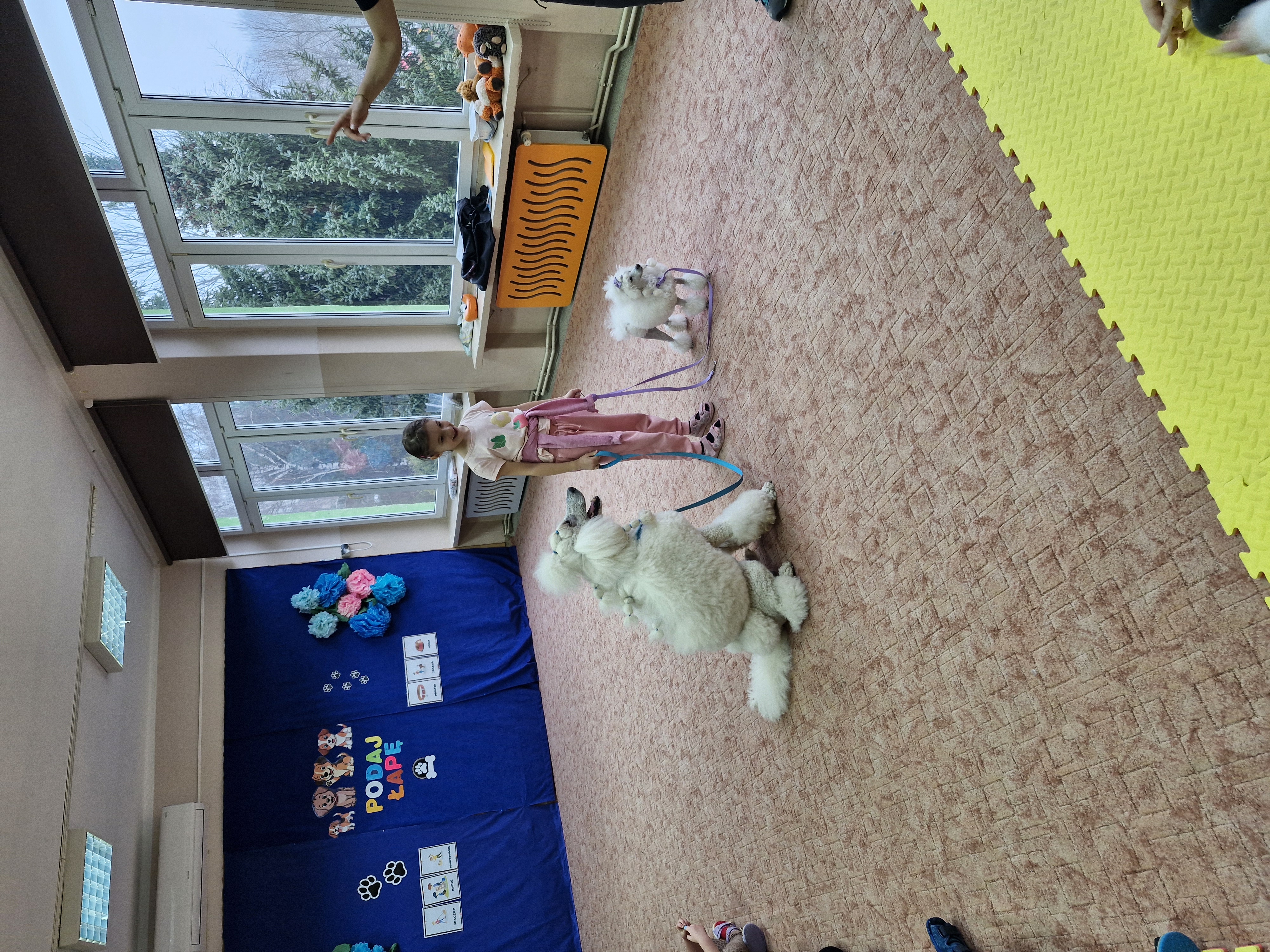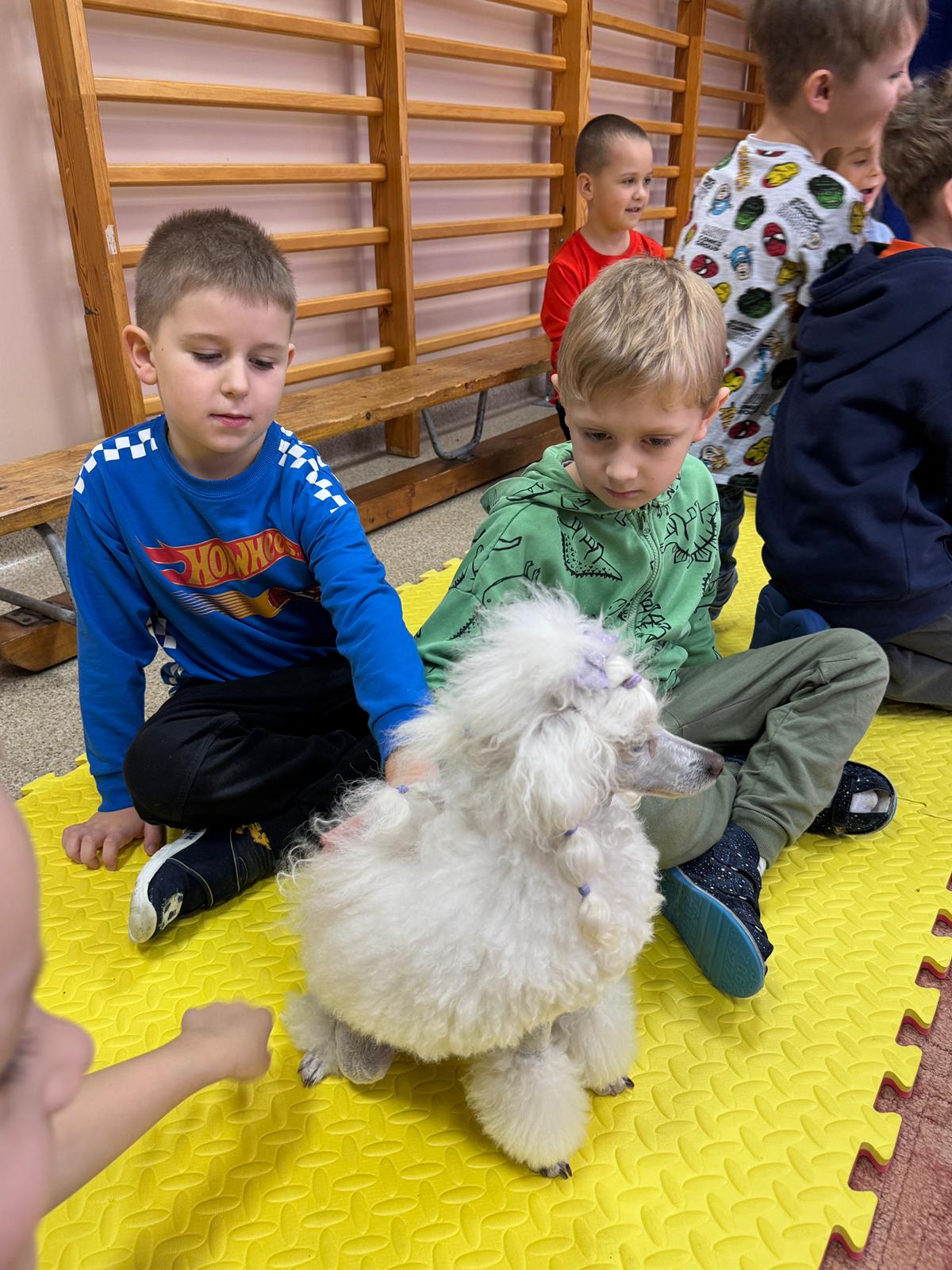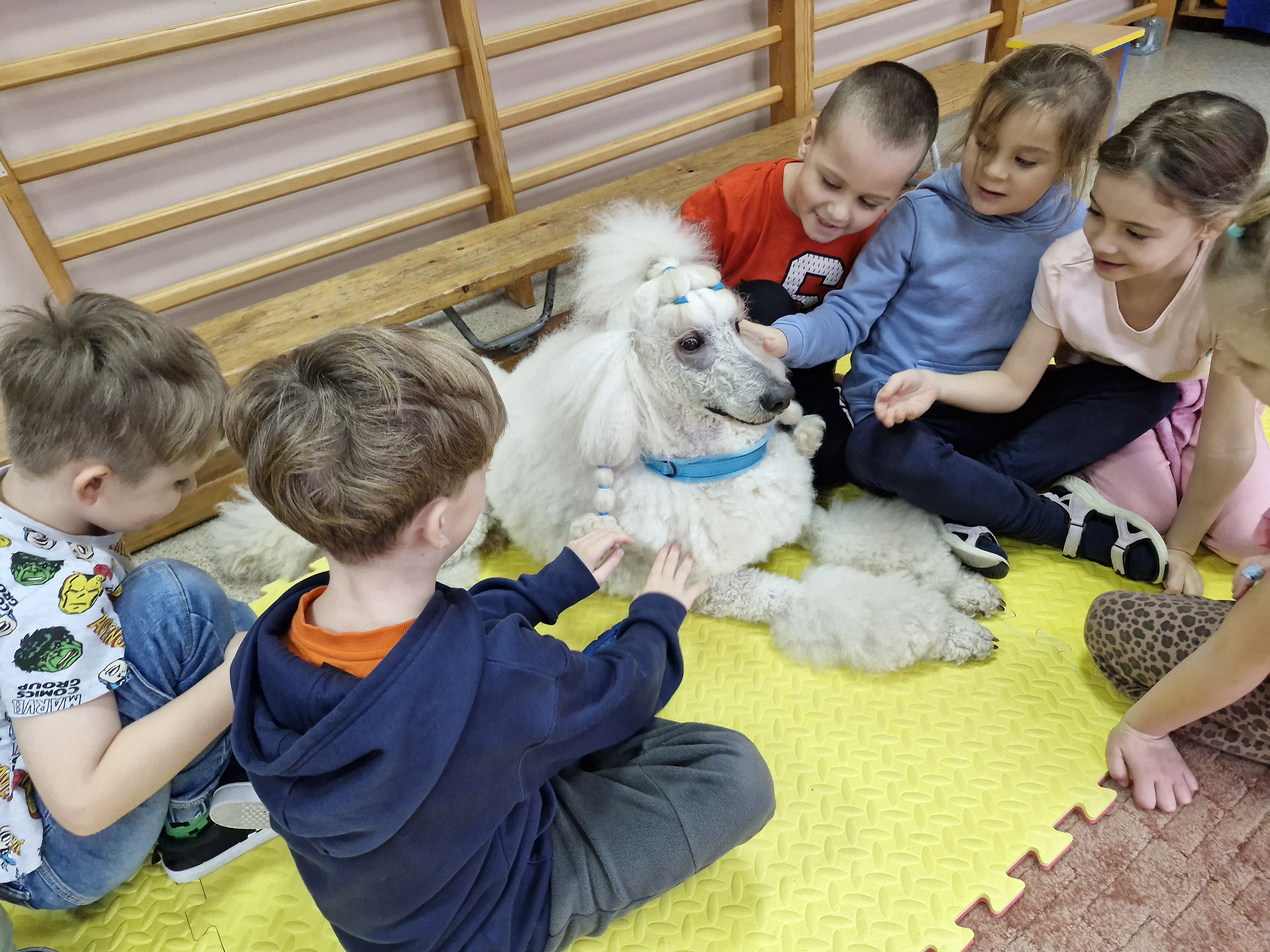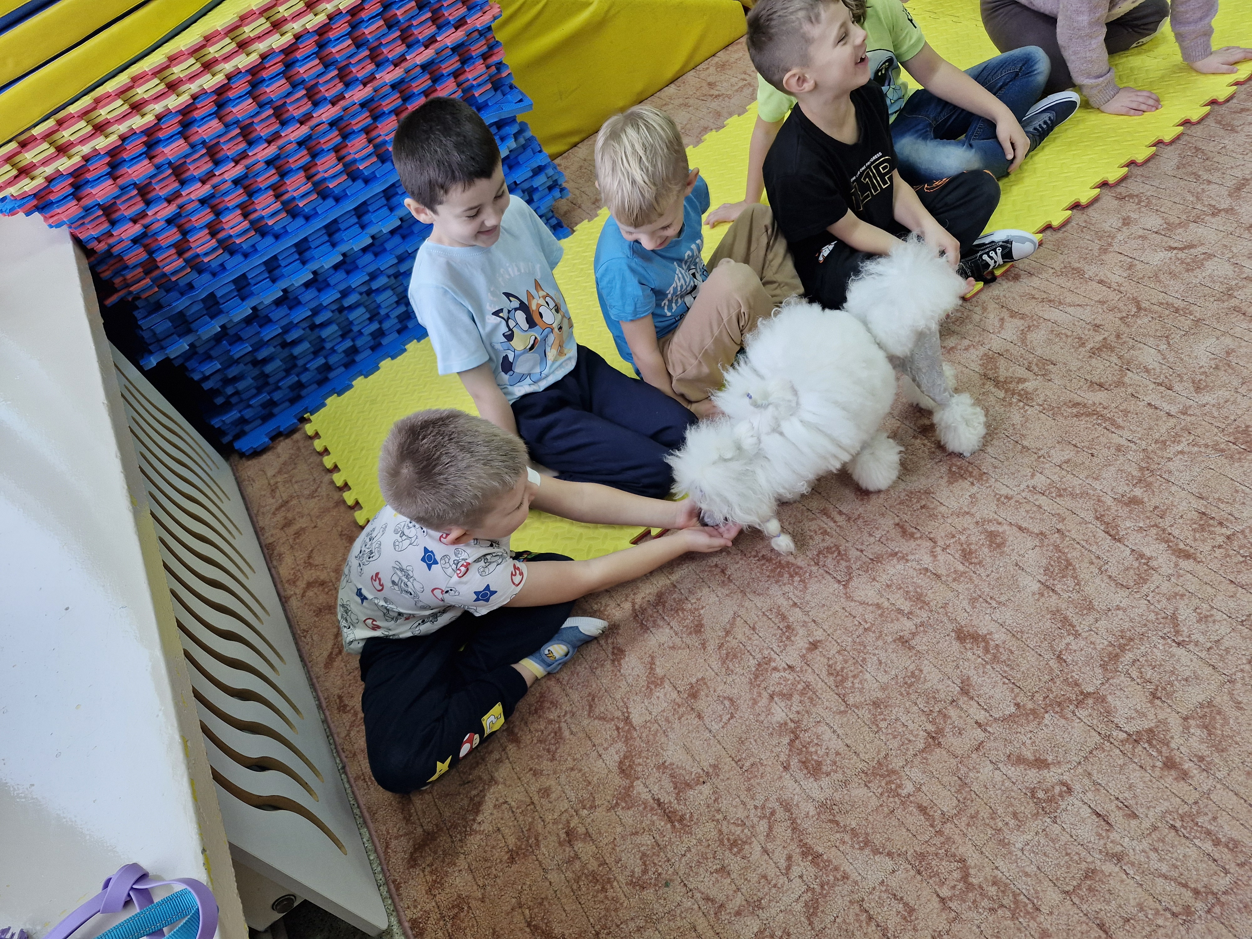 Naszymi wyjątkowymi gośćmi były urocze pieski: Lagertha, Krzysztof, Ananas oraz Scooby-Doo , które wraz z terapeutką — panią Agnieszką Adamiec — poprowadziły spotkanie w ramach programu „Podaj łapę na powitanie”.