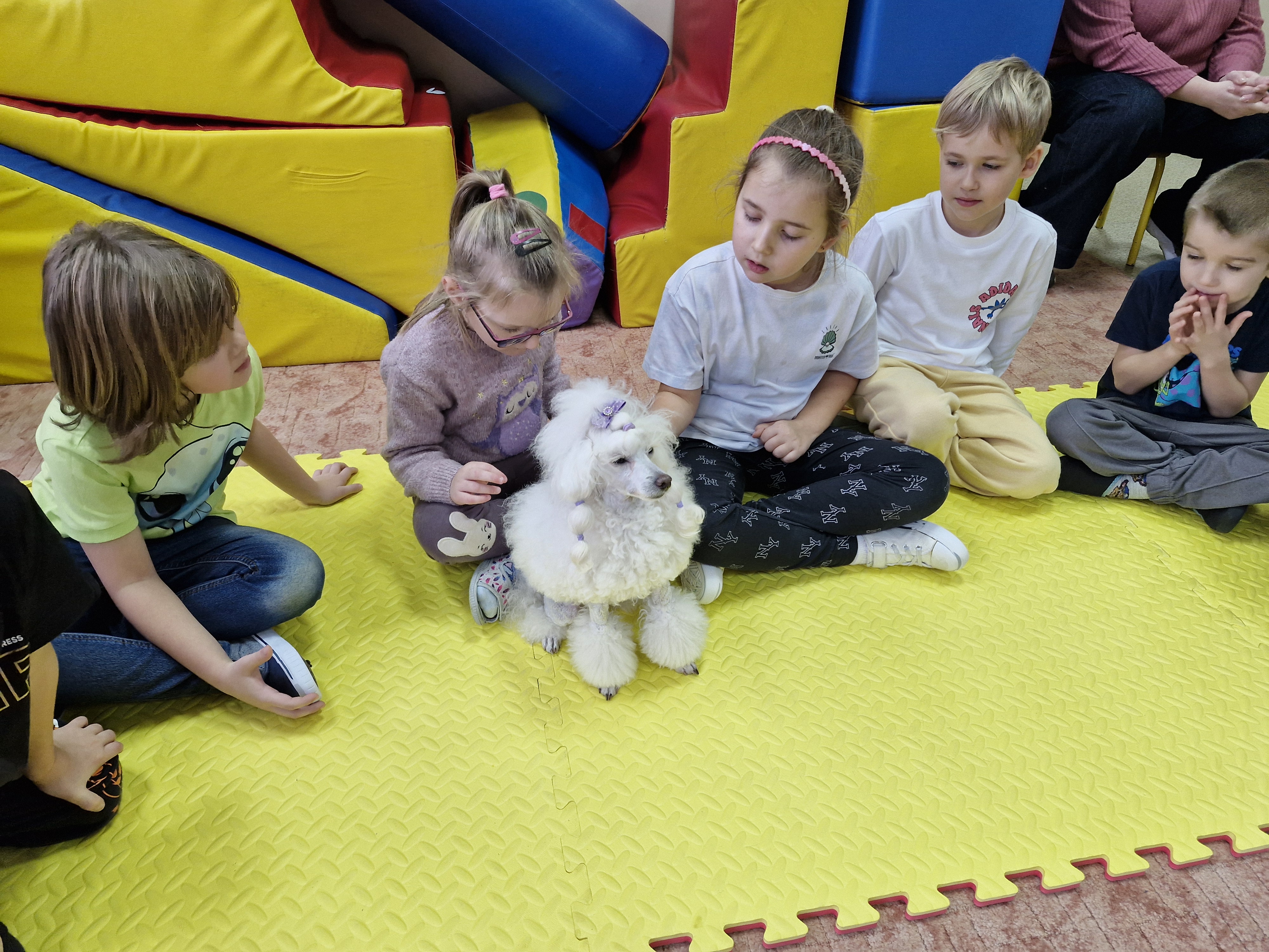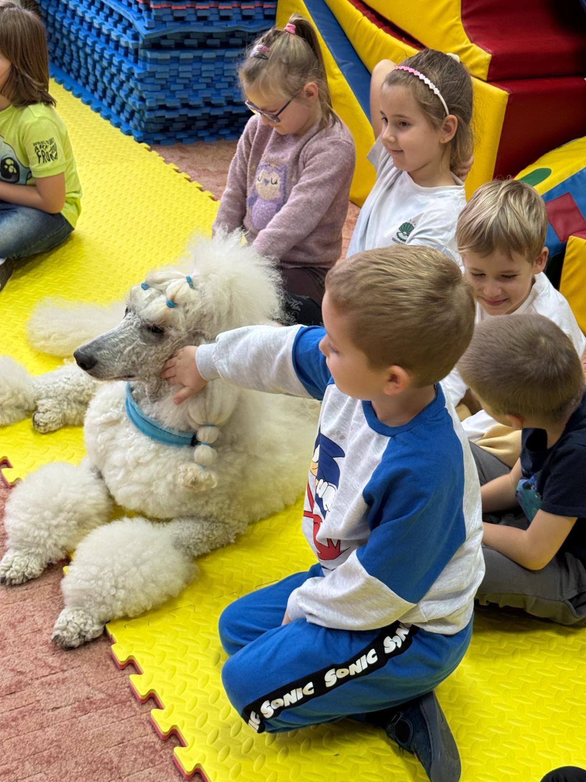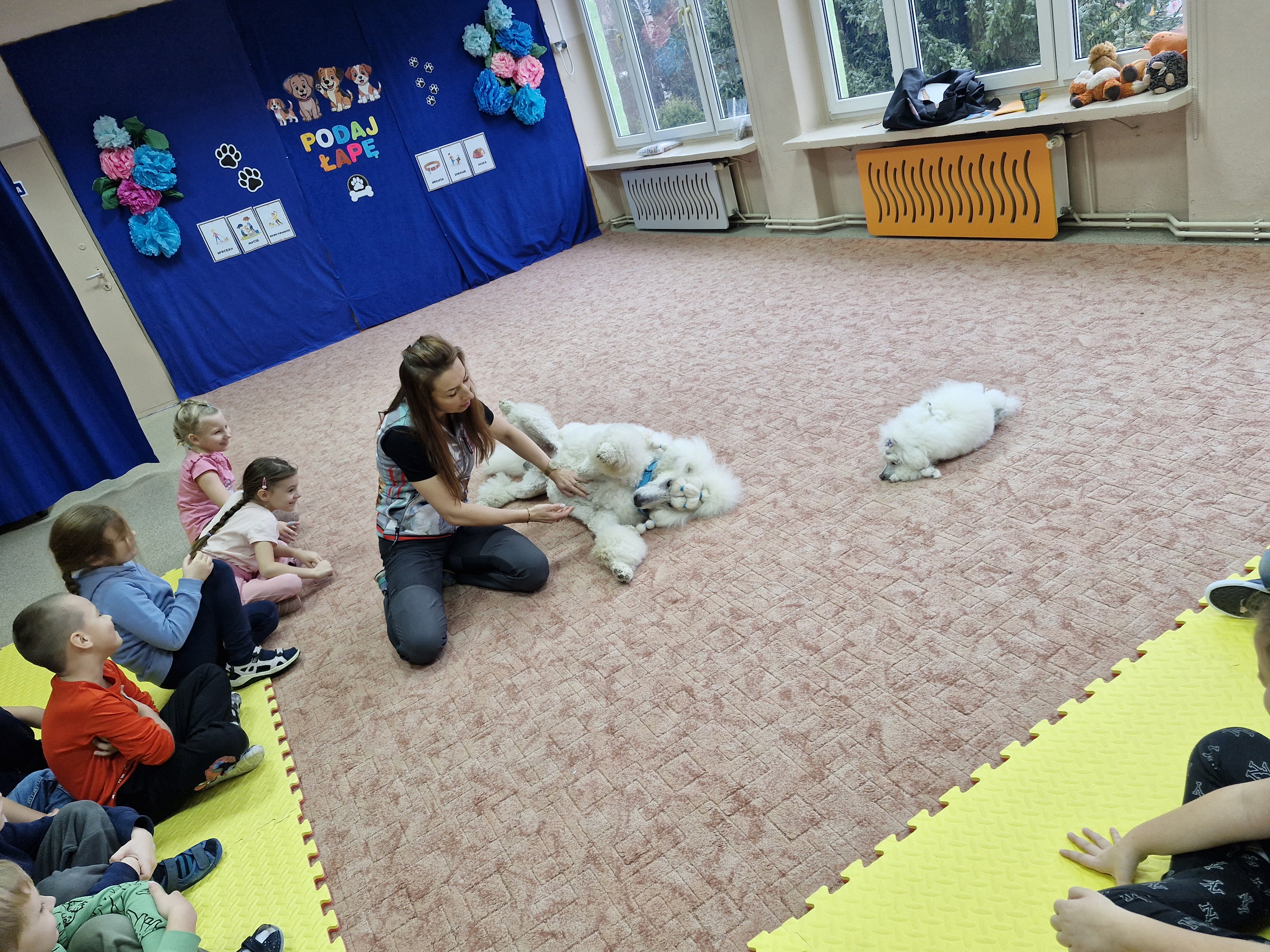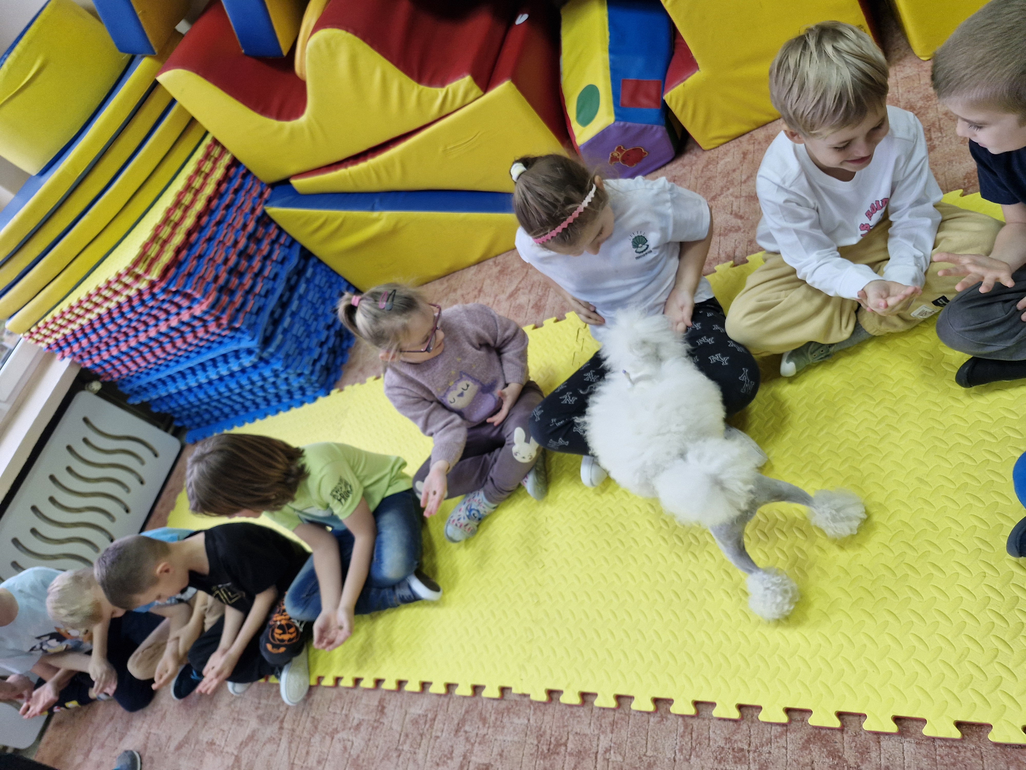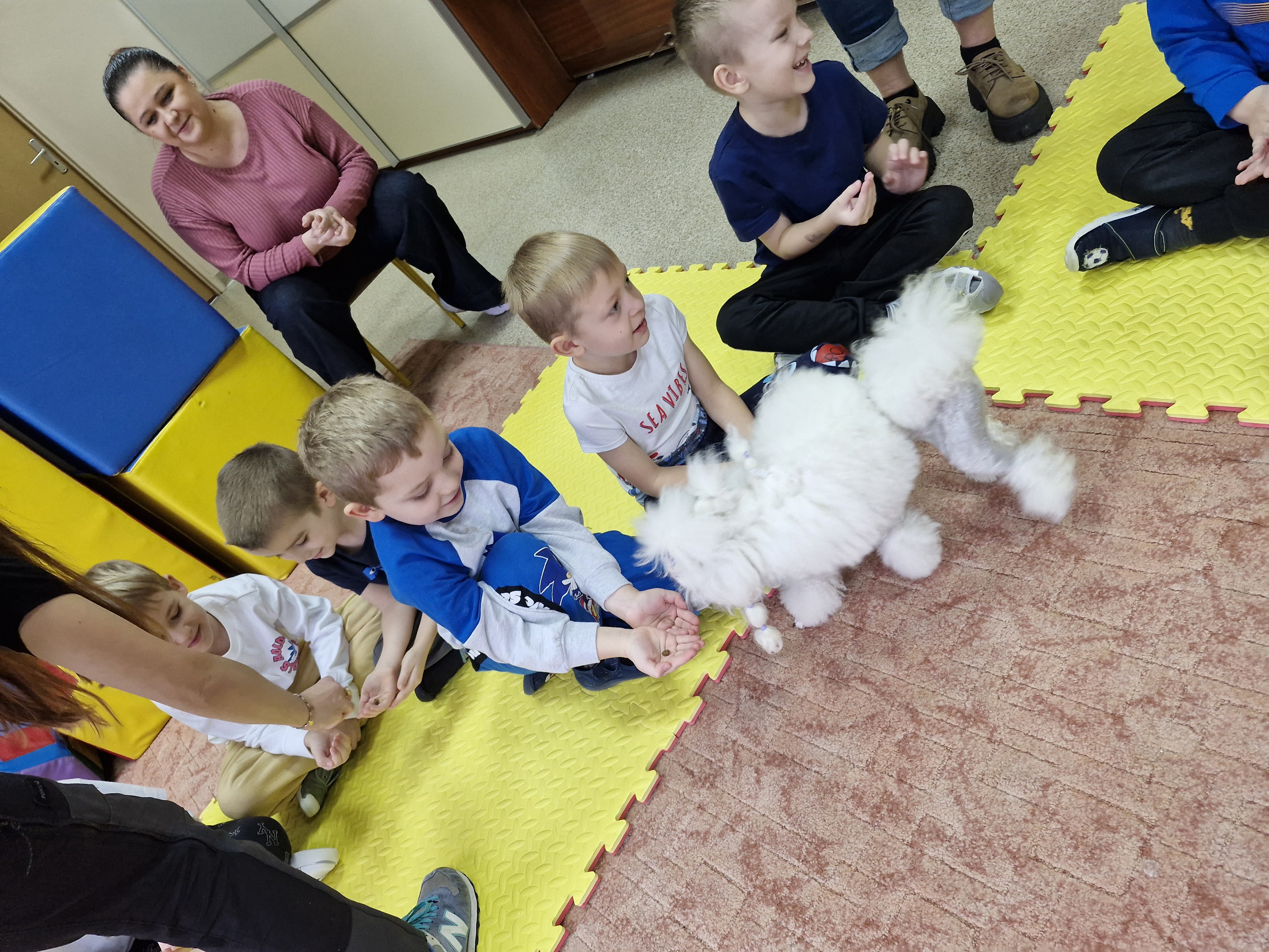 Naszymi wyjątkowymi gośćmi były urocze pieski: Lagertha, Krzysztof, Ananas oraz Scooby-Doo , które wraz z terapeutką — panią Agnieszką Adamiec — poprowadziły spotkanie w ramach programu „Podaj łapę na powitanie”.