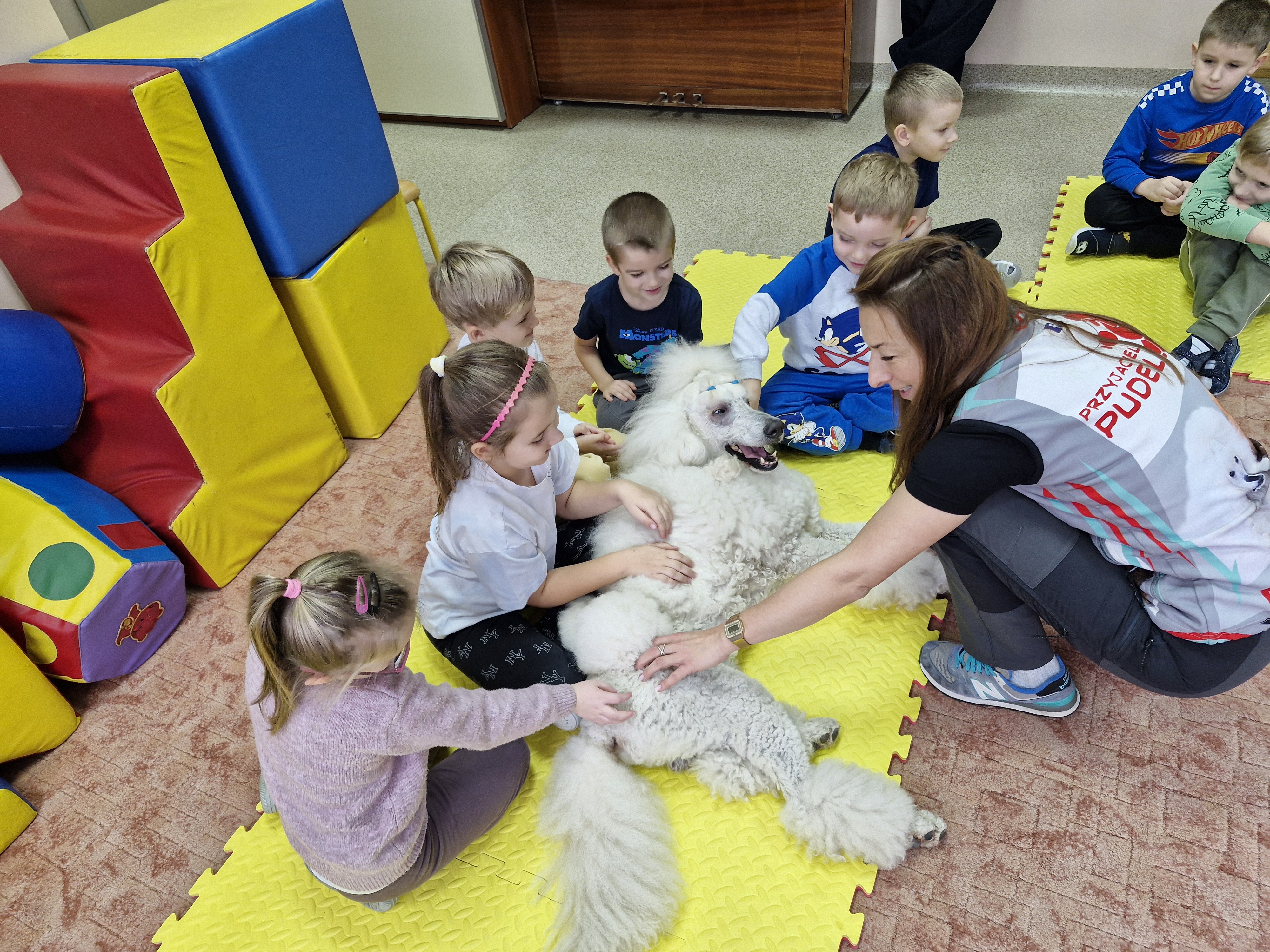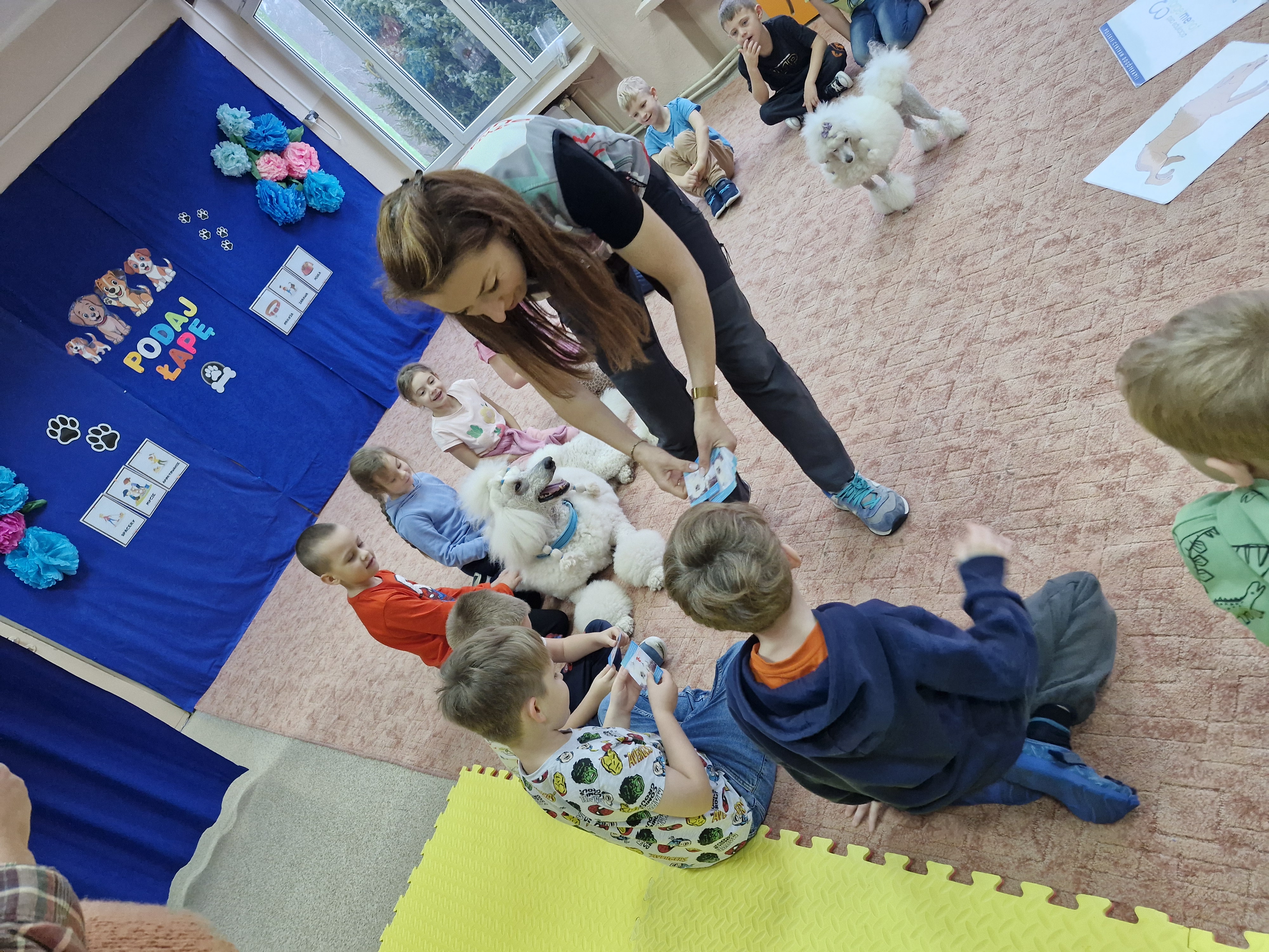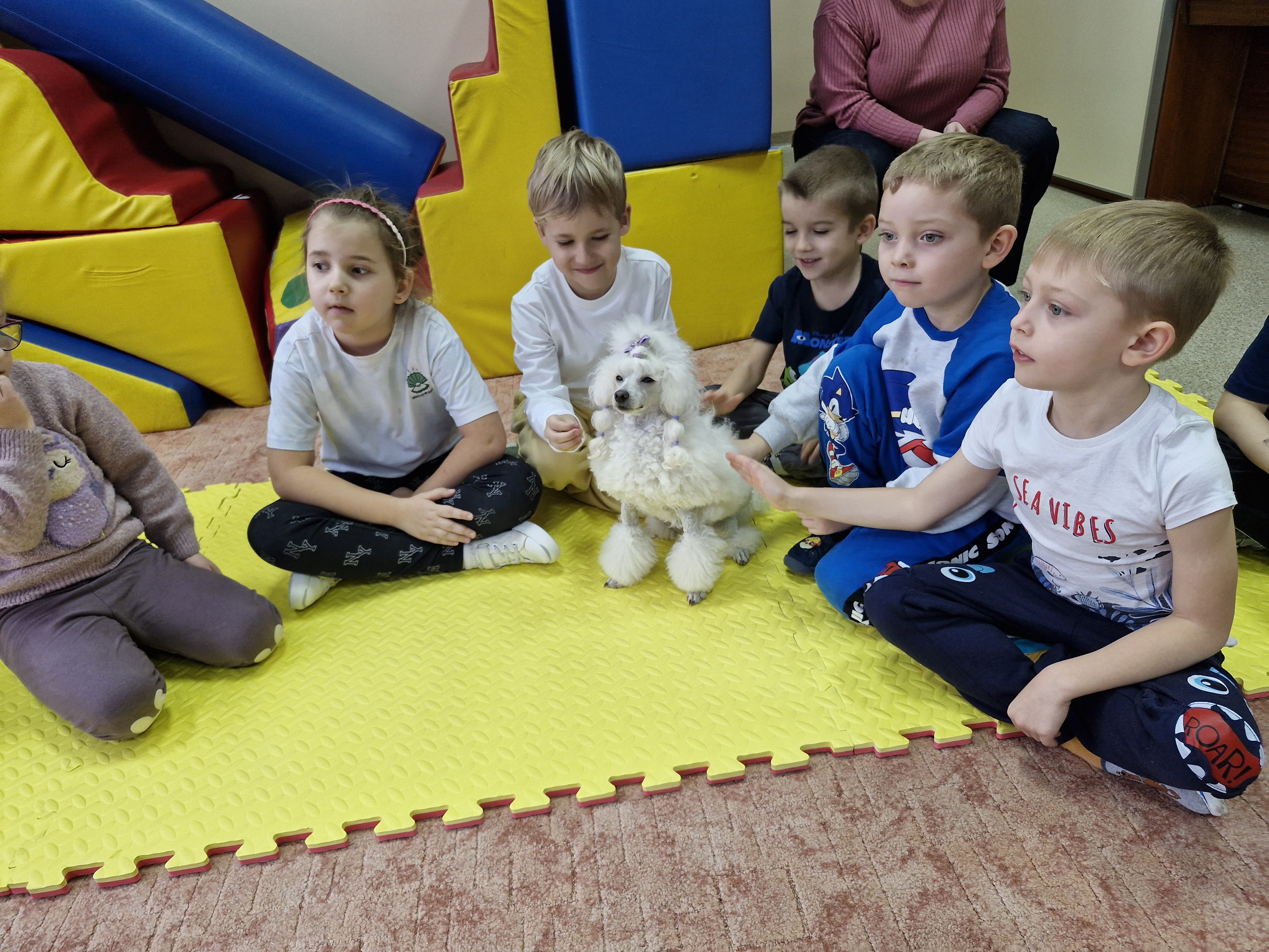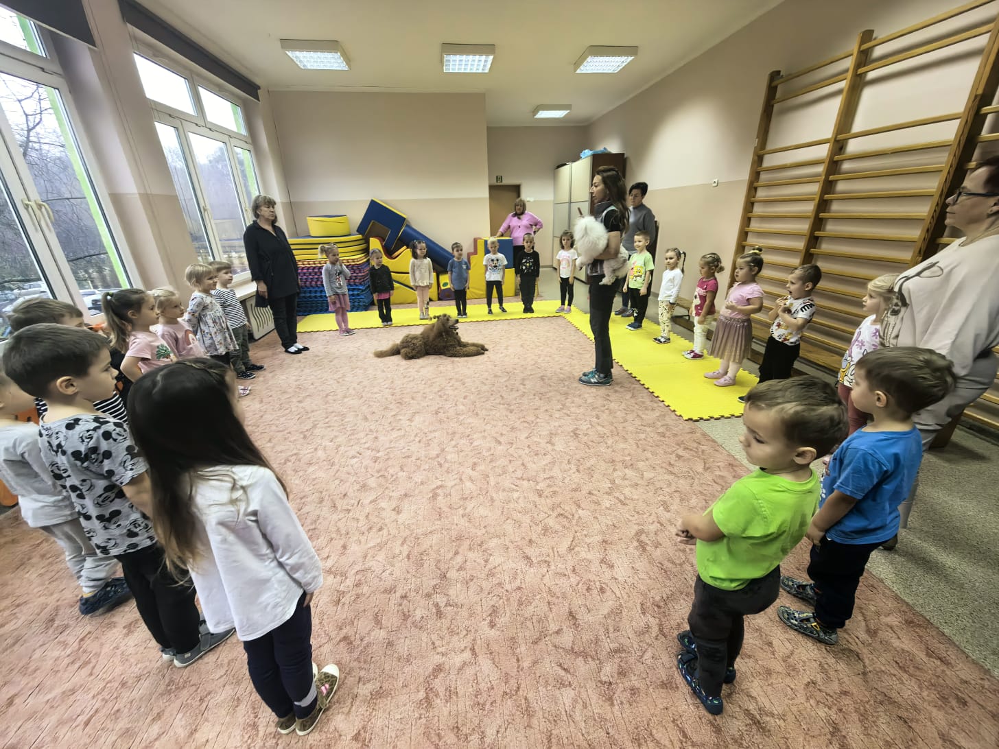 Naszymi wyjątkowymi gośćmi były urocze pieski: Lagertha, Krzysztof, Ananas oraz Scooby-Doo , które wraz z terapeutką — panią Agnieszką Adamiec — poprowadziły spotkanie w ramach programu „Podaj łapę na powitanie”.