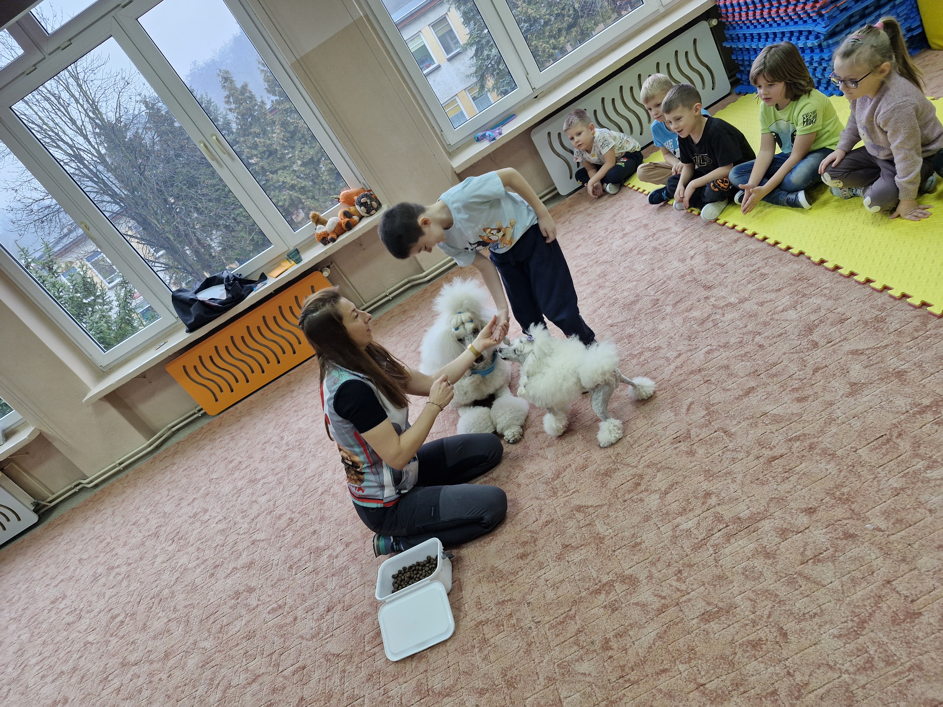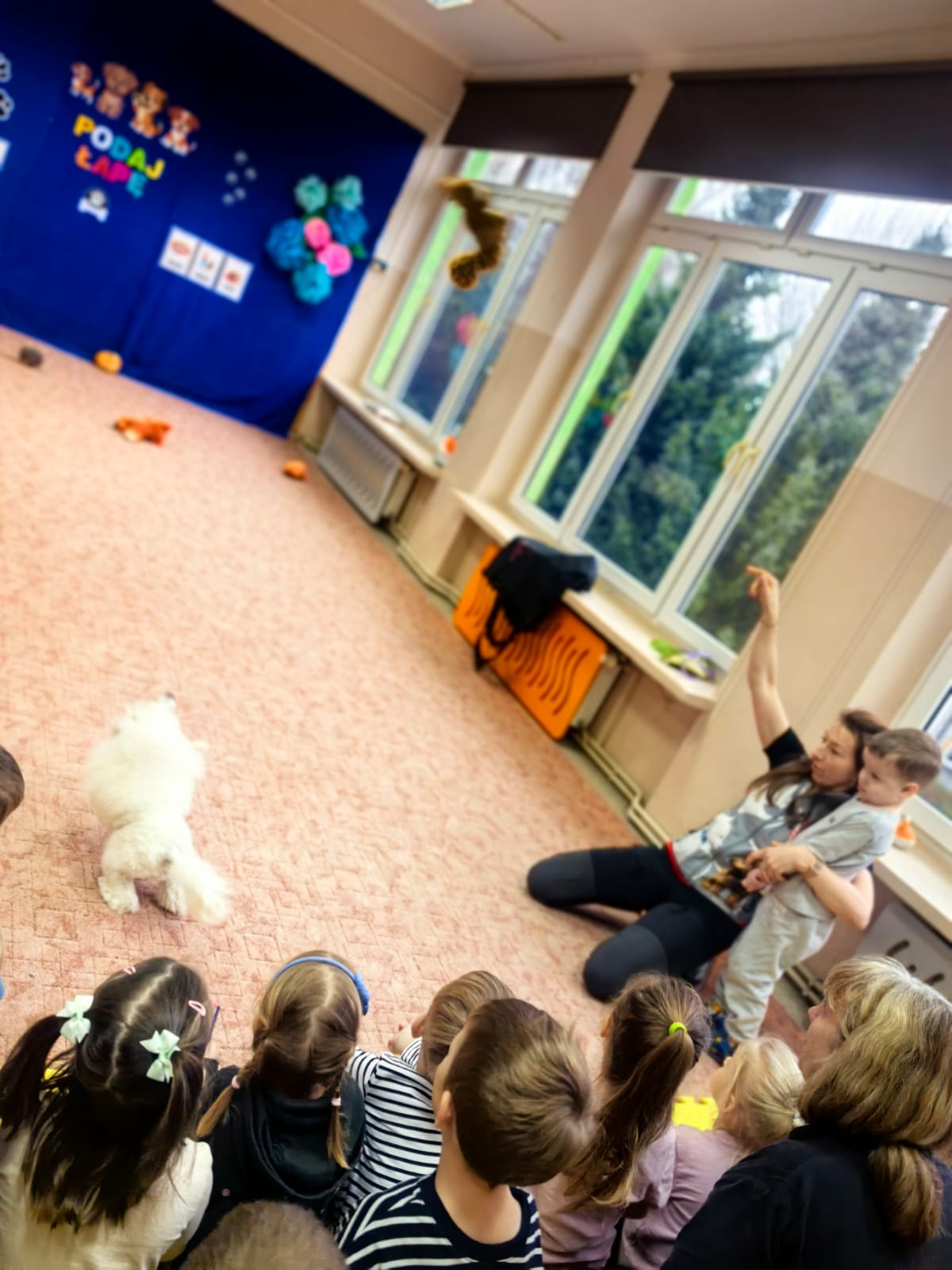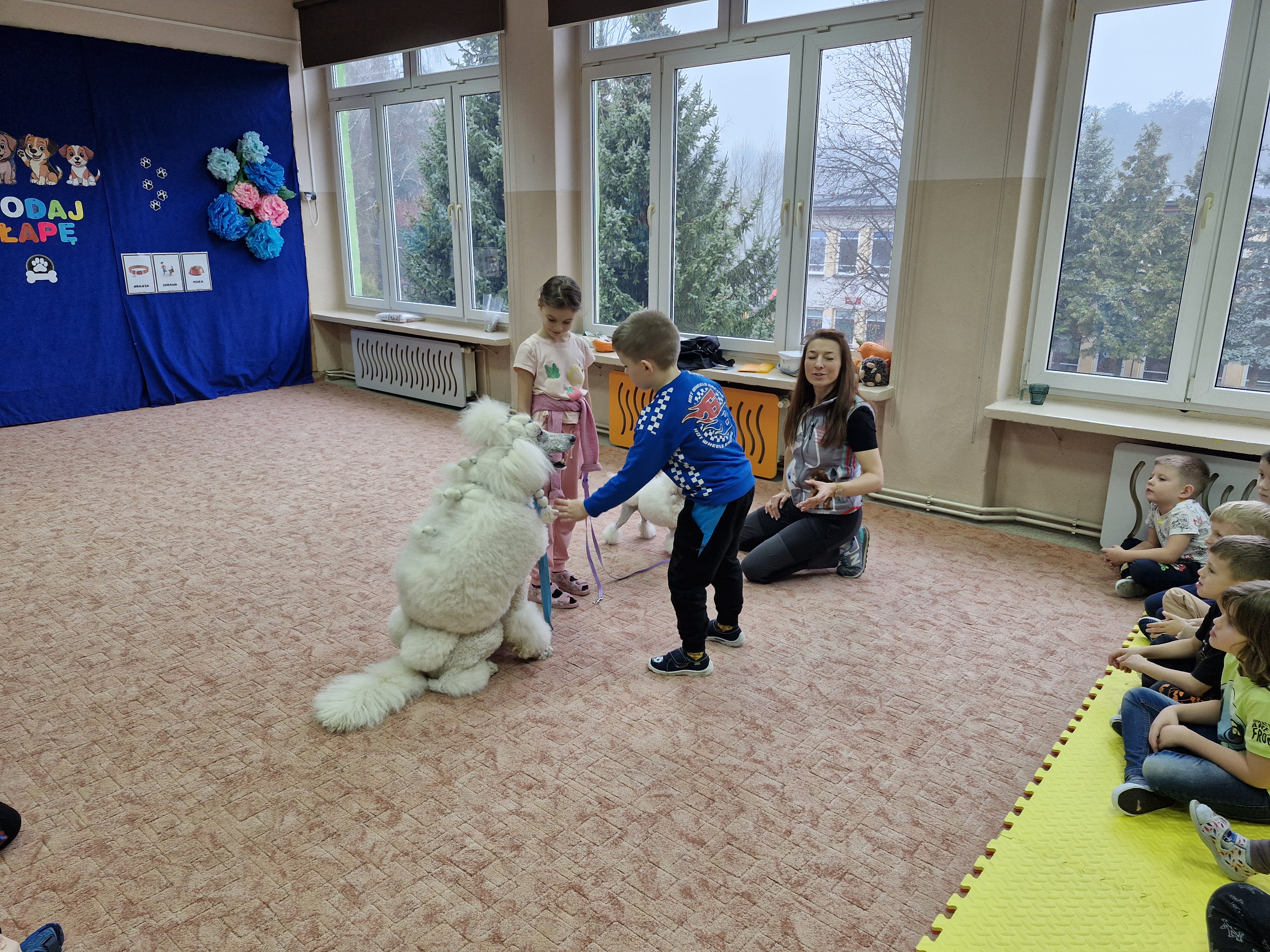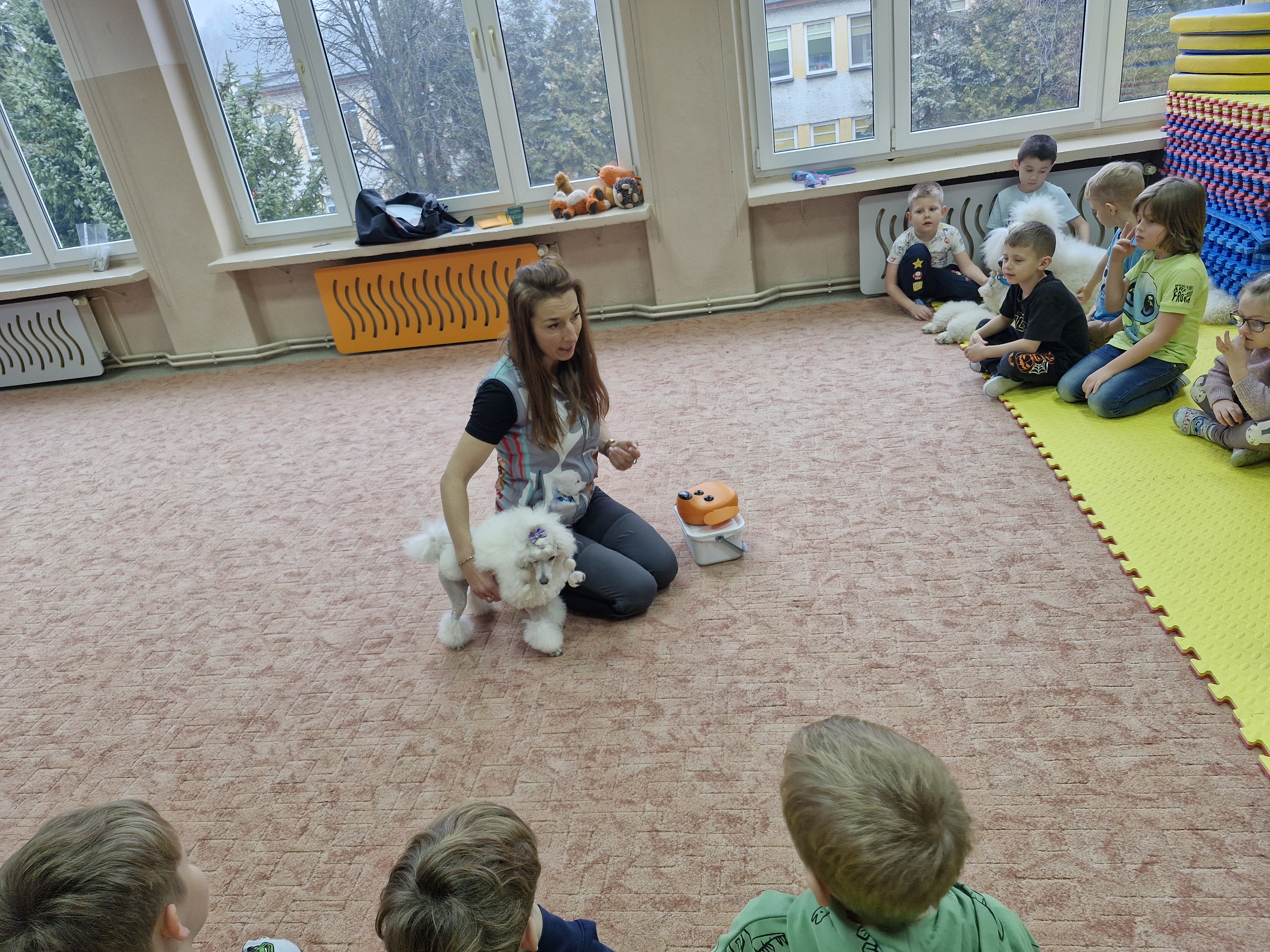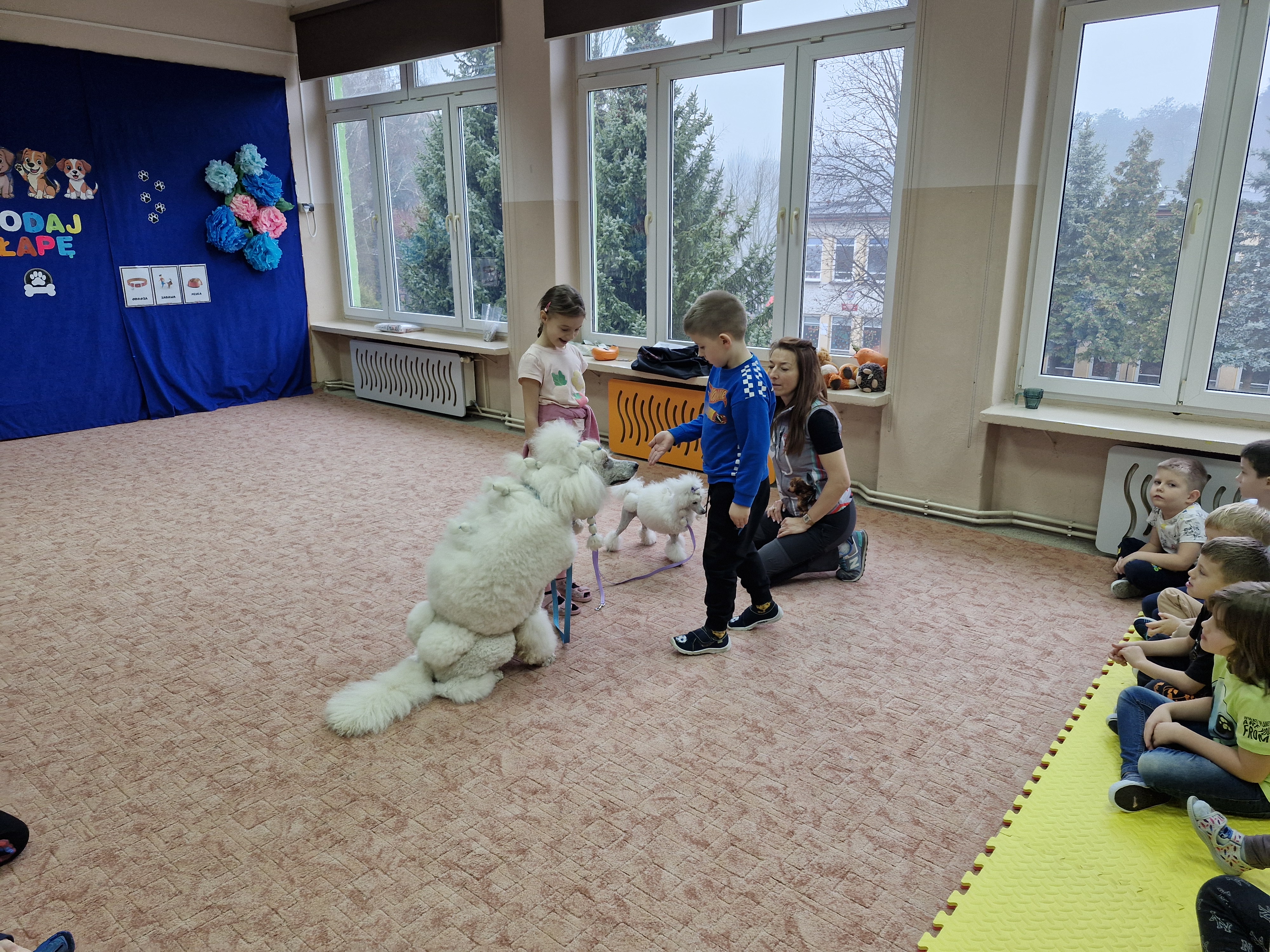 Naszymi wyjątkowymi gośćmi były urocze pieski: Lagertha, Krzysztof, Ananas oraz Scooby-Doo , które wraz z terapeutką — panią Agnieszką Adamiec — poprowadziły spotkanie w ramach programu „Podaj łapę na powitanie”.