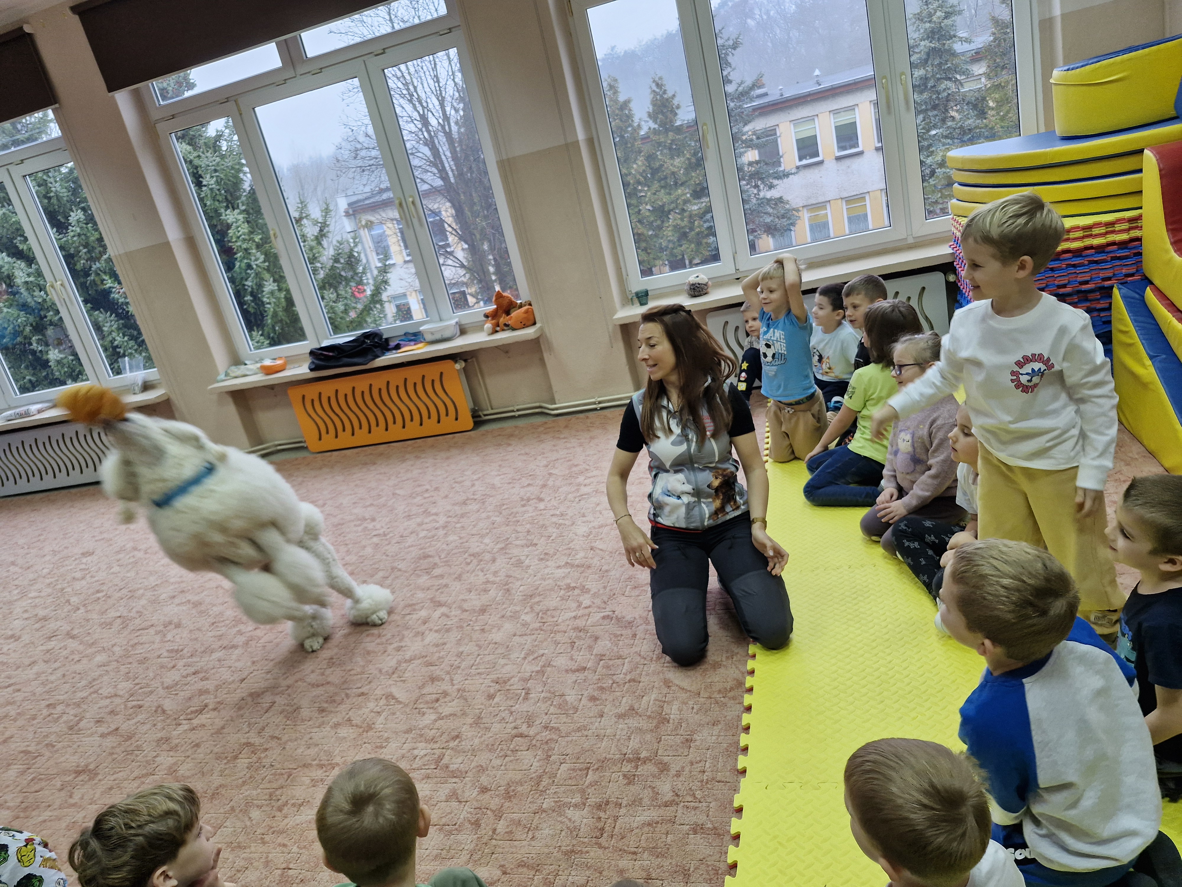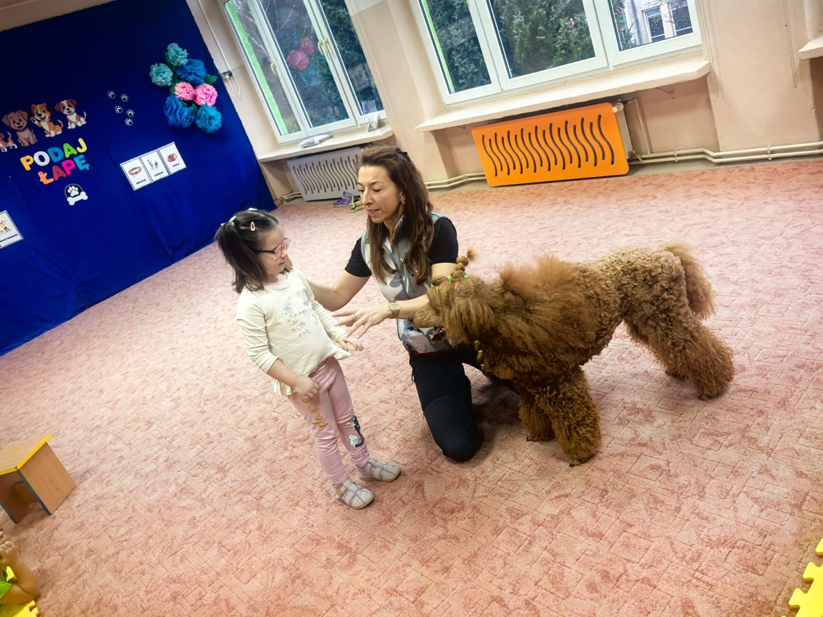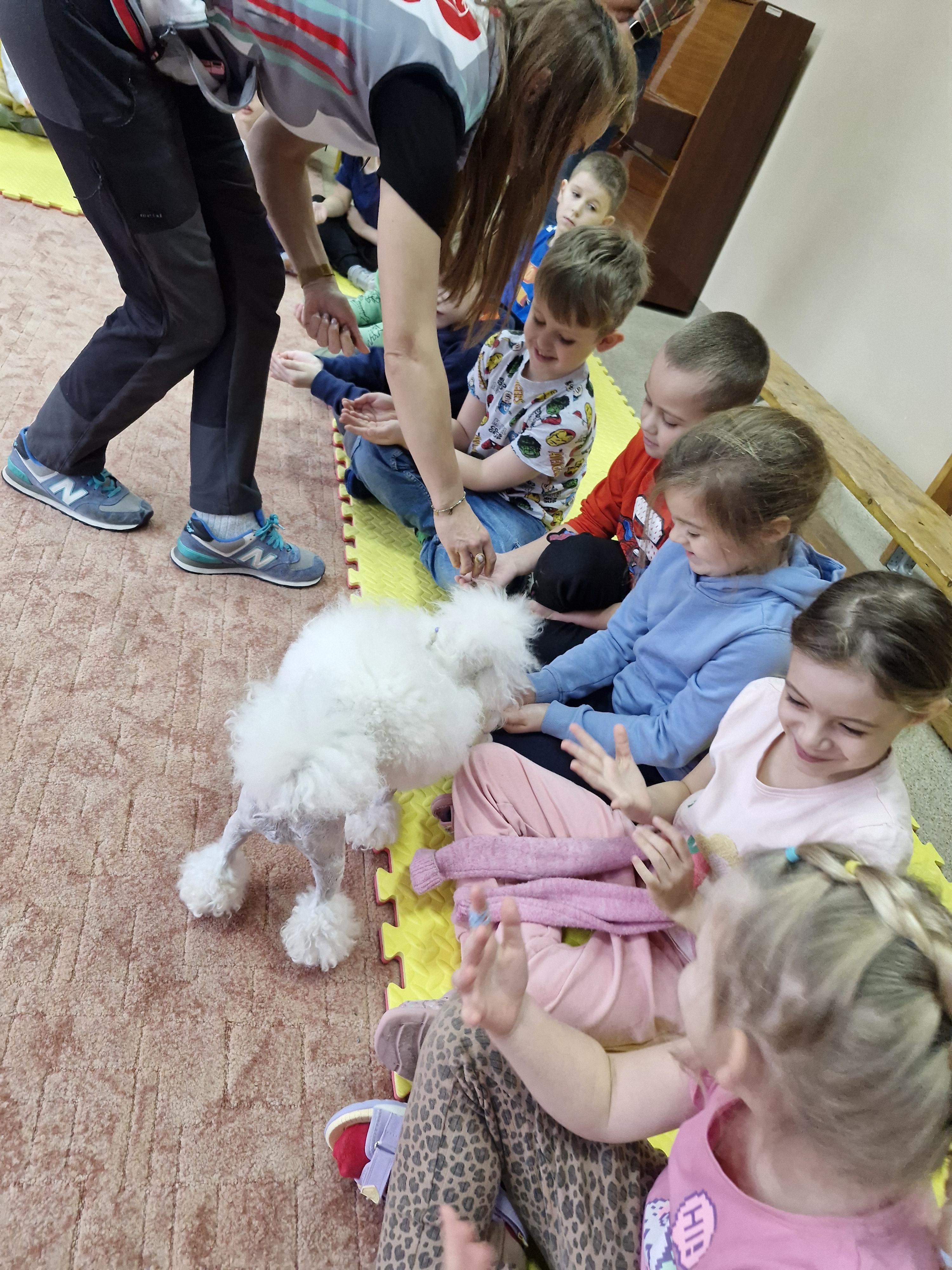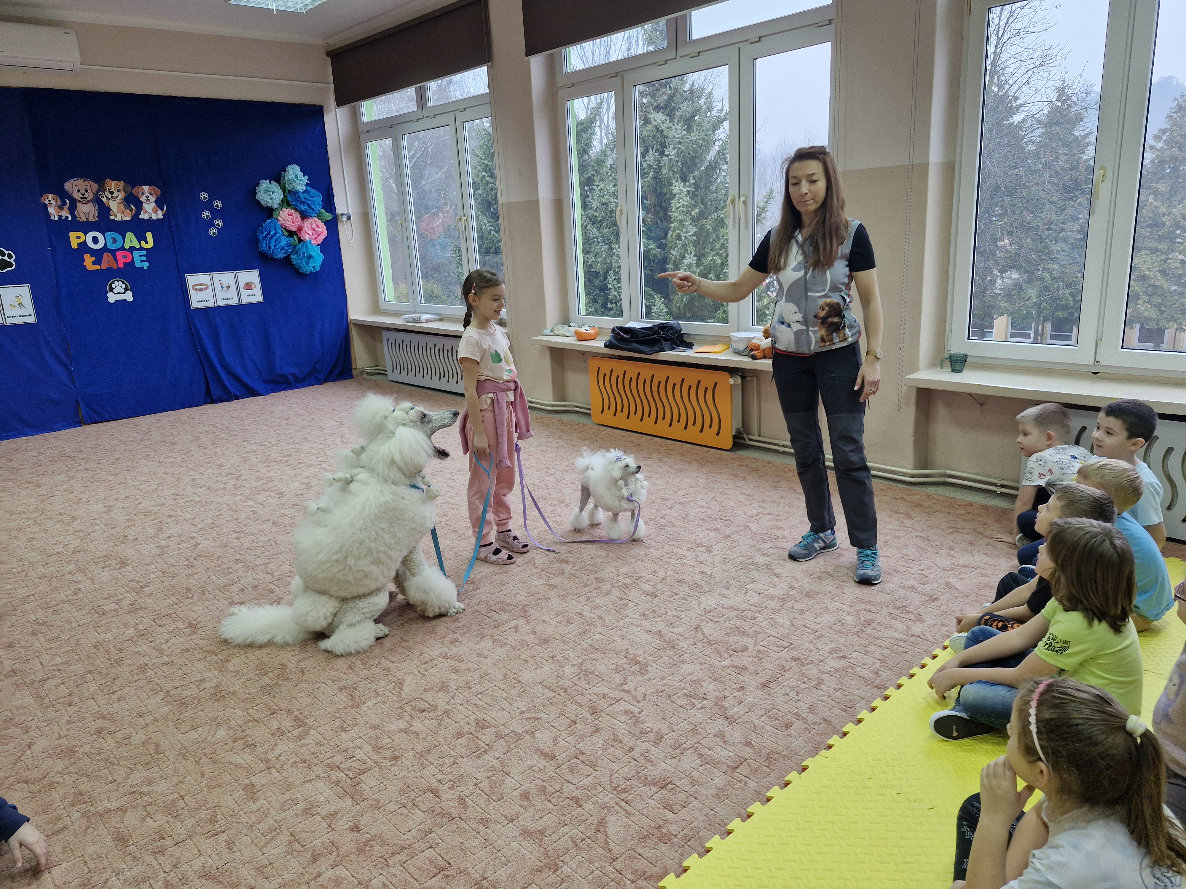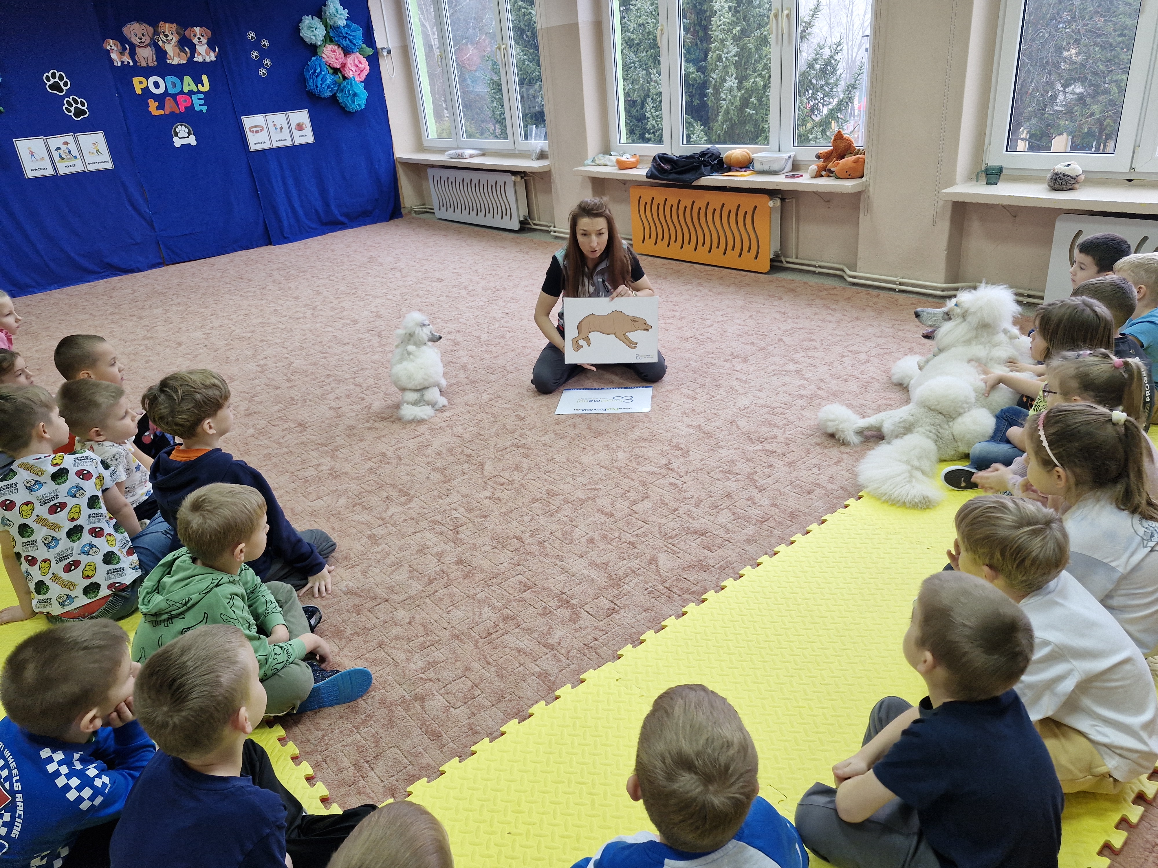 Naszymi wyjątkowymi gośćmi były urocze pieski: Lagertha, Krzysztof, Ananas oraz Scooby-Doo , które wraz z terapeutką — panią Agnieszką Adamiec — poprowadziły spotkanie w ramach programu „Podaj łapę na powitanie”.