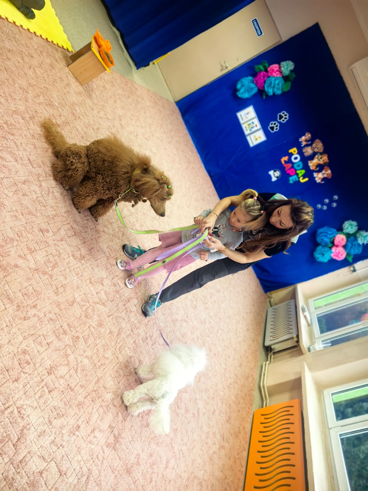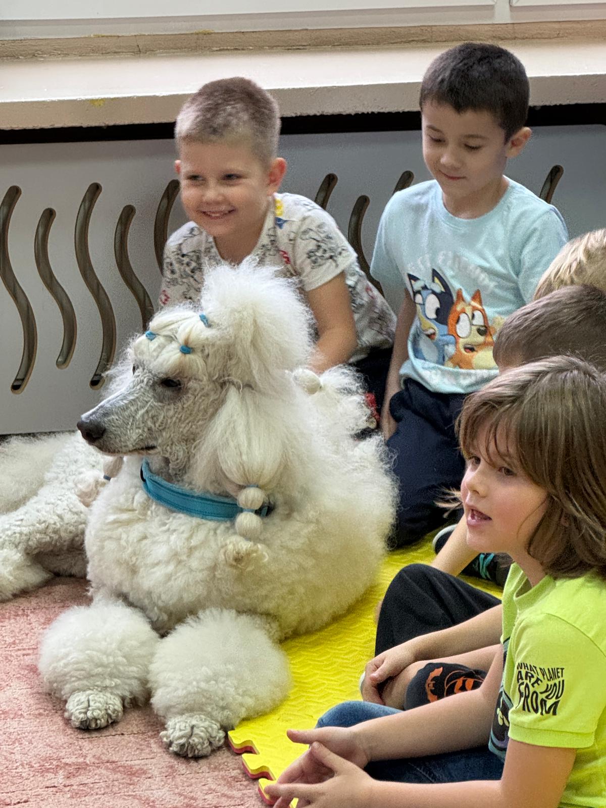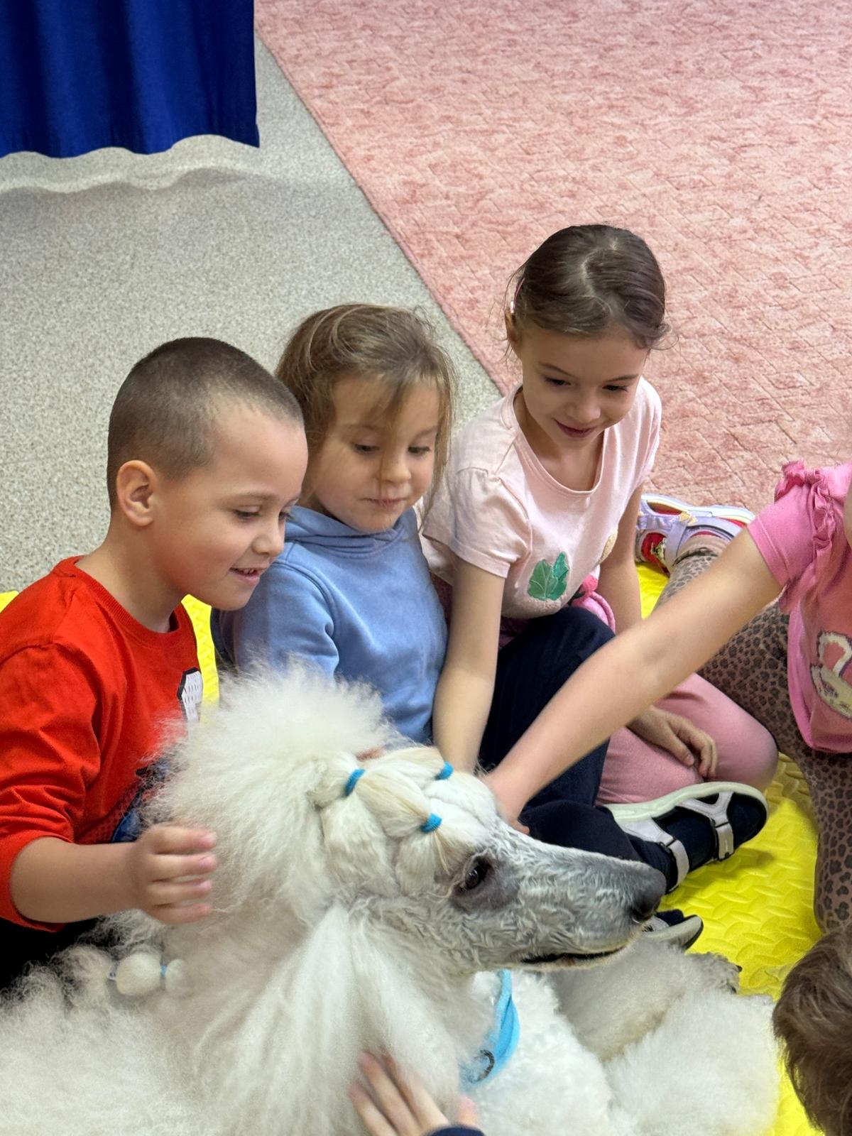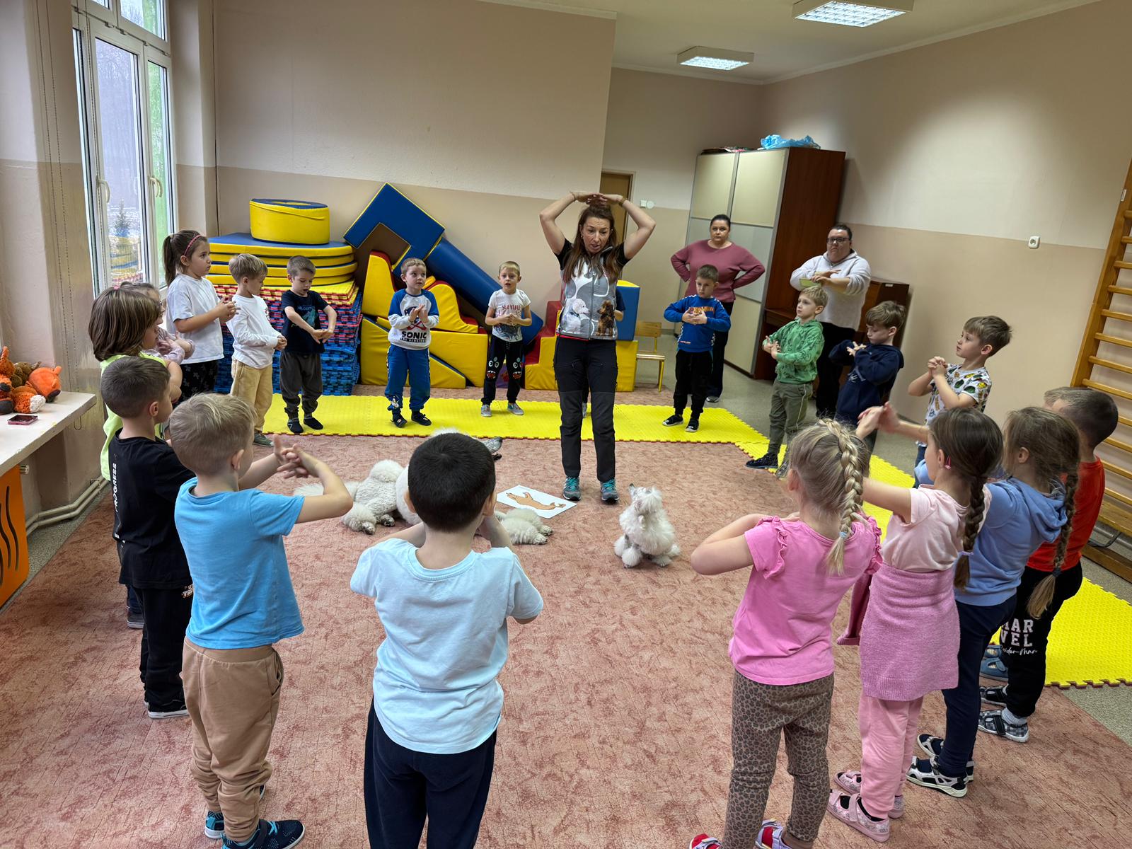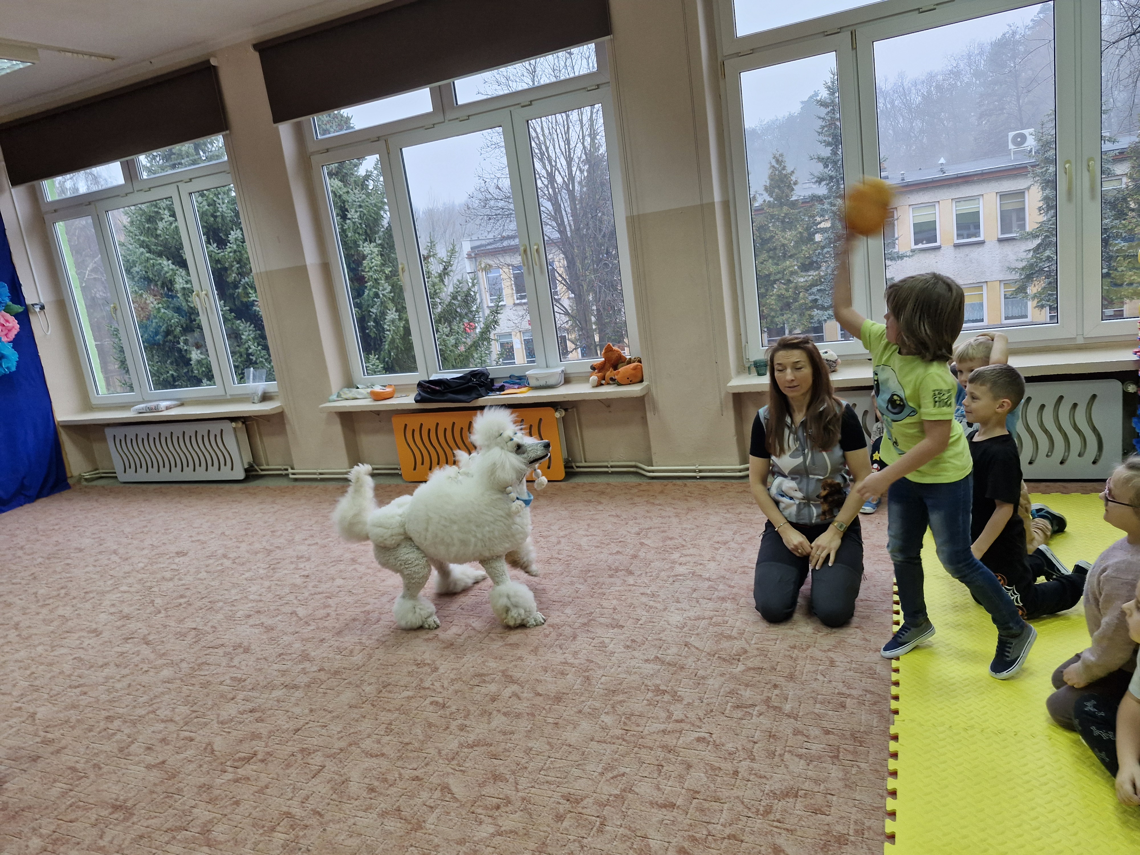 Naszymi wyjątkowymi gośćmi były urocze pieski: Lagertha, Krzysztof, Ananas oraz Scooby-Doo , które wraz z terapeutką — panią Agnieszką Adamiec — poprowadziły spotkanie w ramach programu „Podaj łapę na powitanie”.