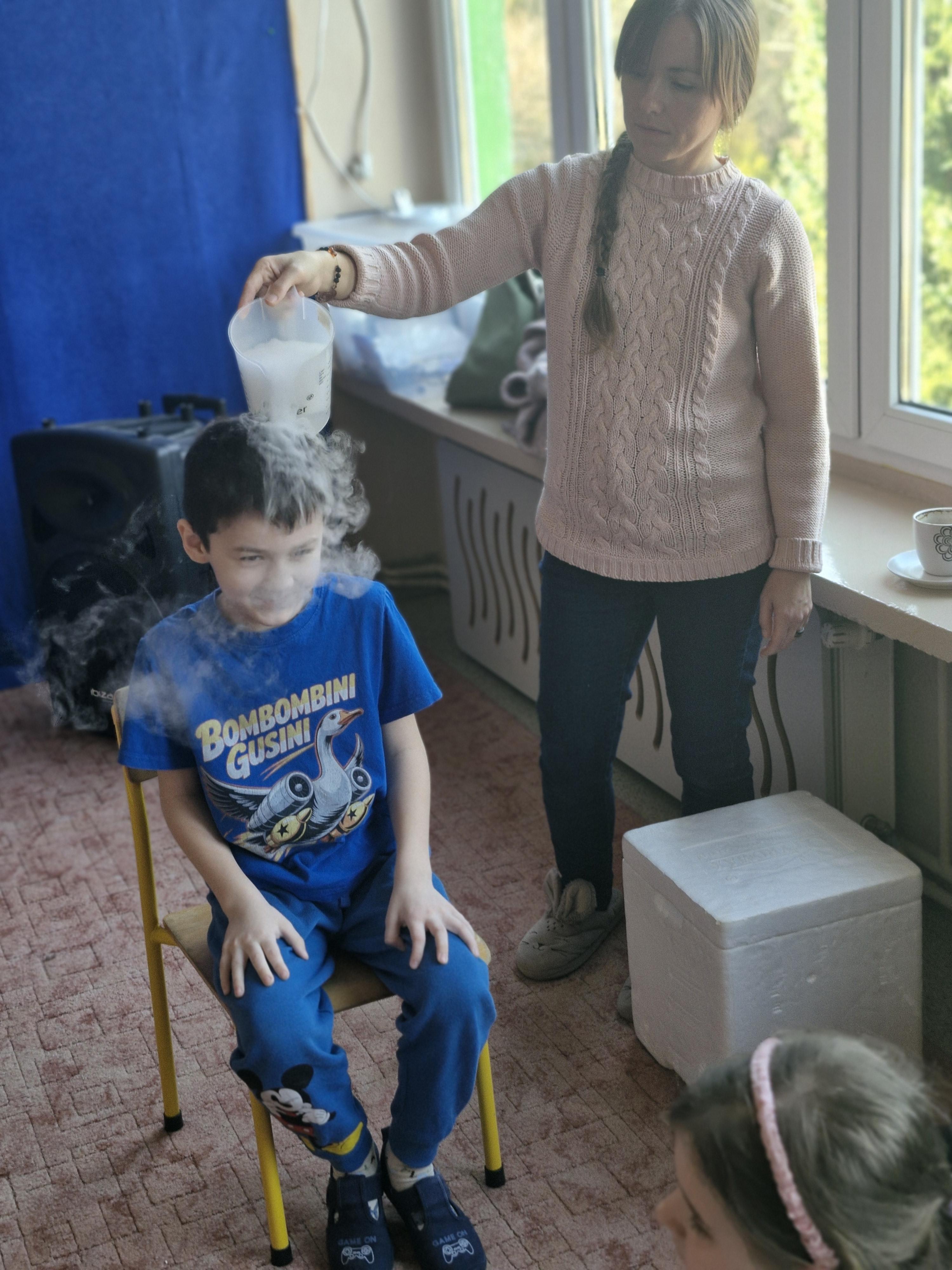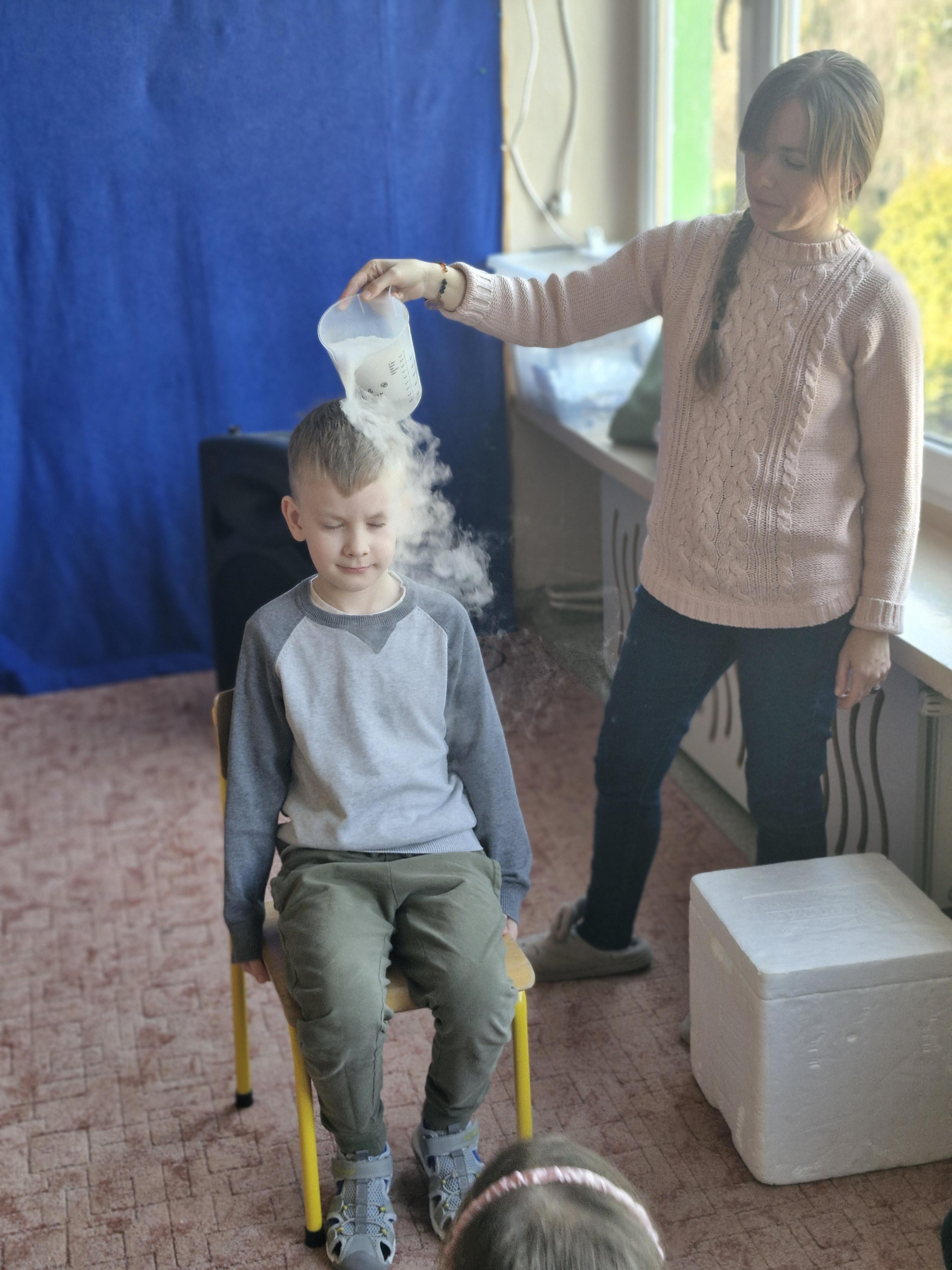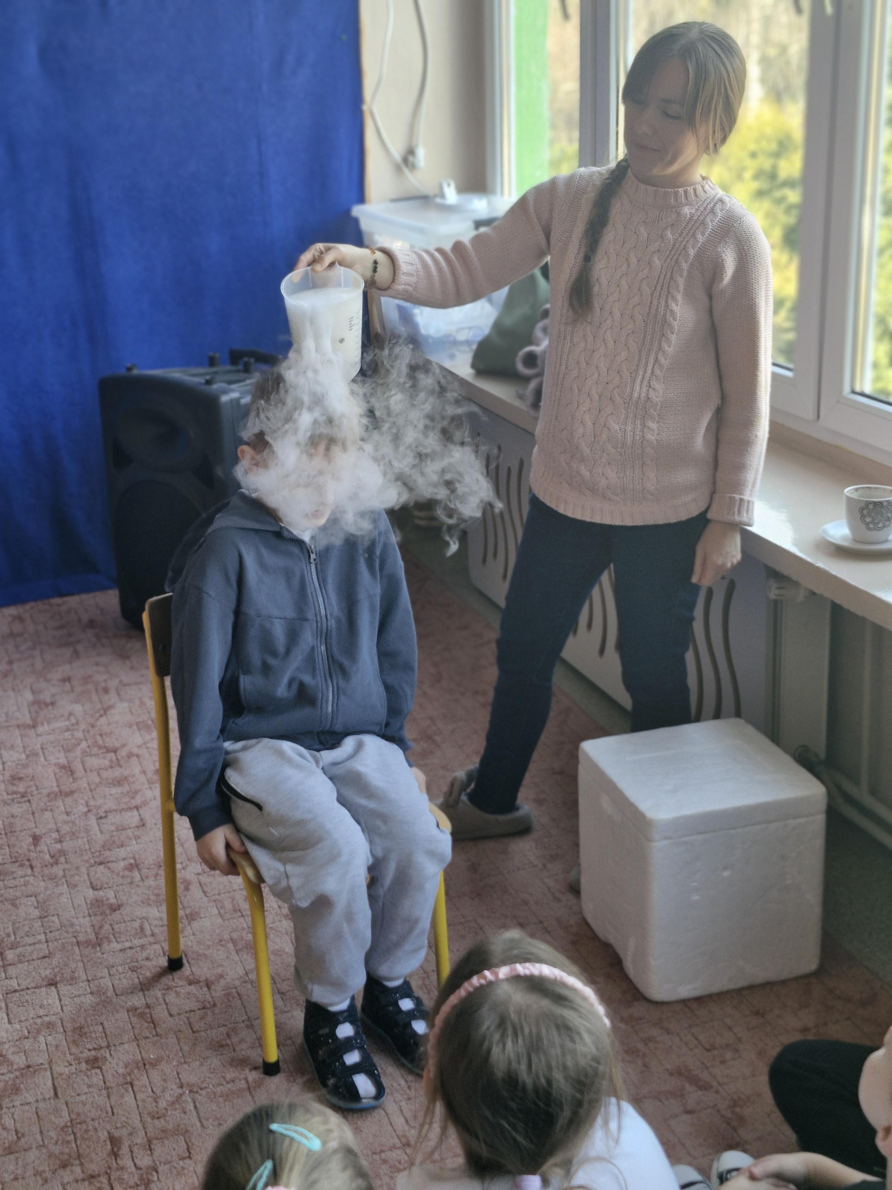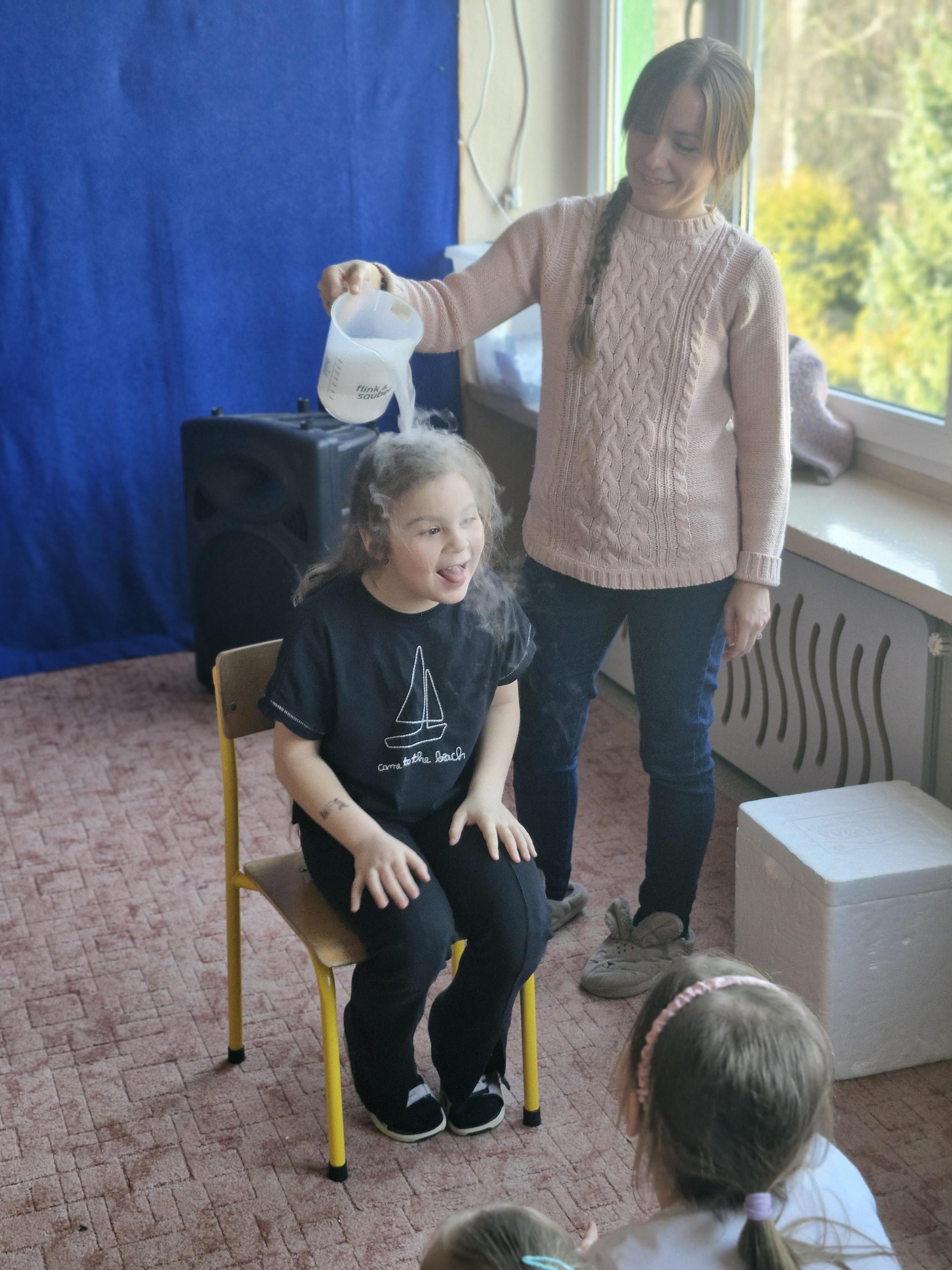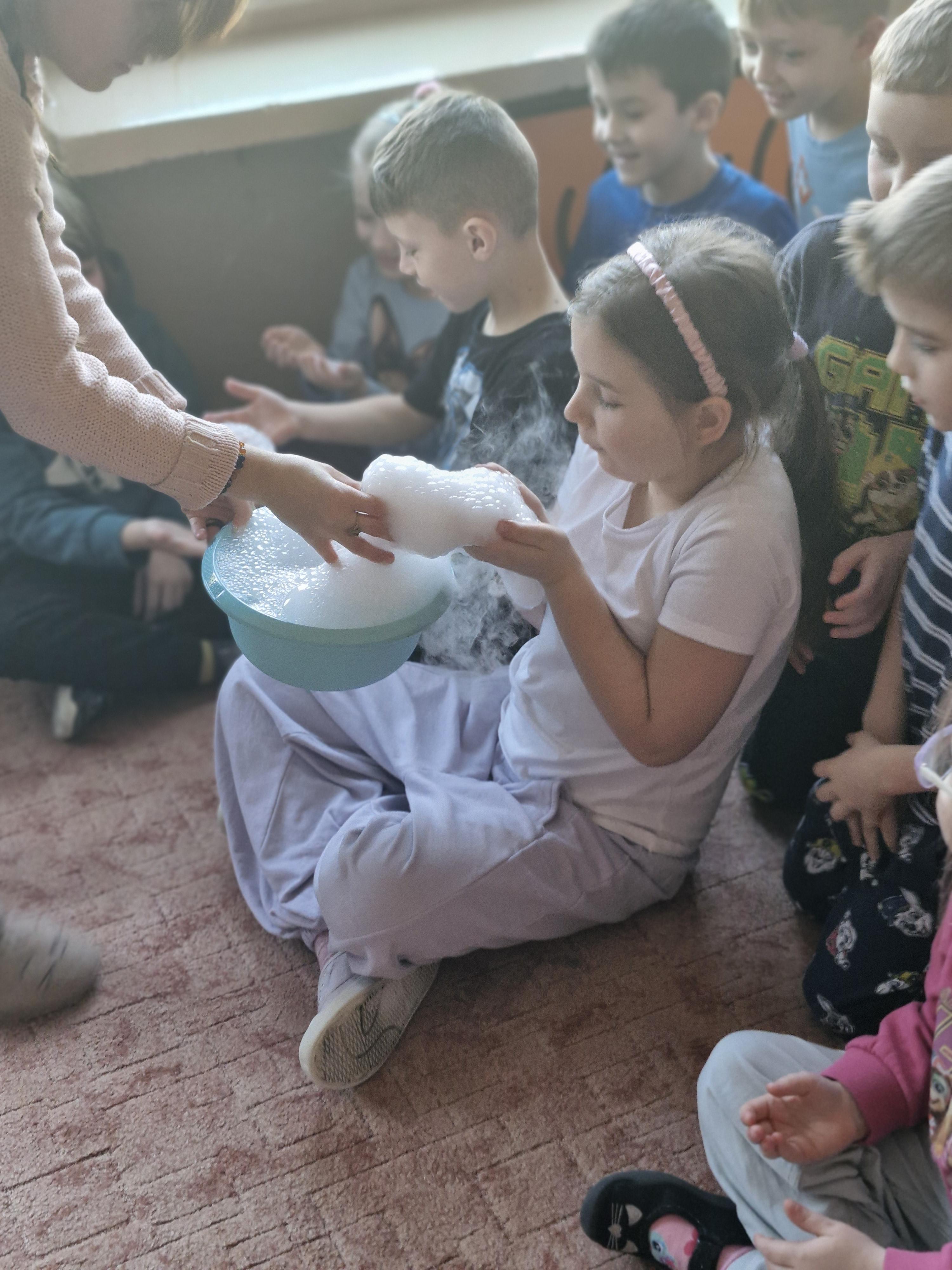 Dzieci z zachwytem obserwowały, jak po połączeniu suchego lodu z wodą powstaje gęsty dym, a po dodaniu płynu tworzy się niezwykła, unosząca się piana . Wyglądało to jak prawdziwa magiczna mikstura!