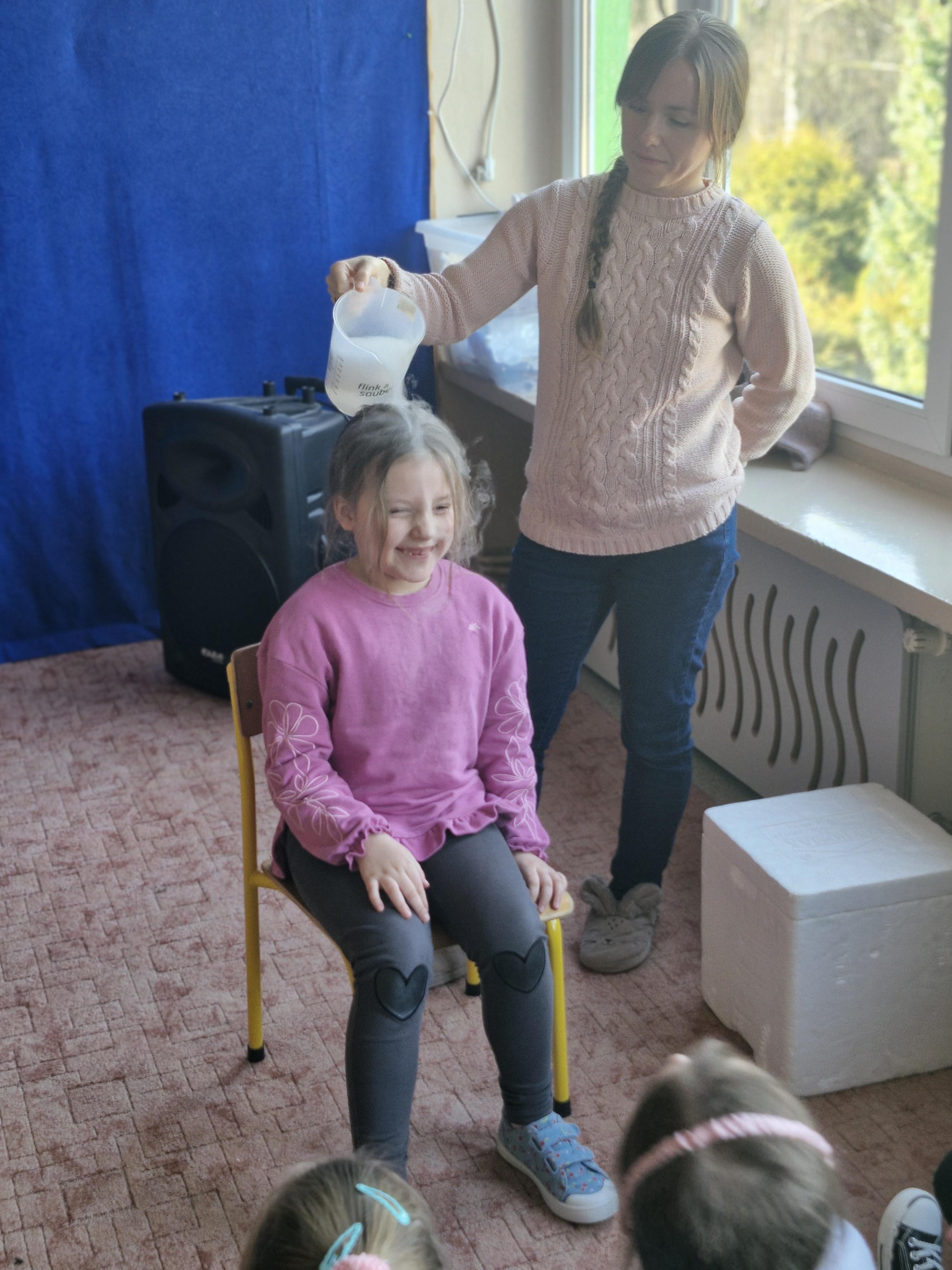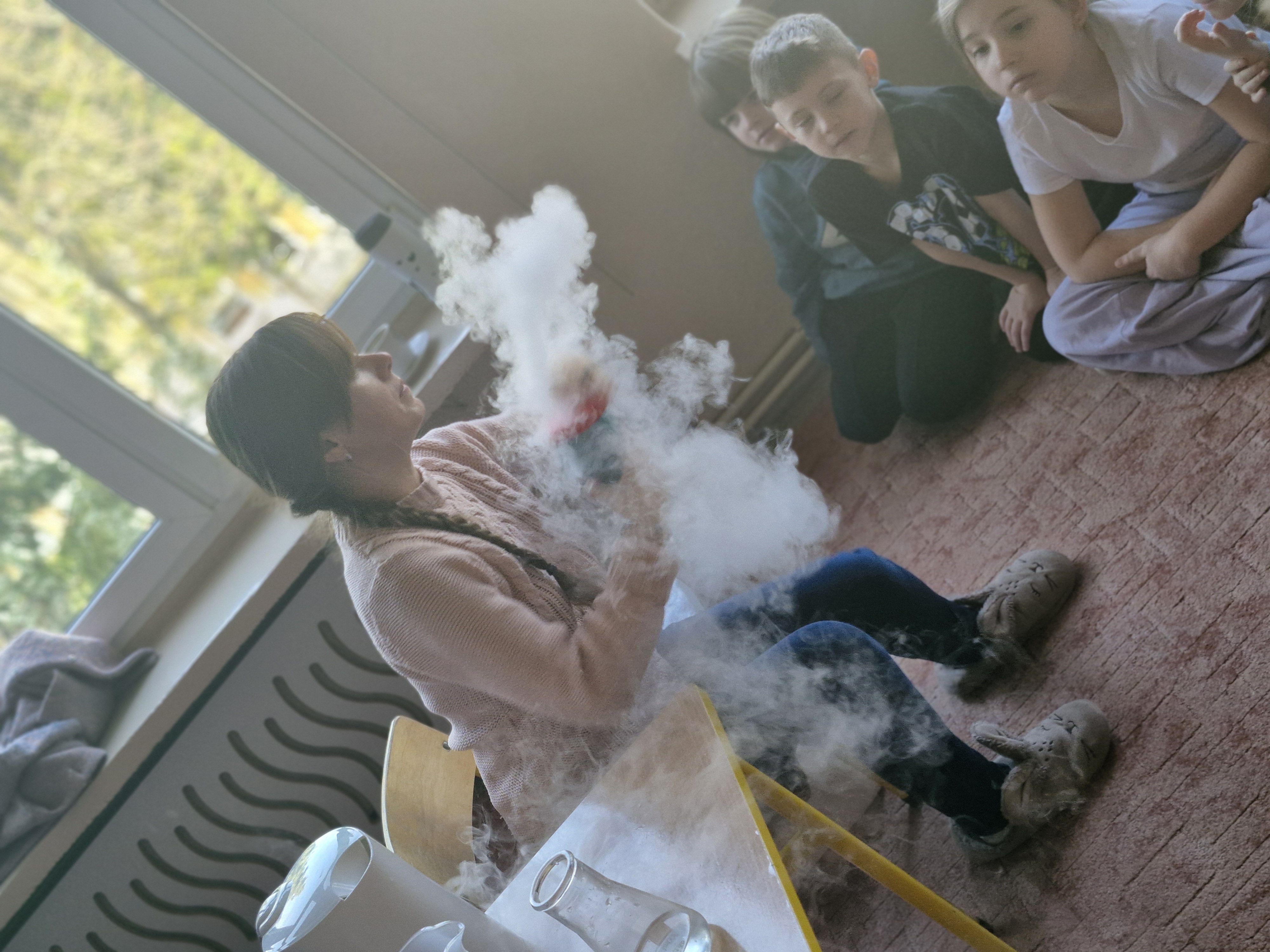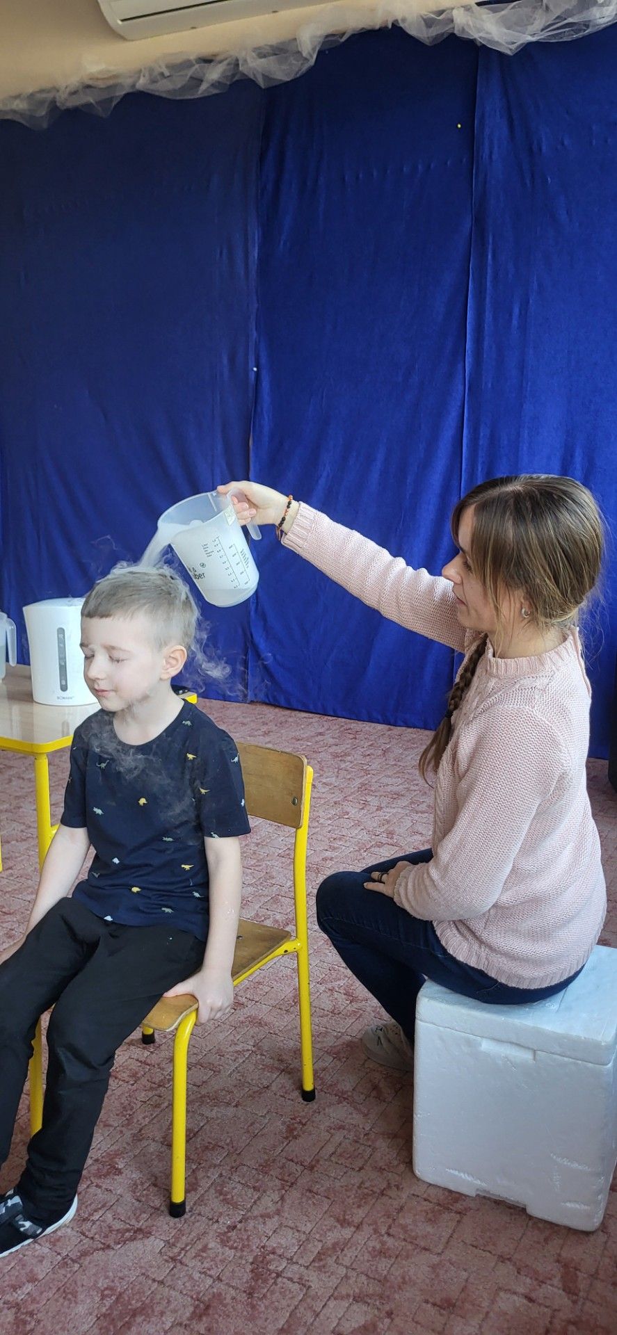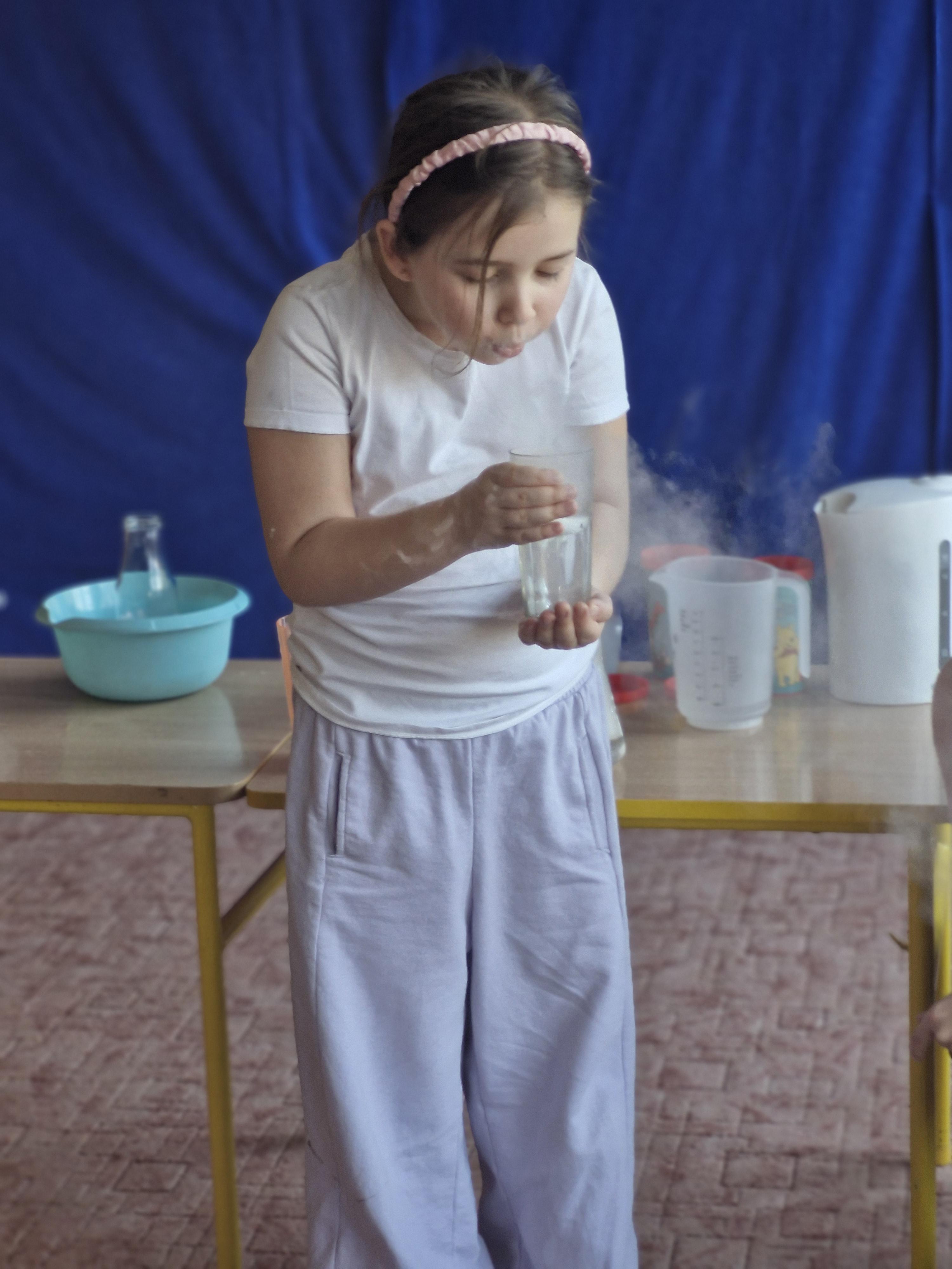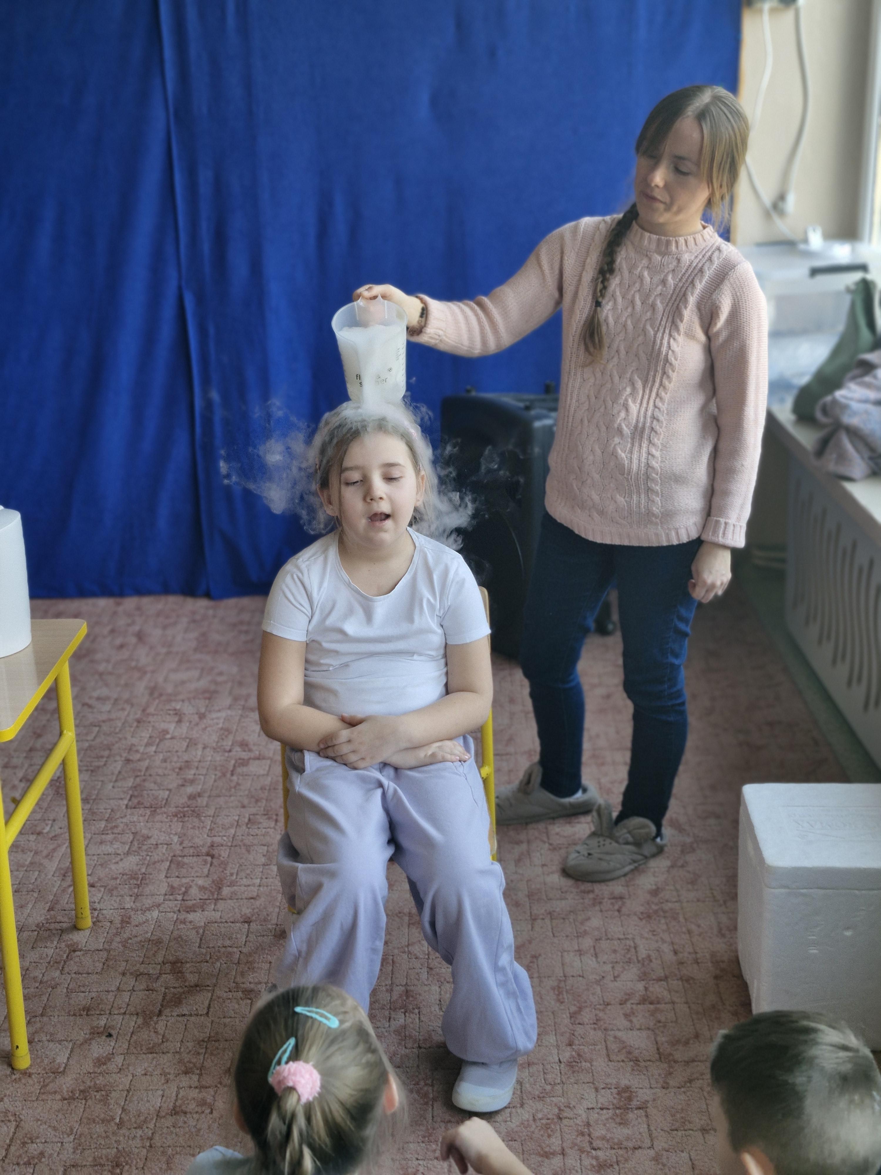 Dzieci z zachwytem obserwowały, jak po połączeniu suchego lodu z wodą powstaje gęsty dym, a po dodaniu płynu tworzy się niezwykła, unosząca się piana . Wyglądało to jak prawdziwa magiczna mikstura!