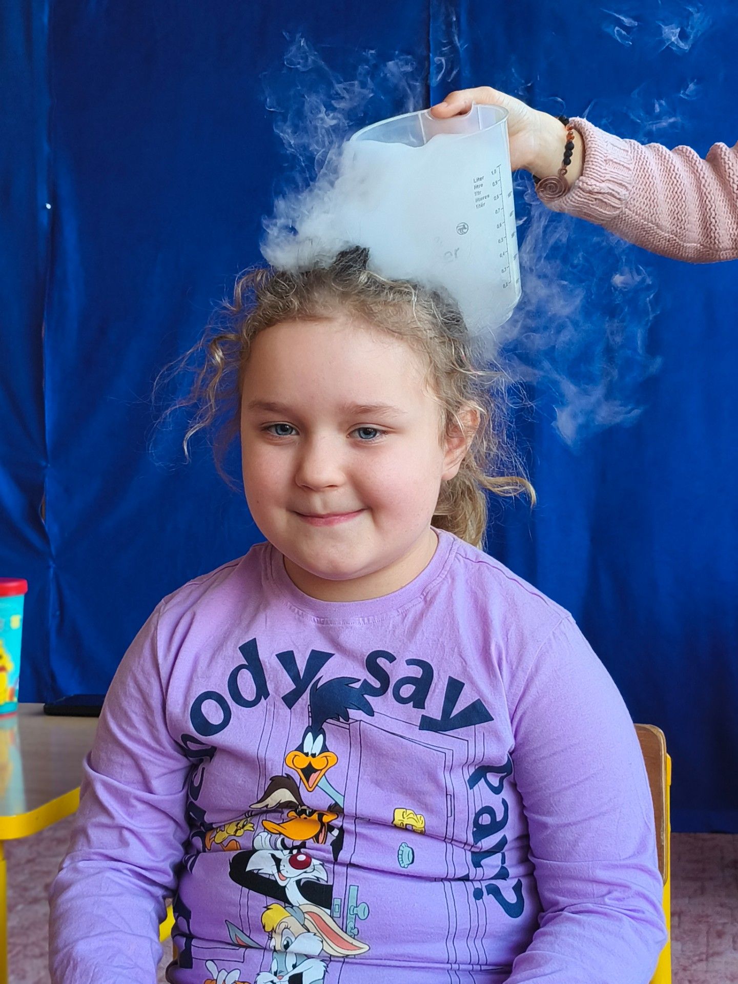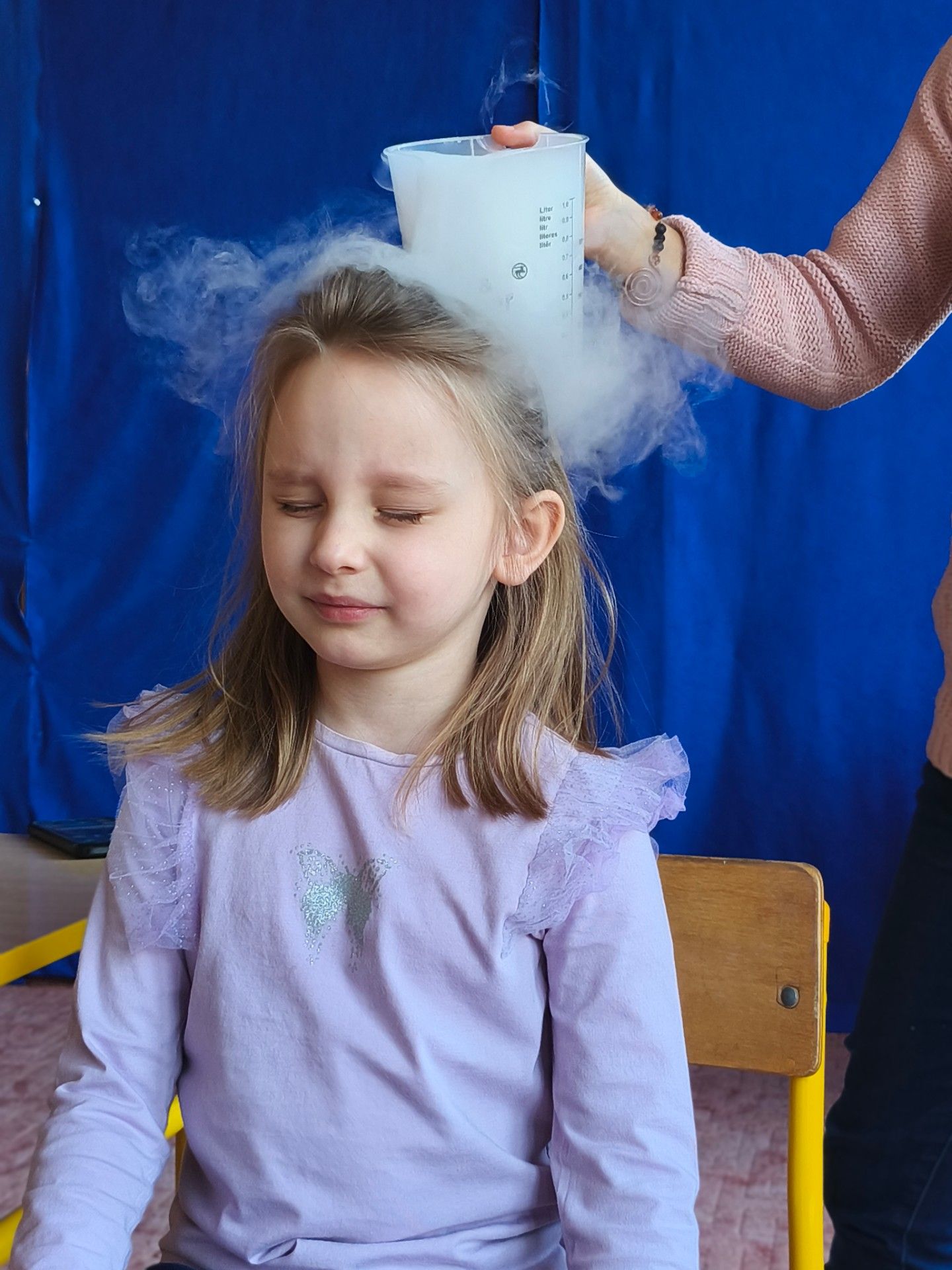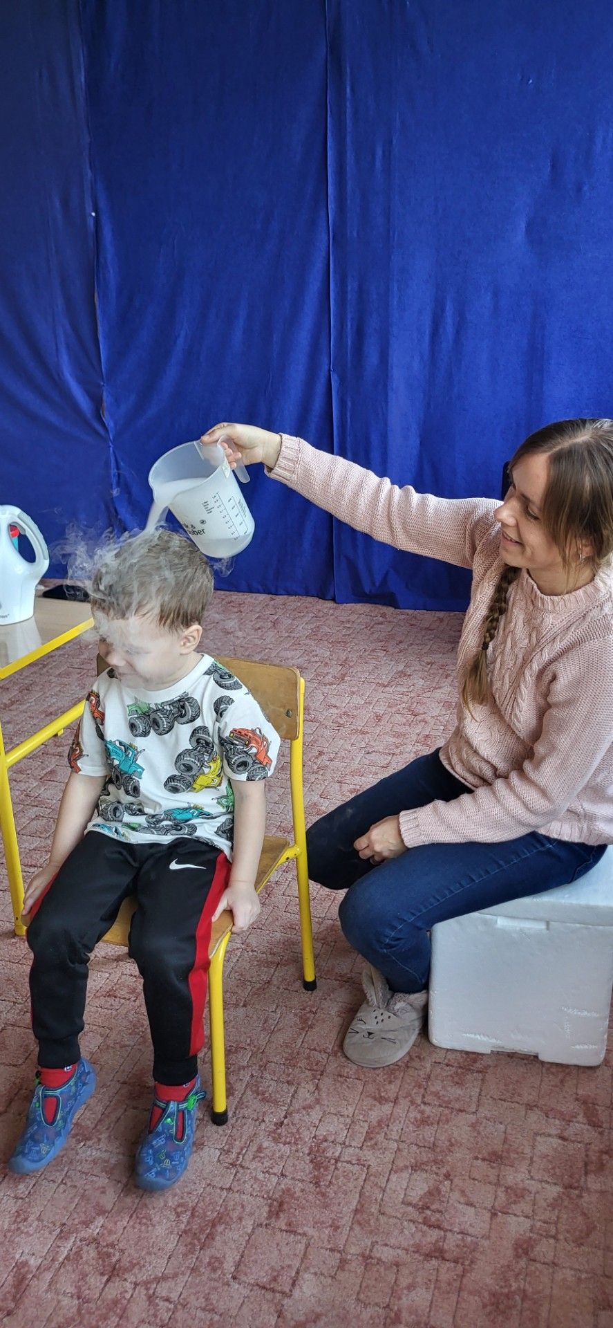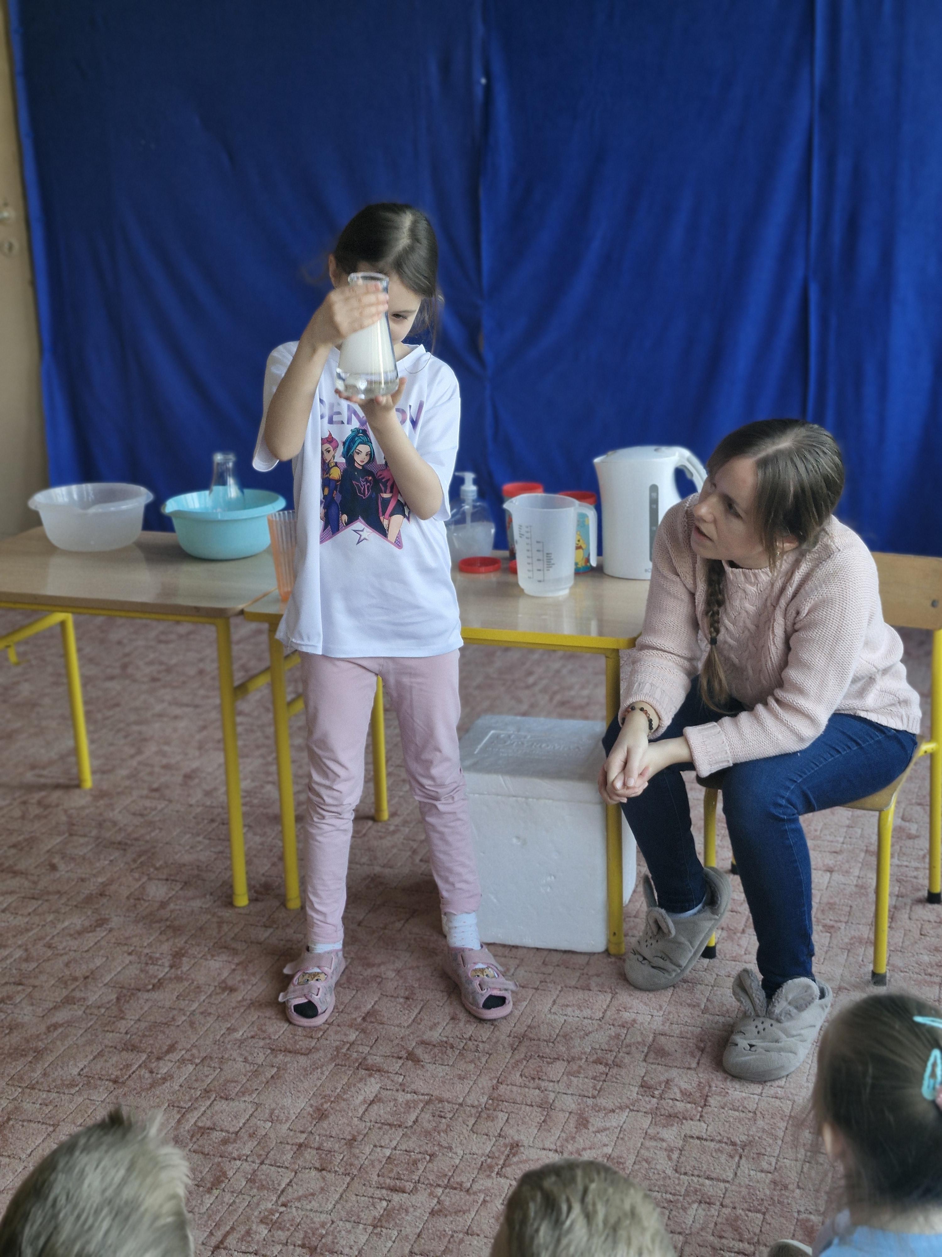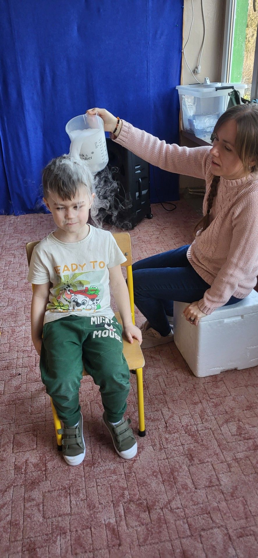 Dzieci z zachwytem obserwowały, jak po połączeniu suchego lodu z wodą powstaje gęsty dym, a po dodaniu płynu tworzy się niezwykła, unosząca się piana . Wyglądało to jak prawdziwa magiczna mikstura!