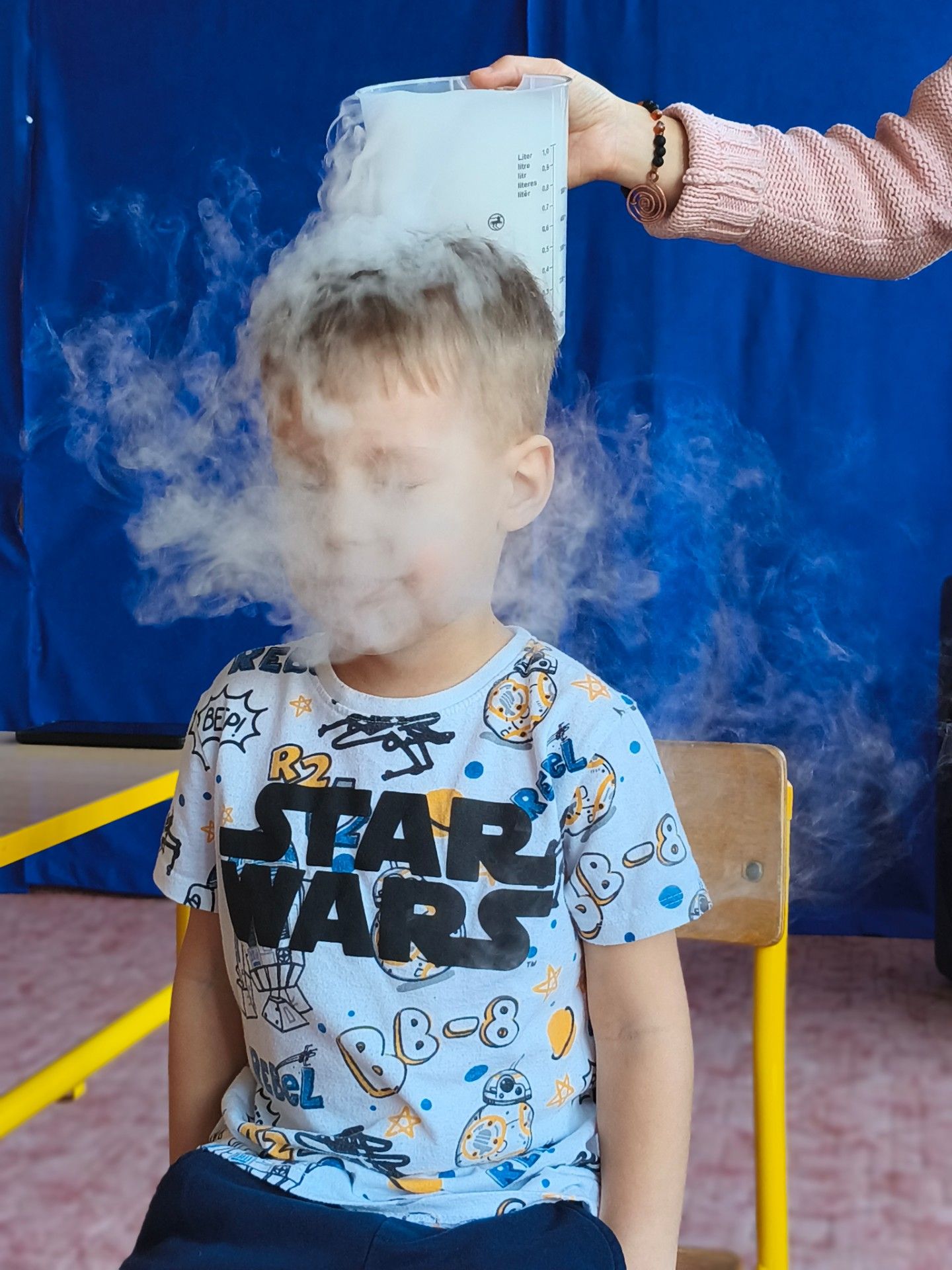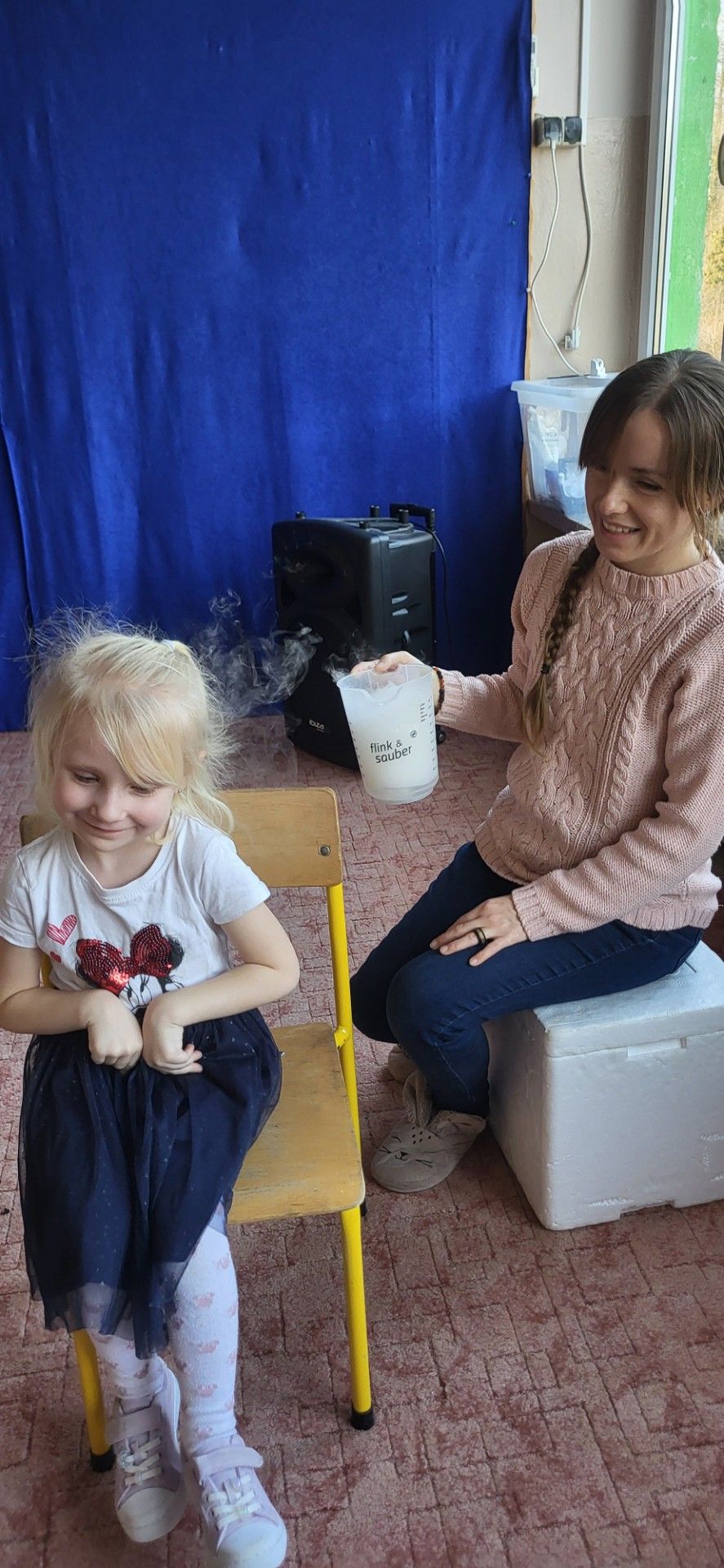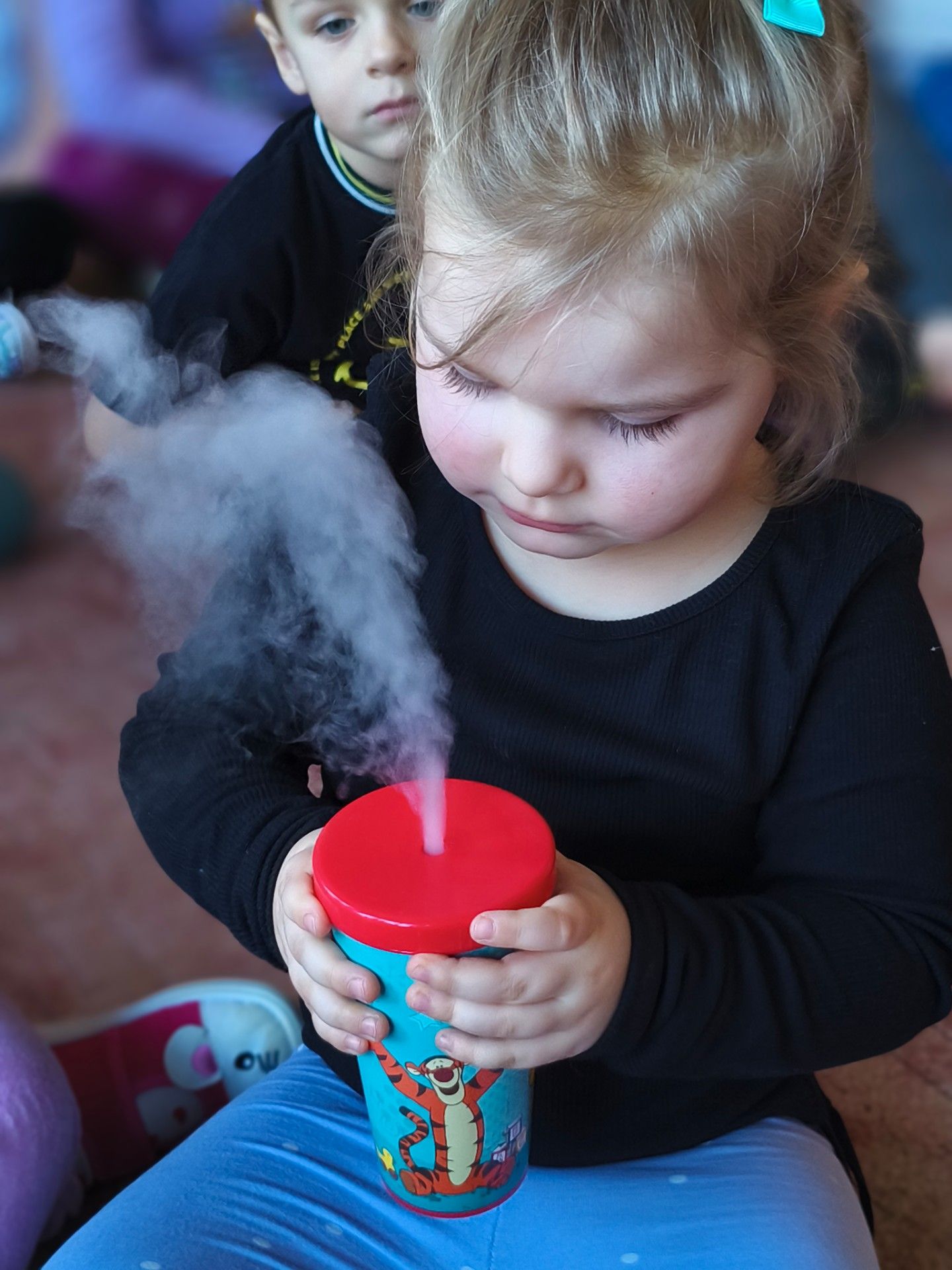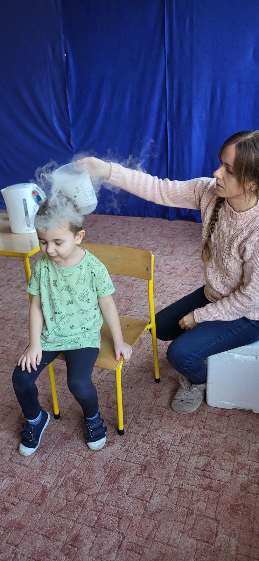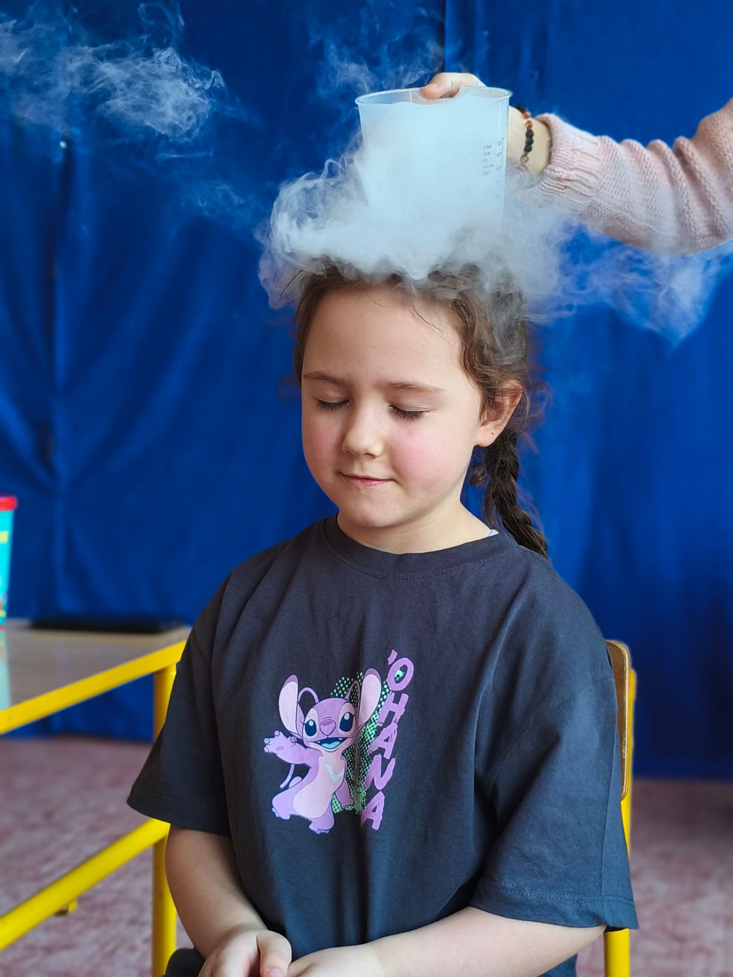 Dzieci z zachwytem obserwowały, jak po połączeniu suchego lodu z wodą powstaje gęsty dym, a po dodaniu płynu tworzy się niezwykła, unosząca się piana . Wyglądało to jak prawdziwa magiczna mikstura!