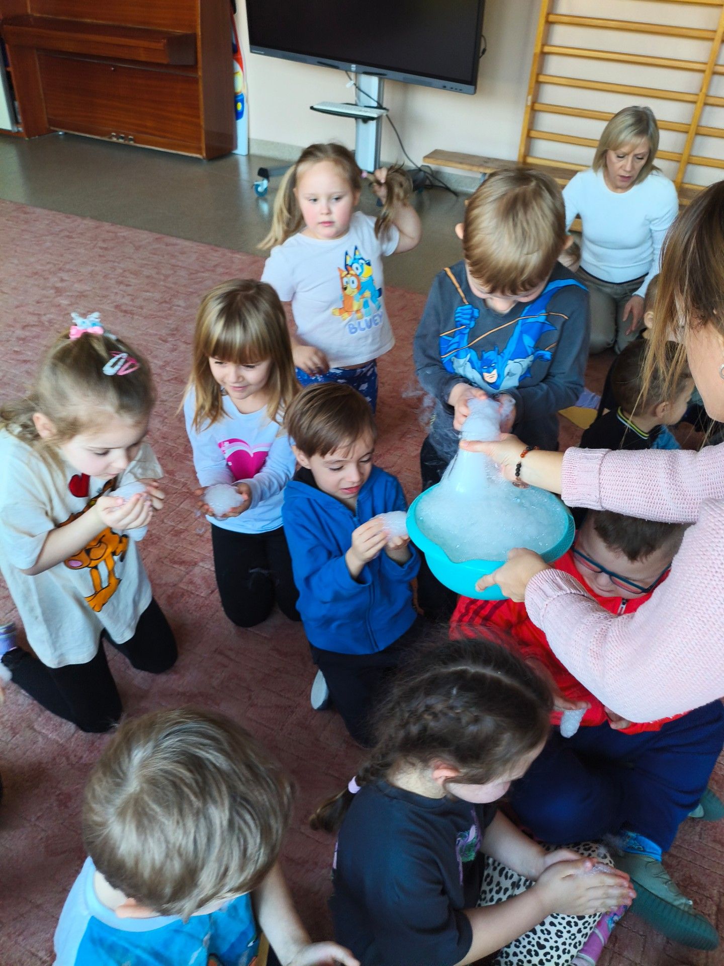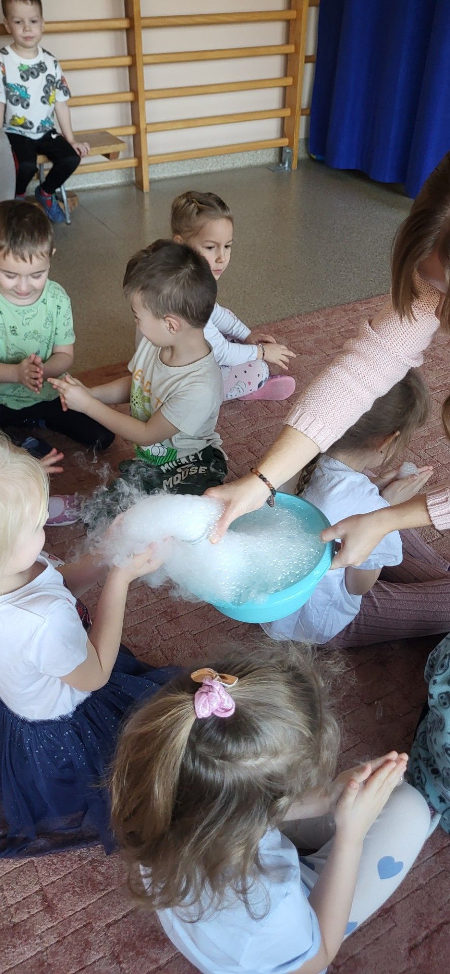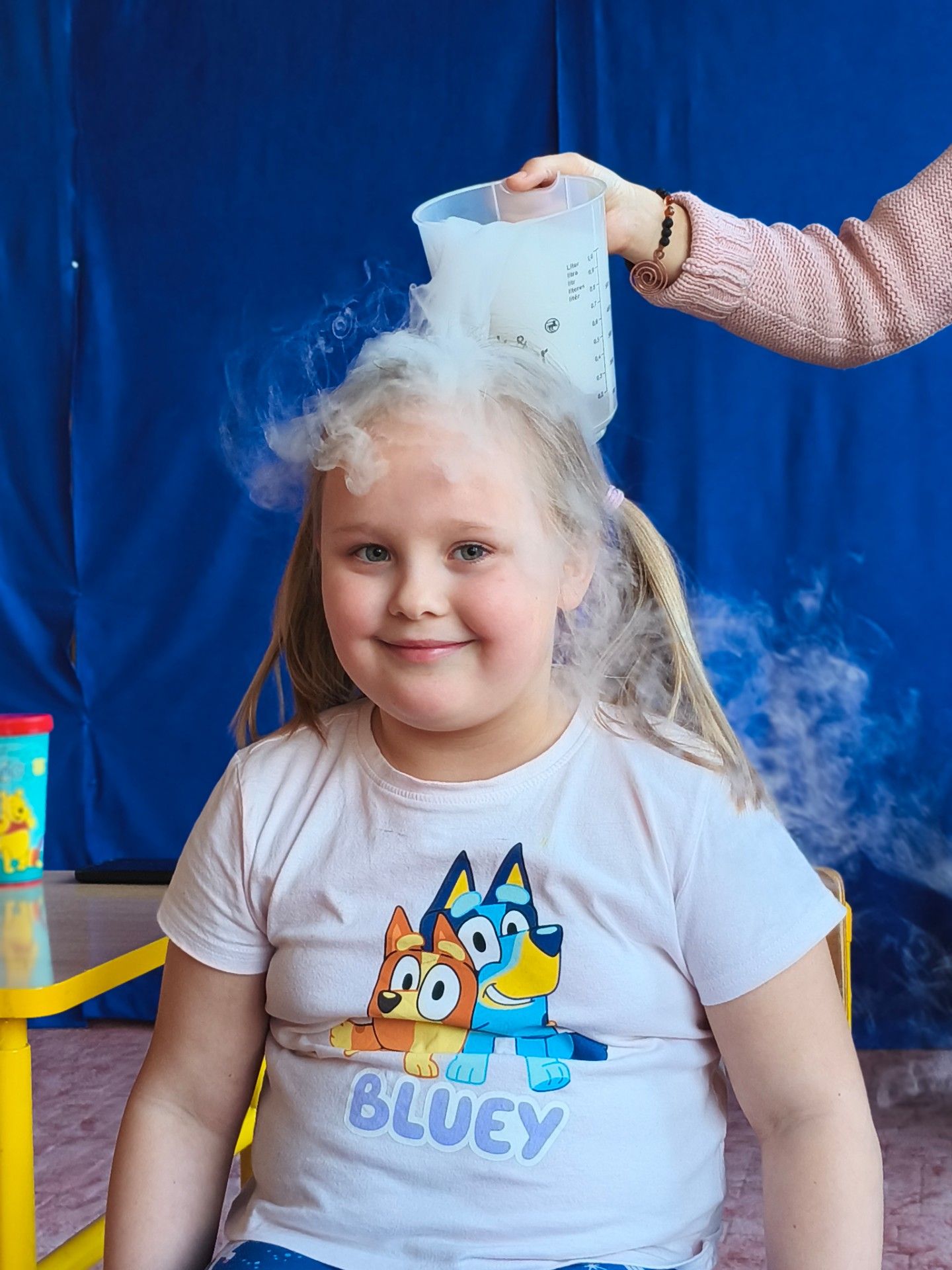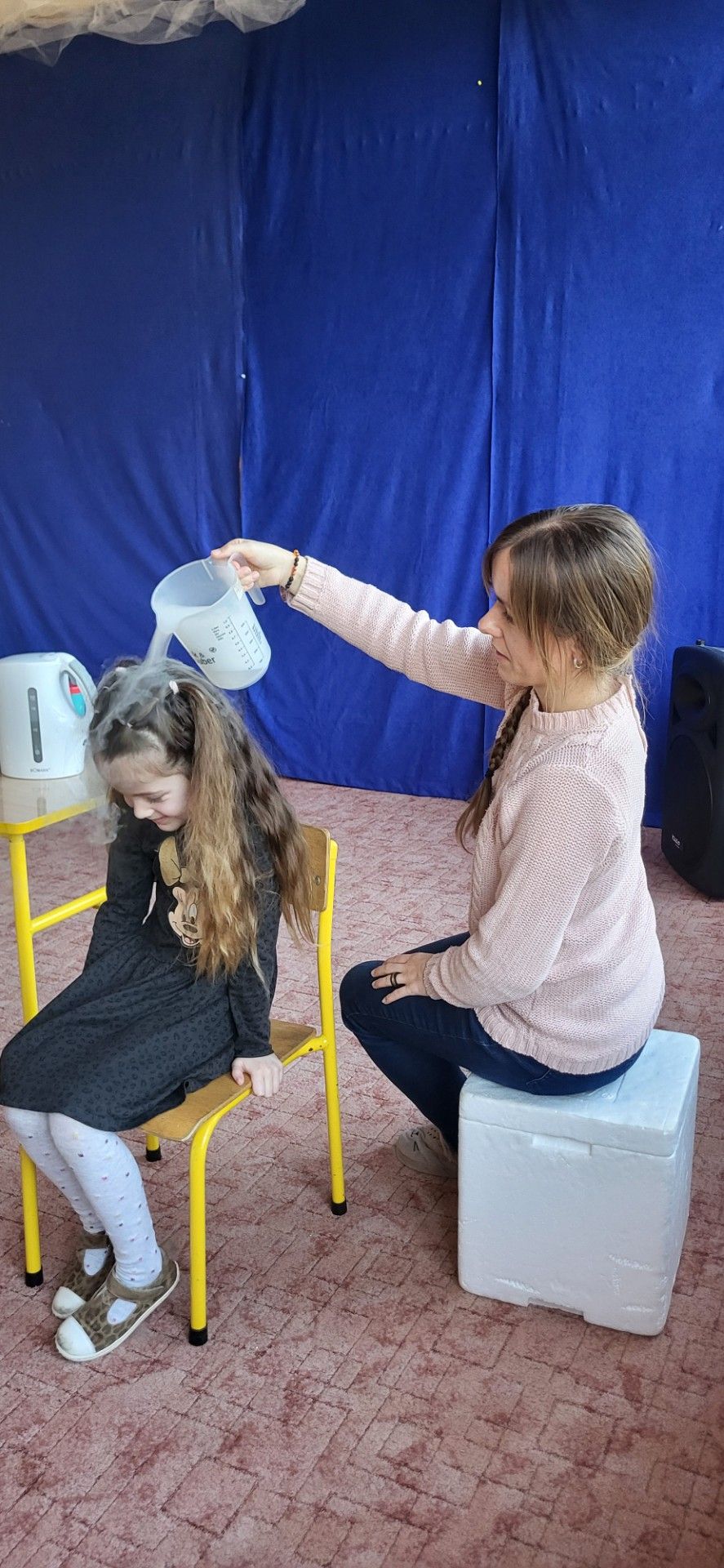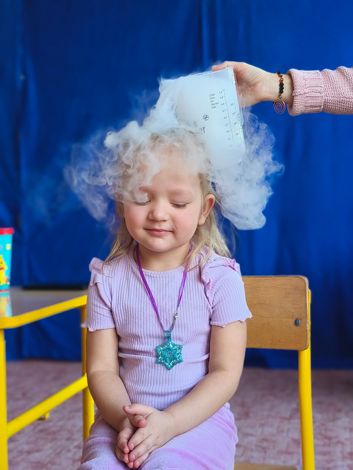 Dzieci z zachwytem obserwowały, jak po połączeniu suchego lodu z wodą powstaje gęsty dym, a po dodaniu płynu tworzy się niezwykła, unosząca się piana . Wyglądało to jak prawdziwa magiczna mikstura!