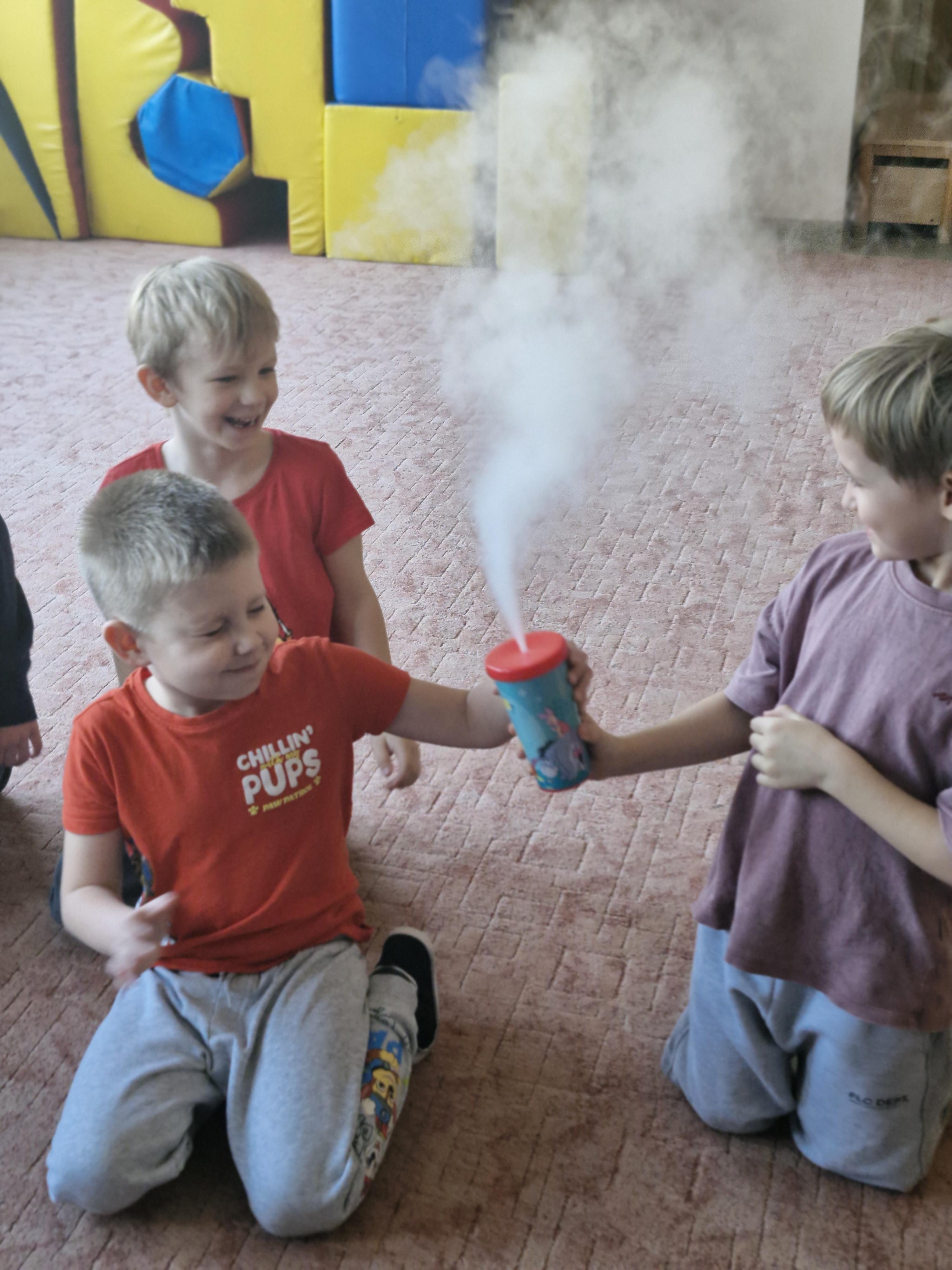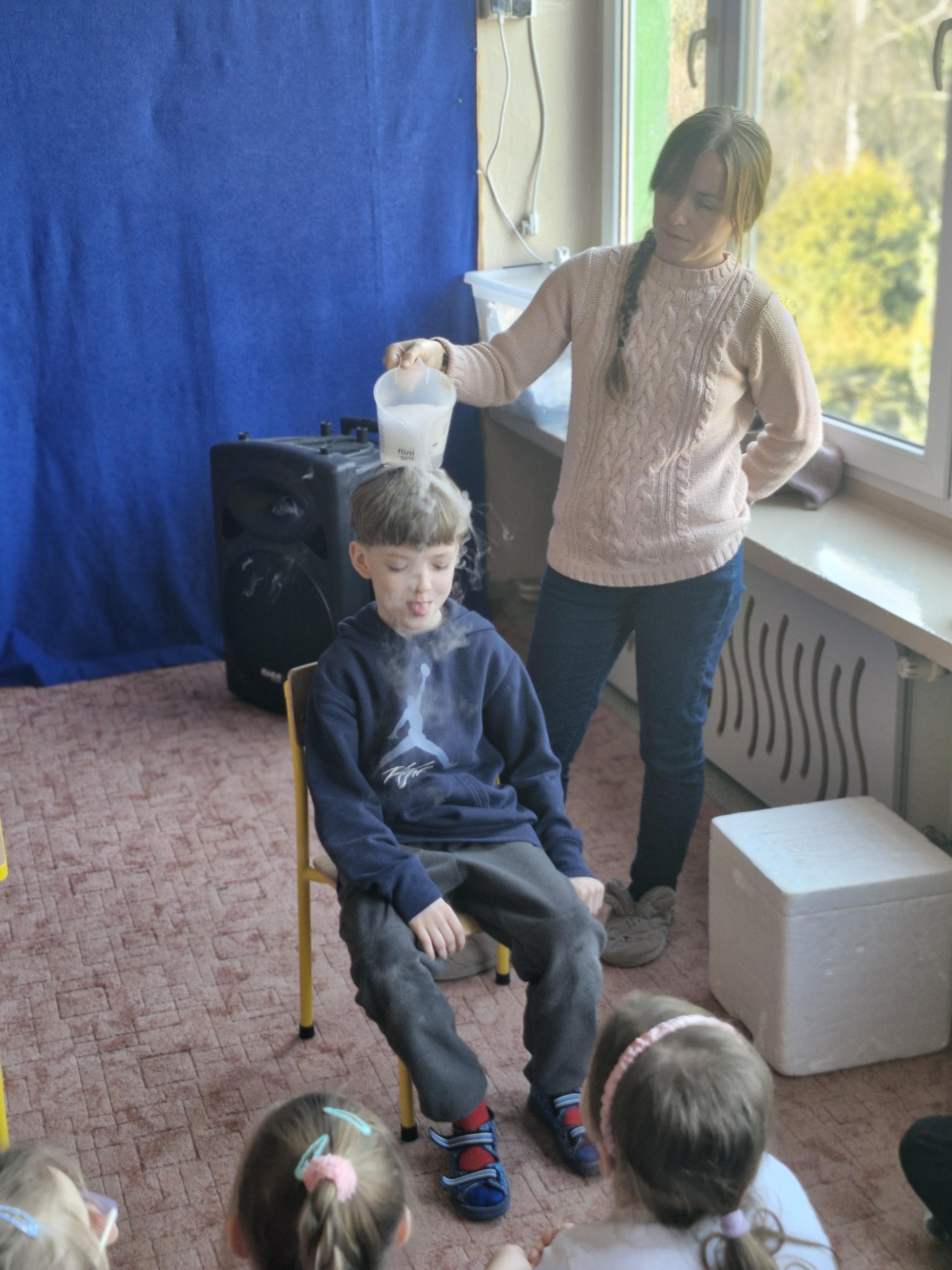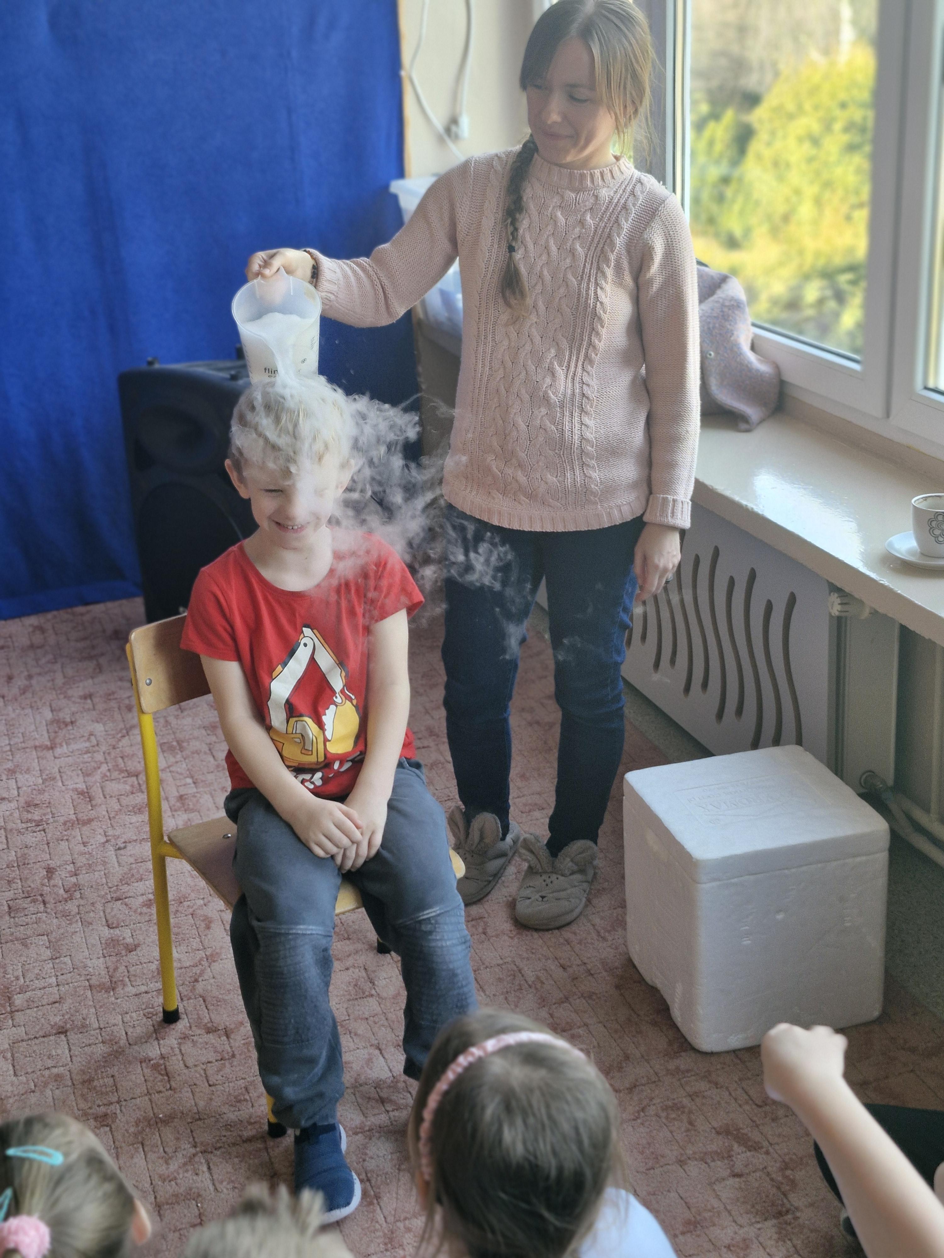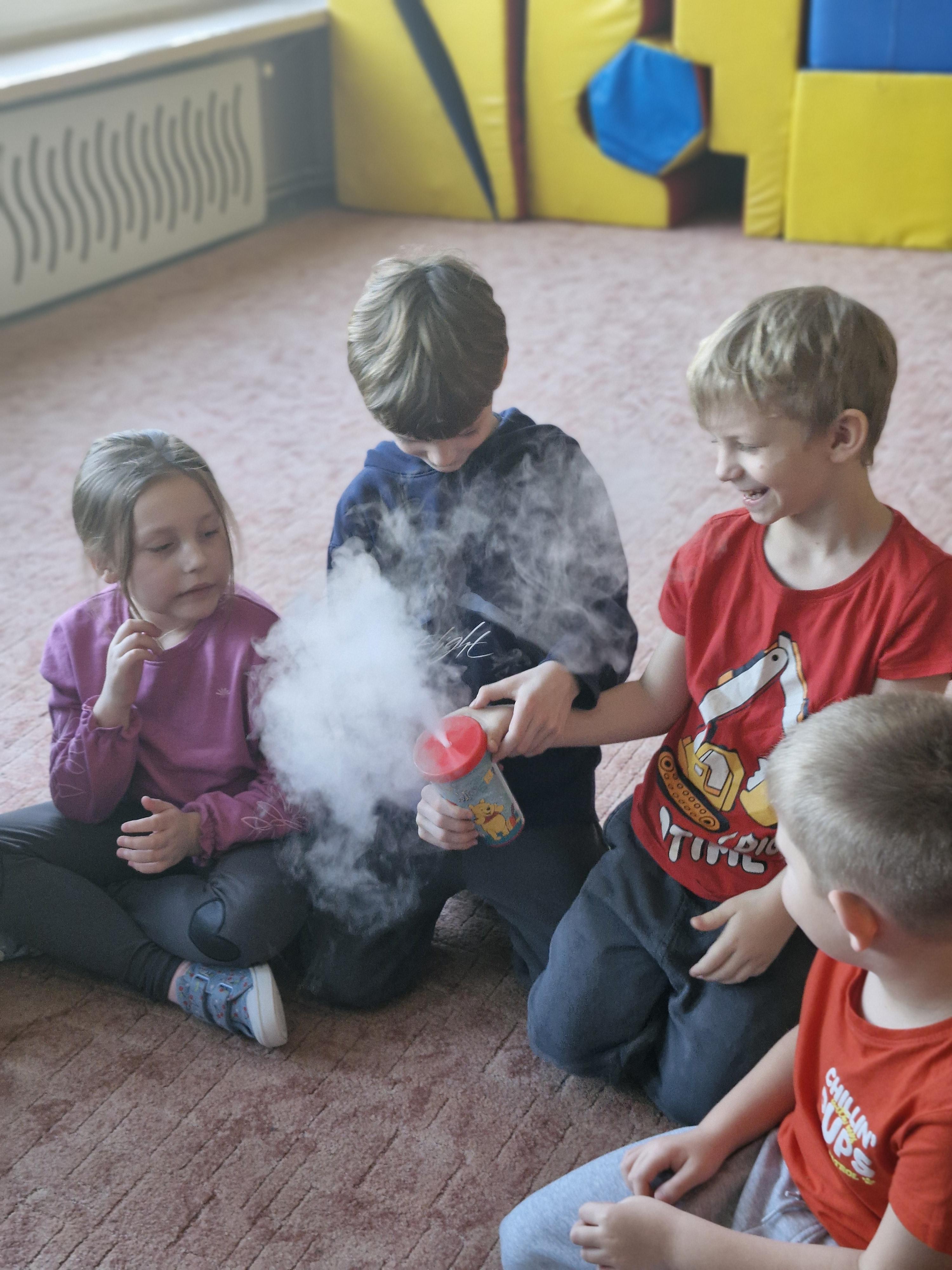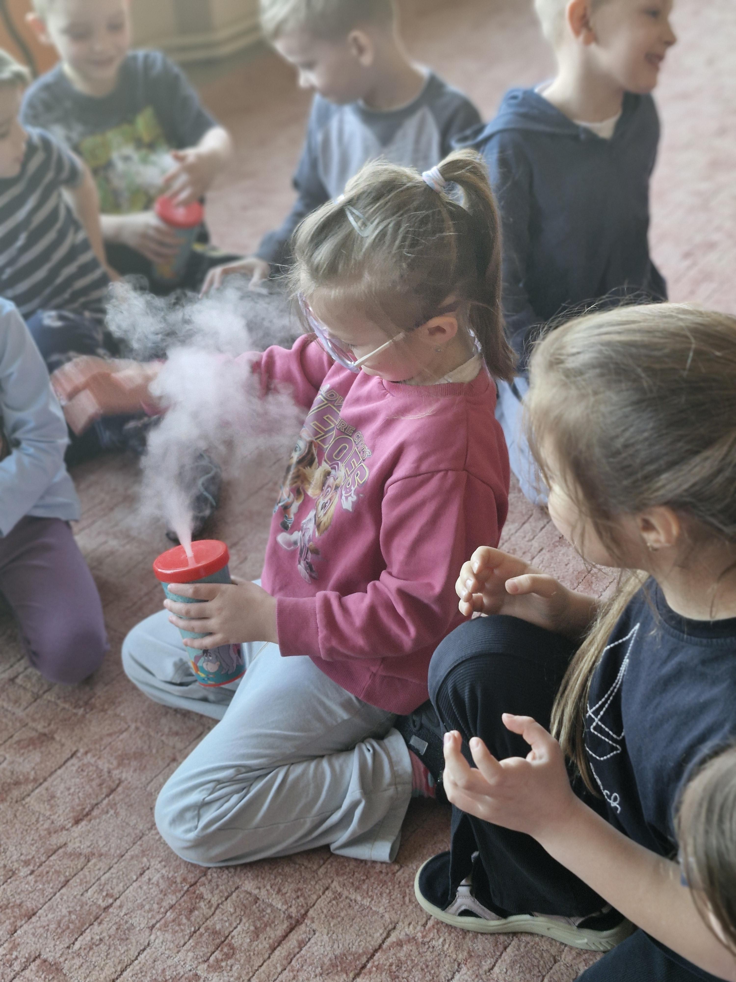 Przedszkolaki dowiedziały się, dlaczego suchy lód jest tak bardzo zimny oraz jak bezpiecznie wykonywać doświadczenia. Było mnóstwo radości, ciekawych pytań i okrzyków zachwytu.