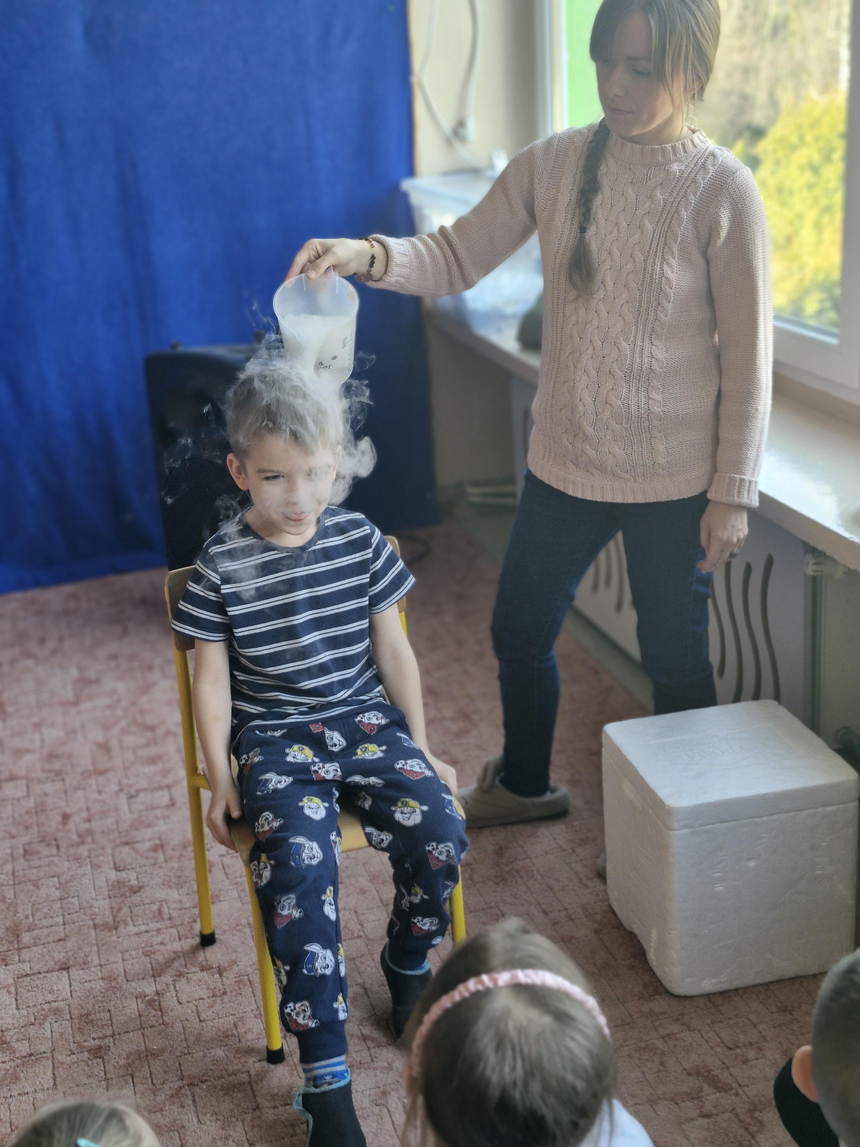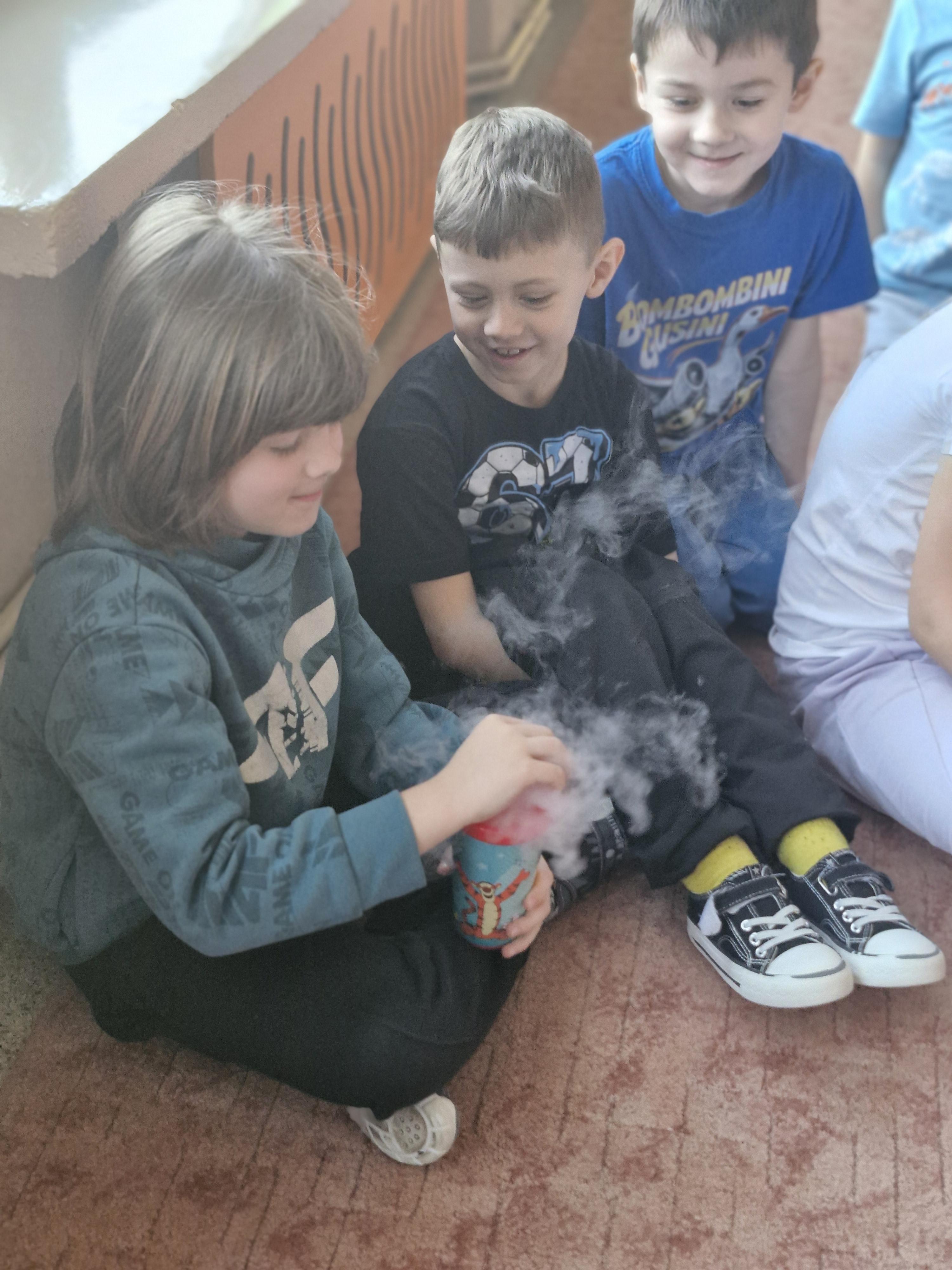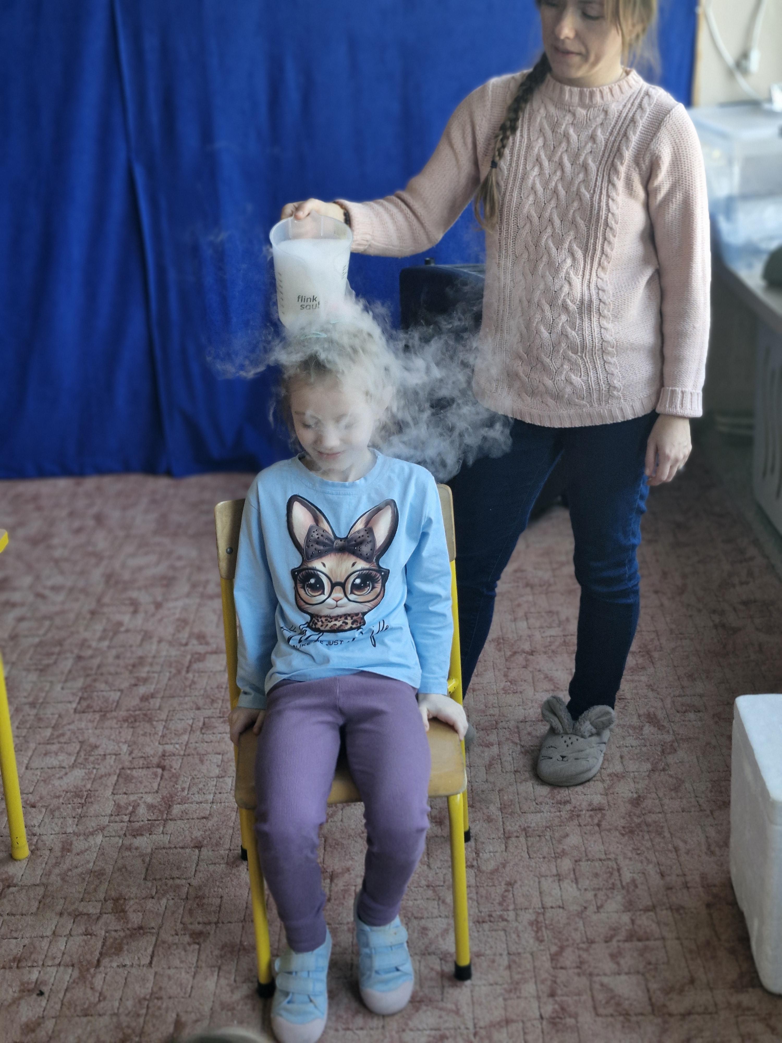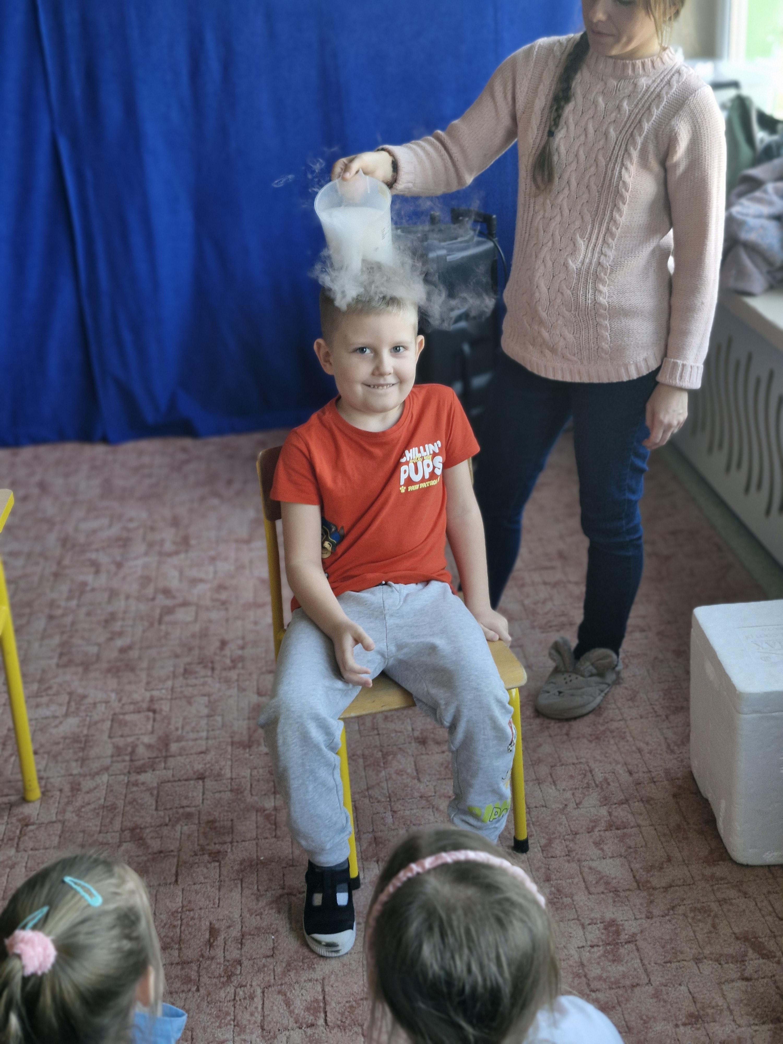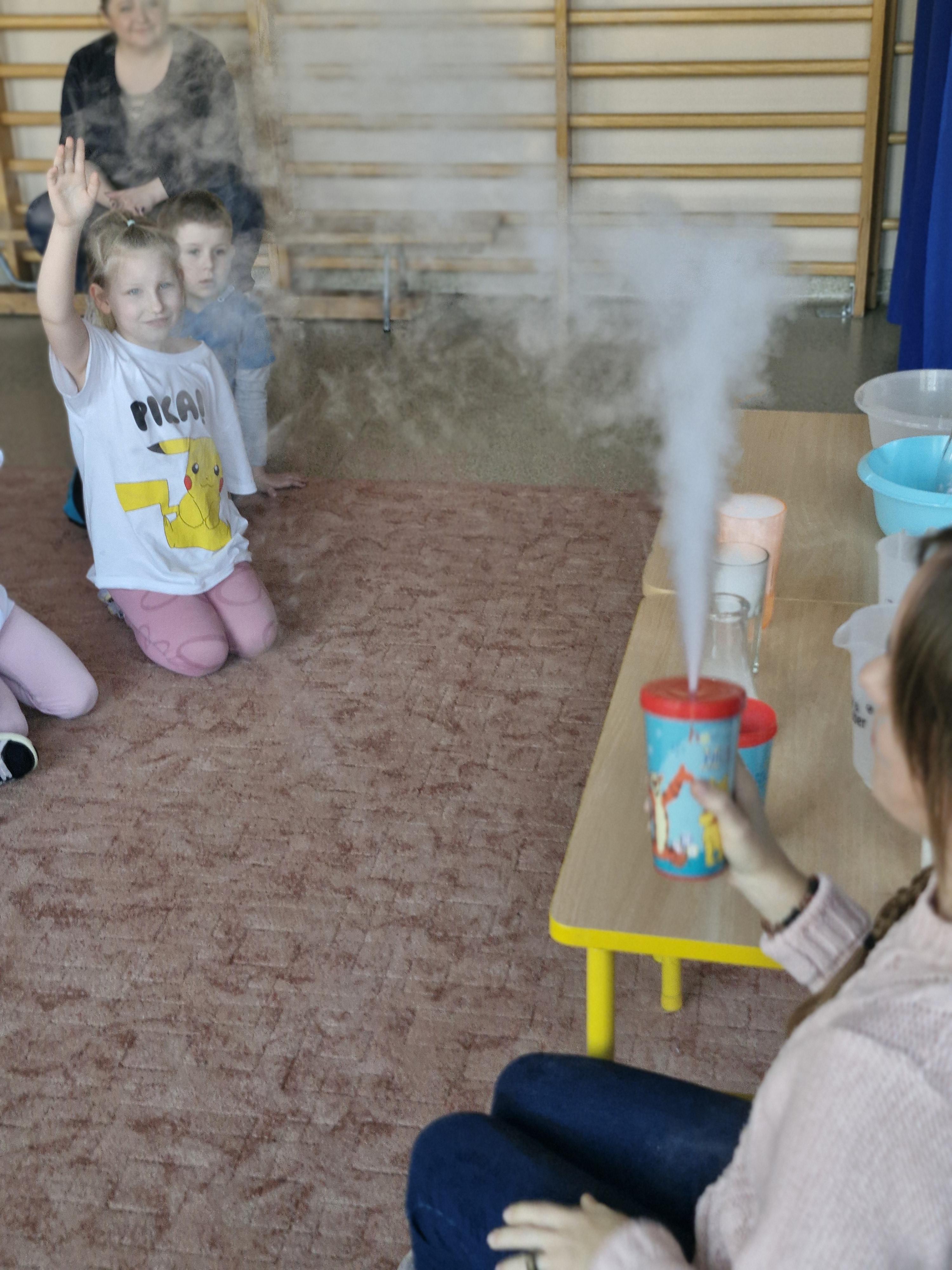 Przedszkolaki dowiedziały się, dlaczego suchy lód jest tak bardzo zimny oraz jak bezpiecznie wykonywać doświadczenia. Było mnóstwo radości, ciekawych pytań i okrzyków zachwytu.