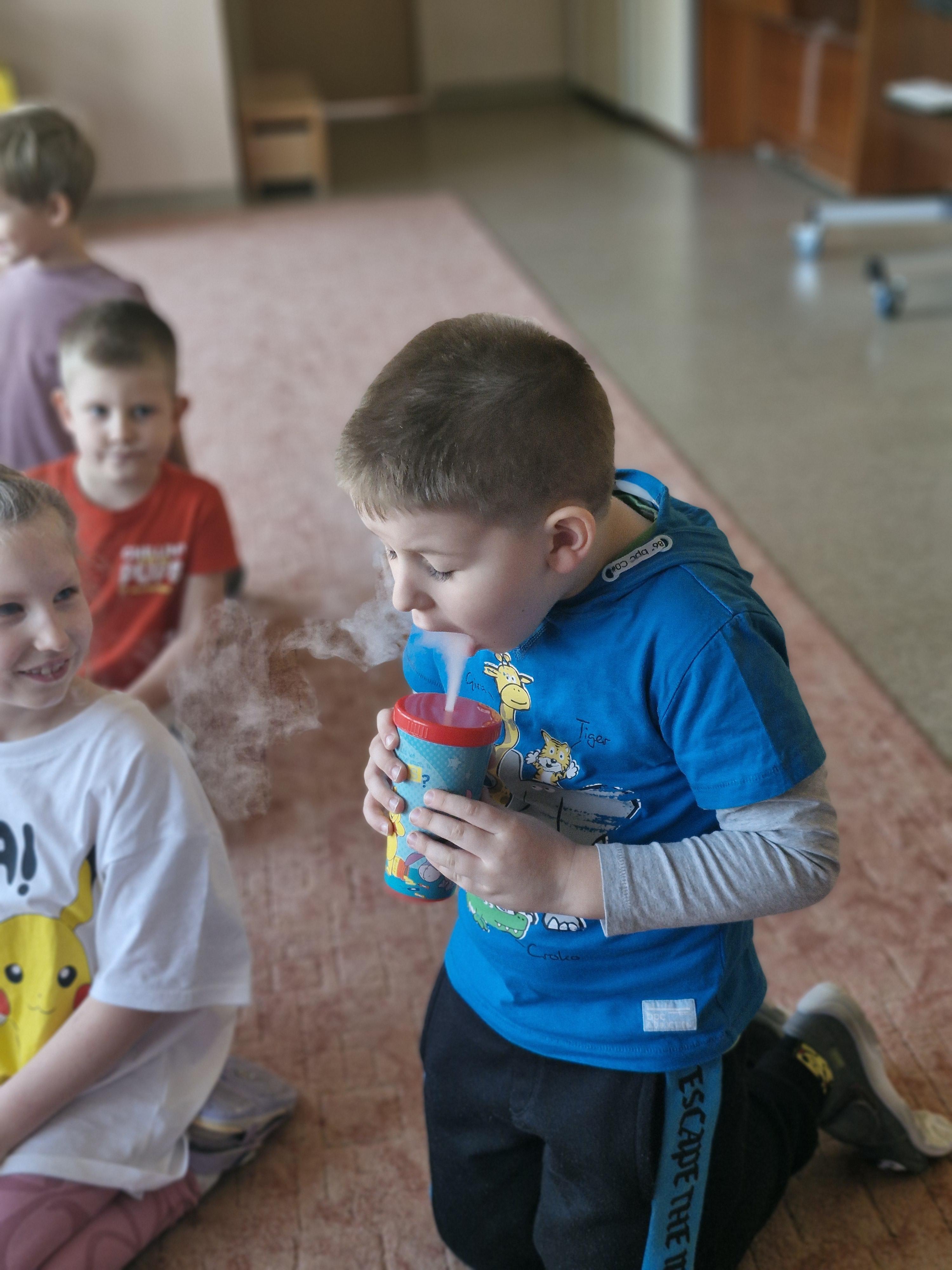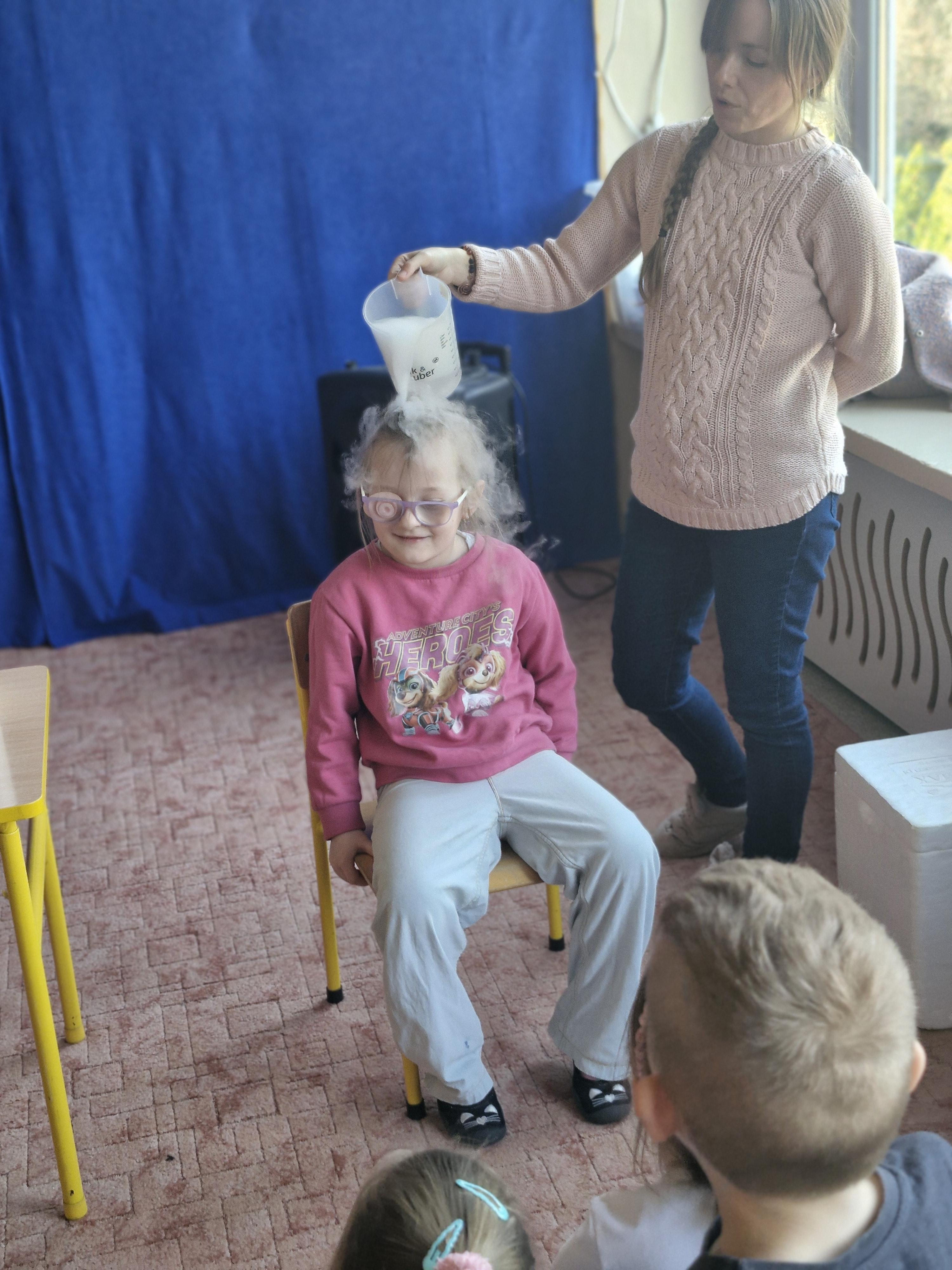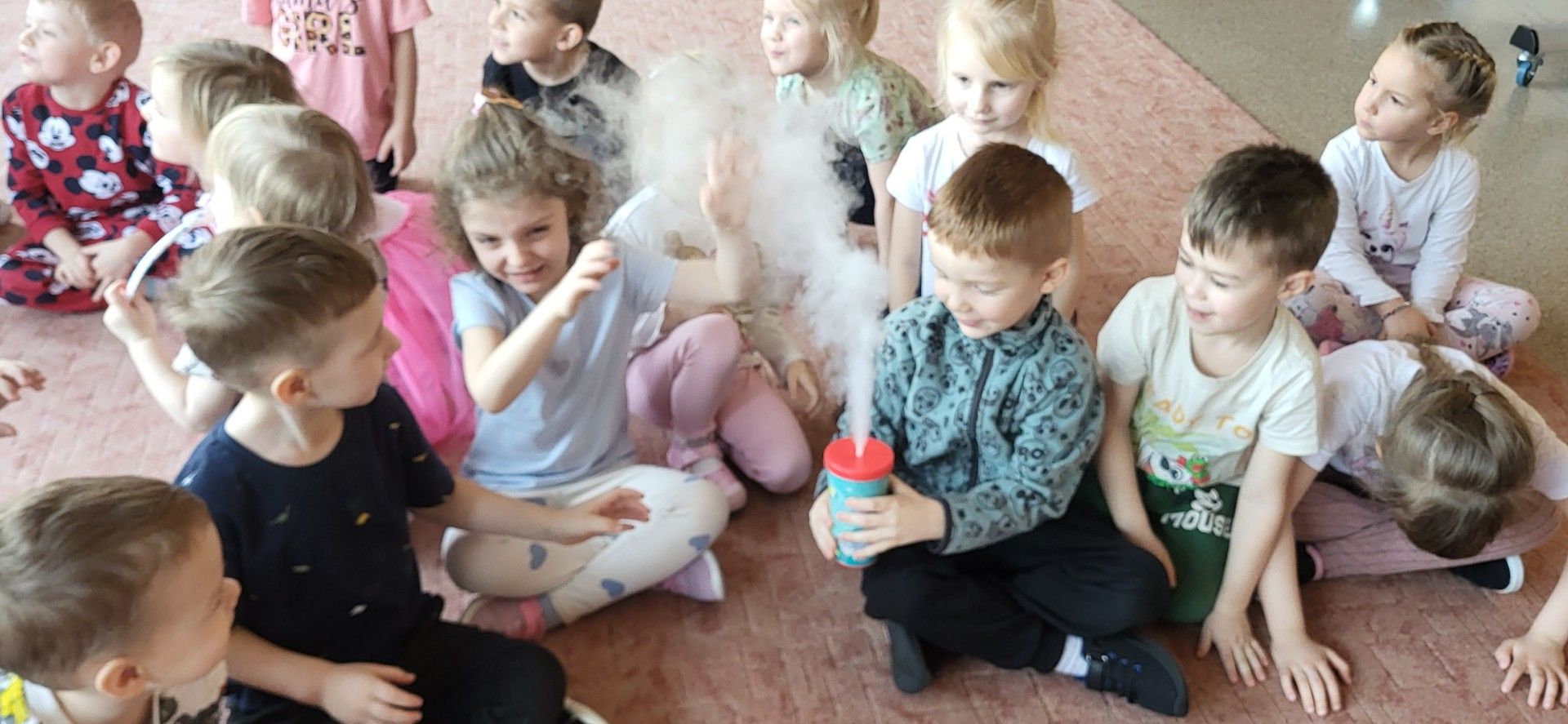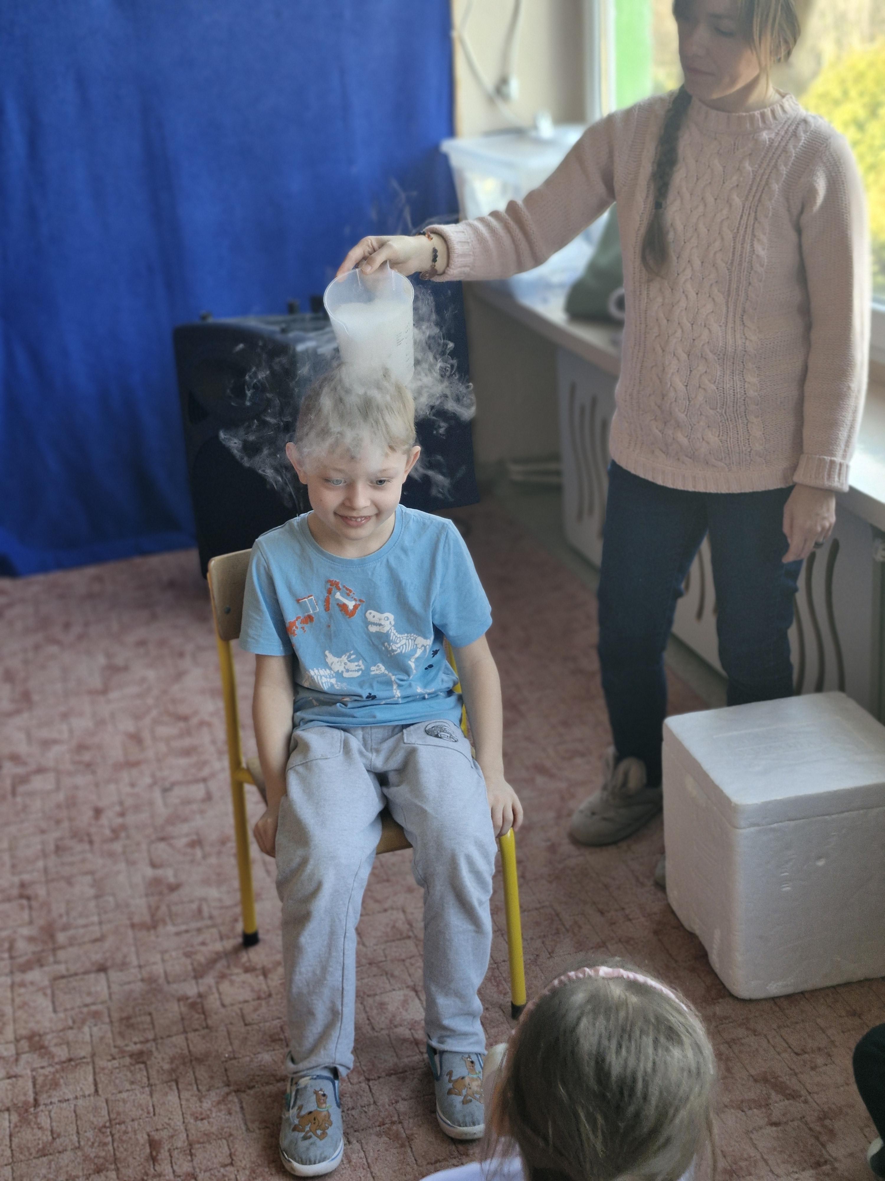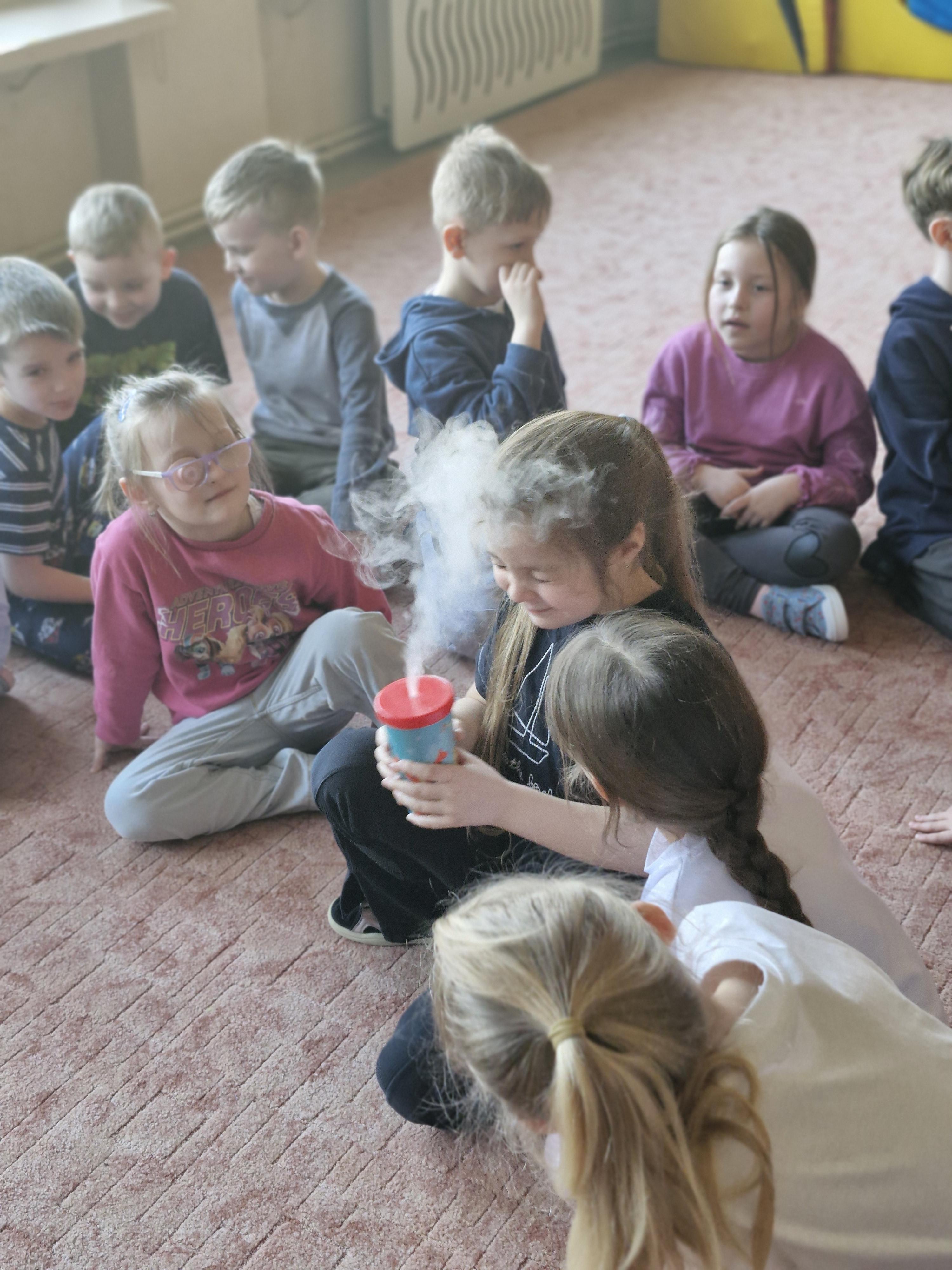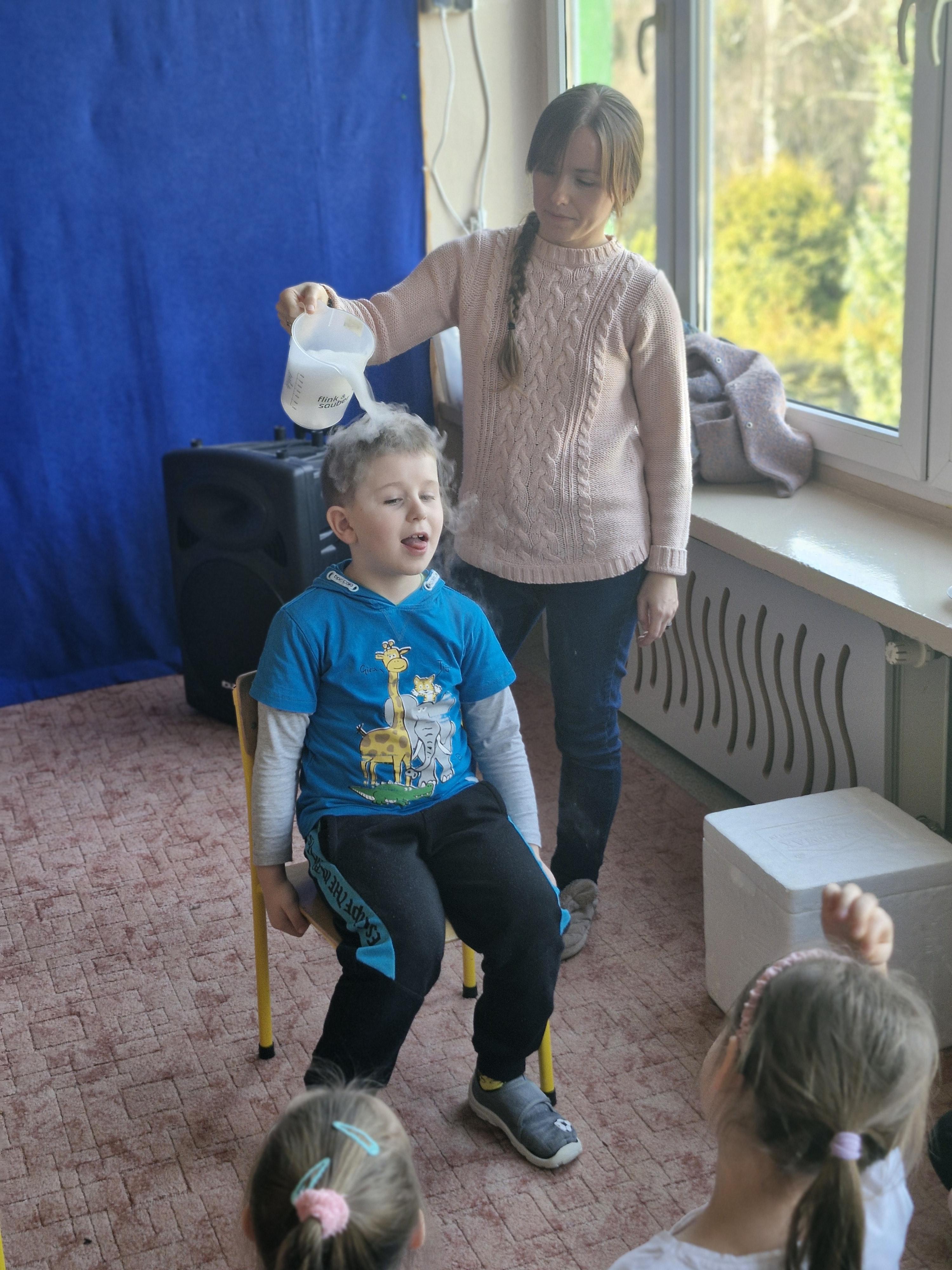 Przedszkolaki dowiedziały się, dlaczego suchy lód jest tak bardzo zimny oraz jak bezpiecznie wykonywać doświadczenia. Było mnóstwo radości, ciekawych pytań i okrzyków zachwytu.