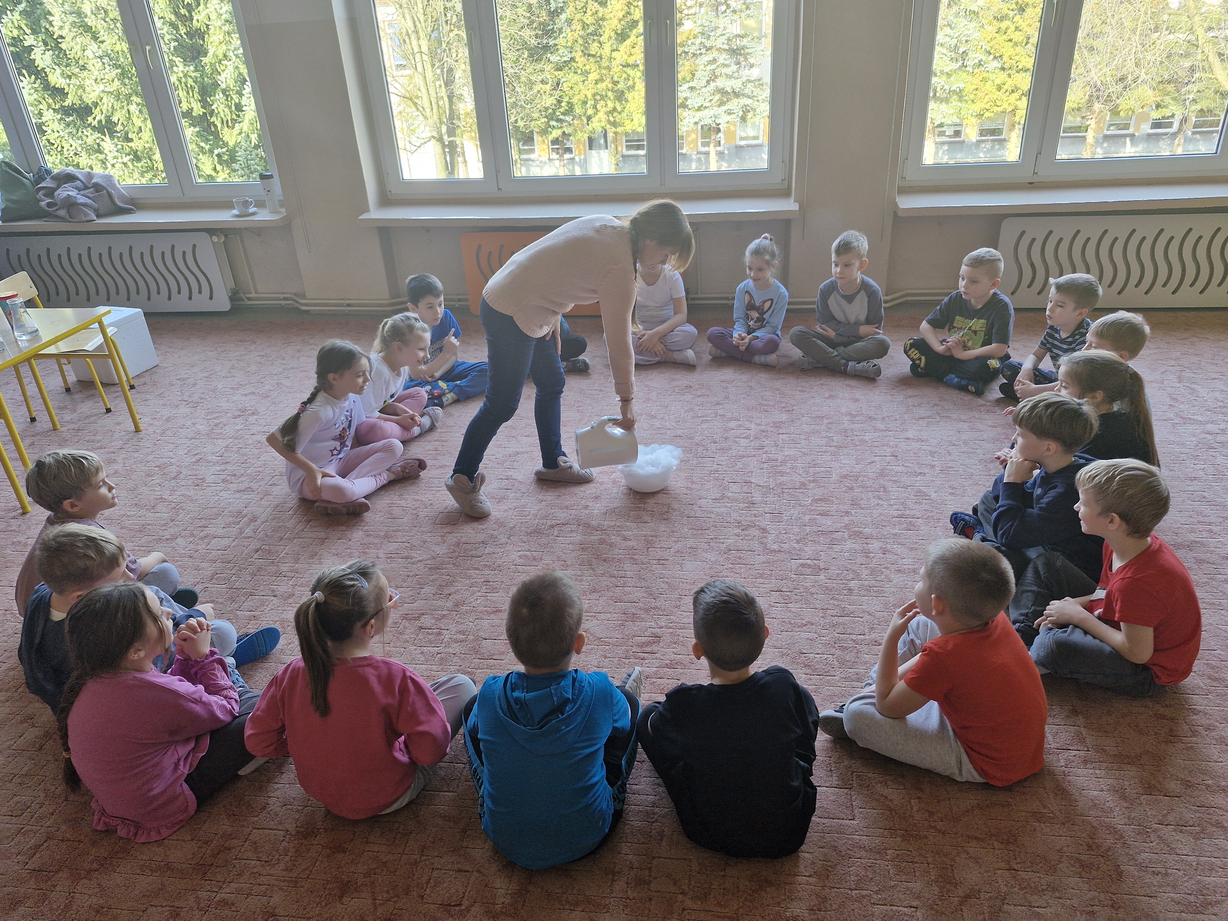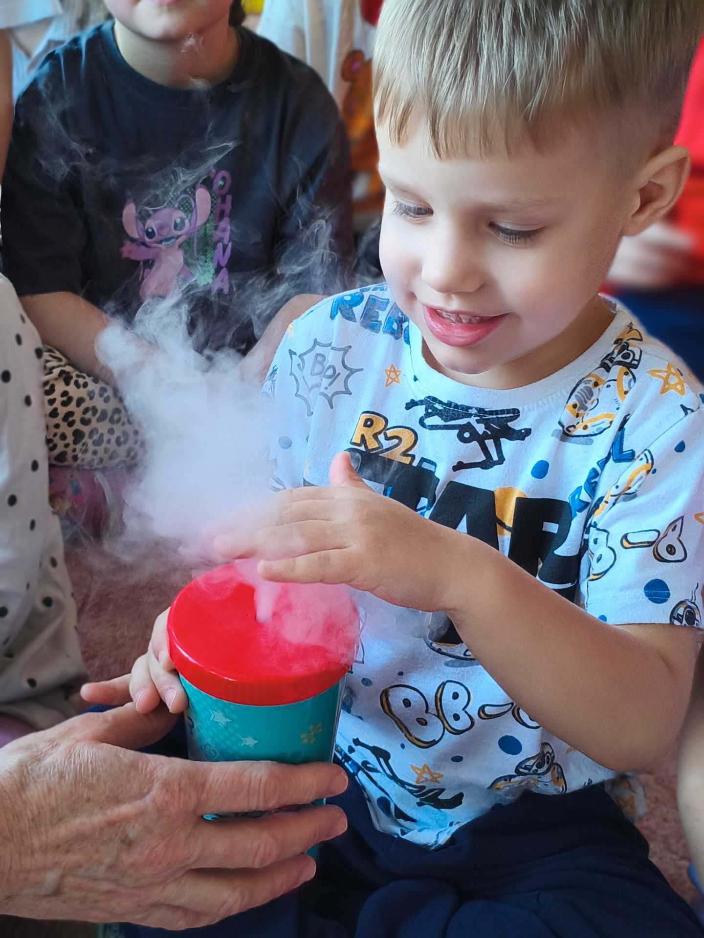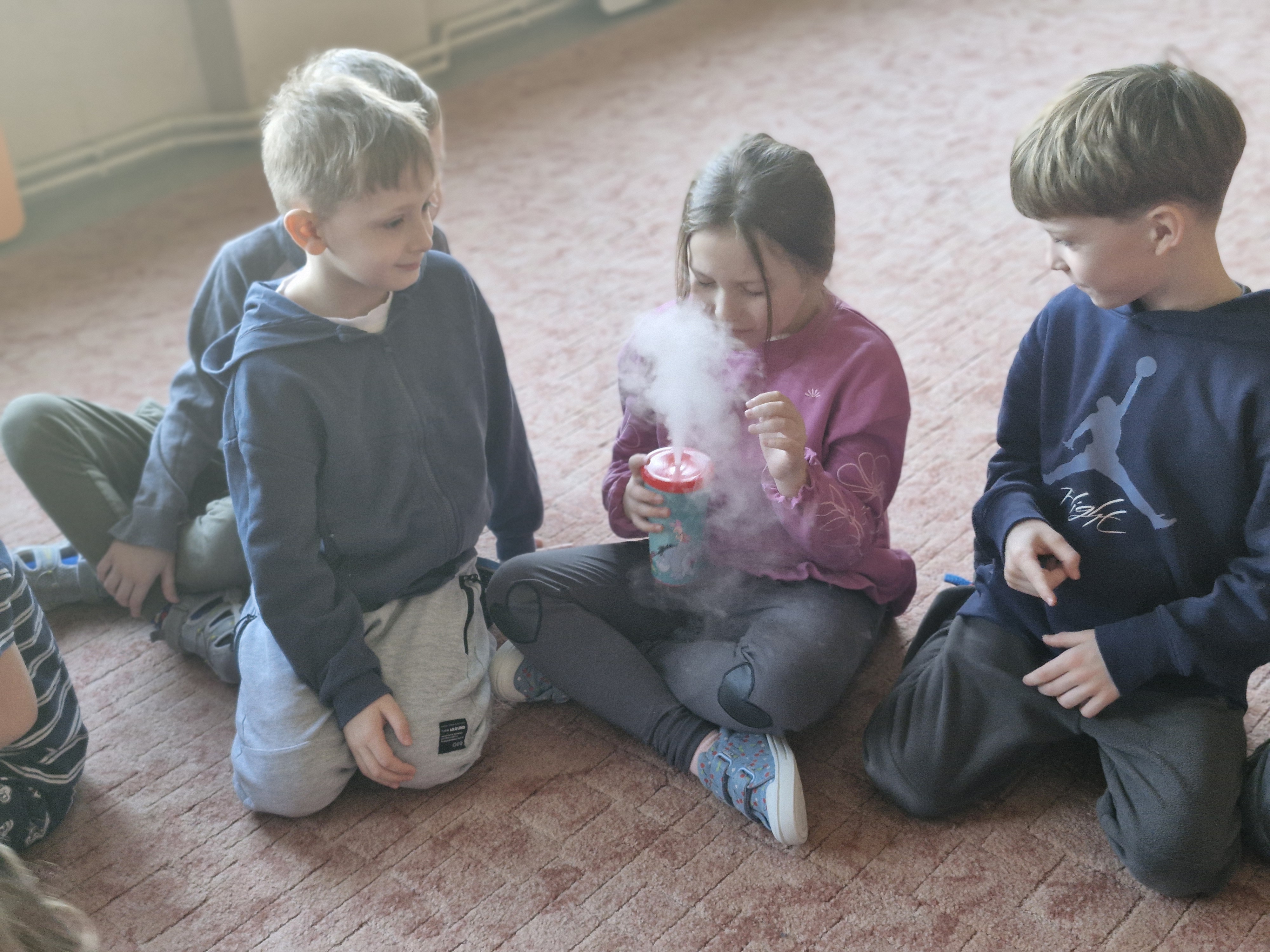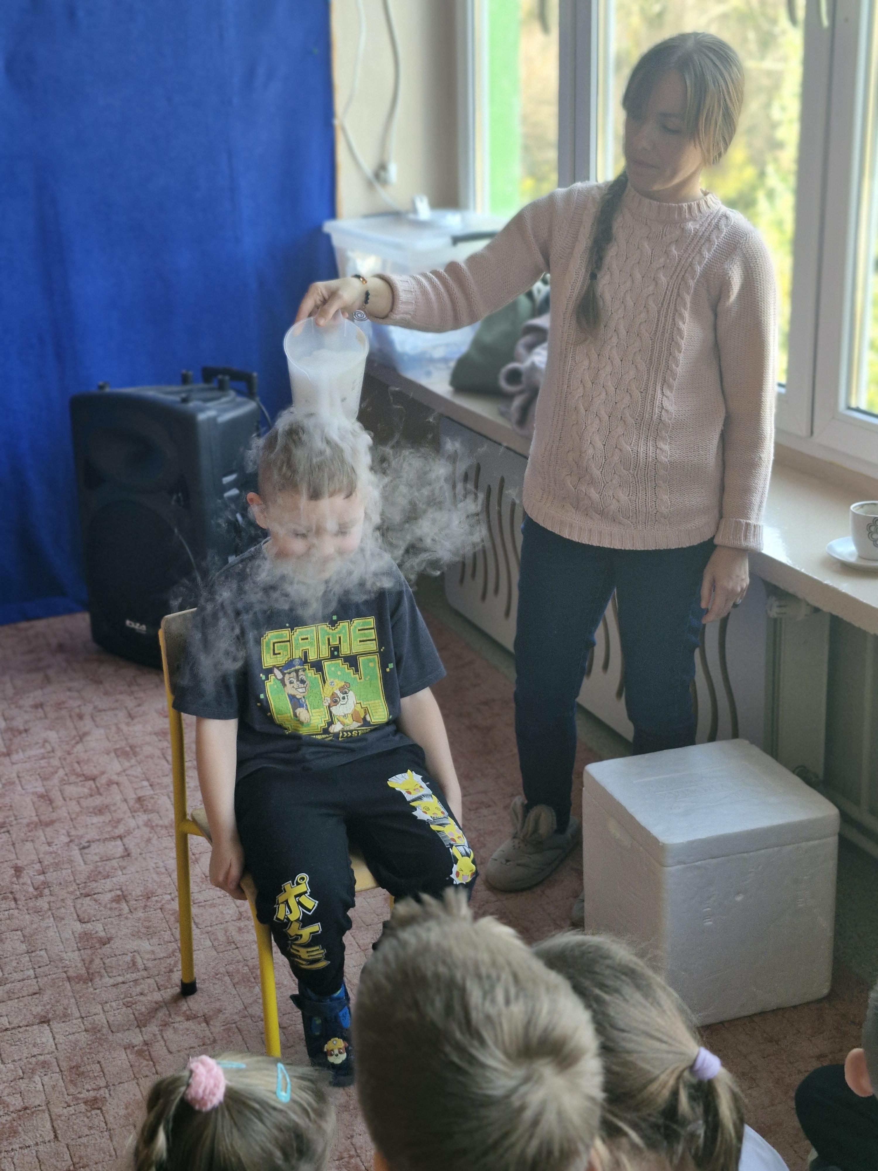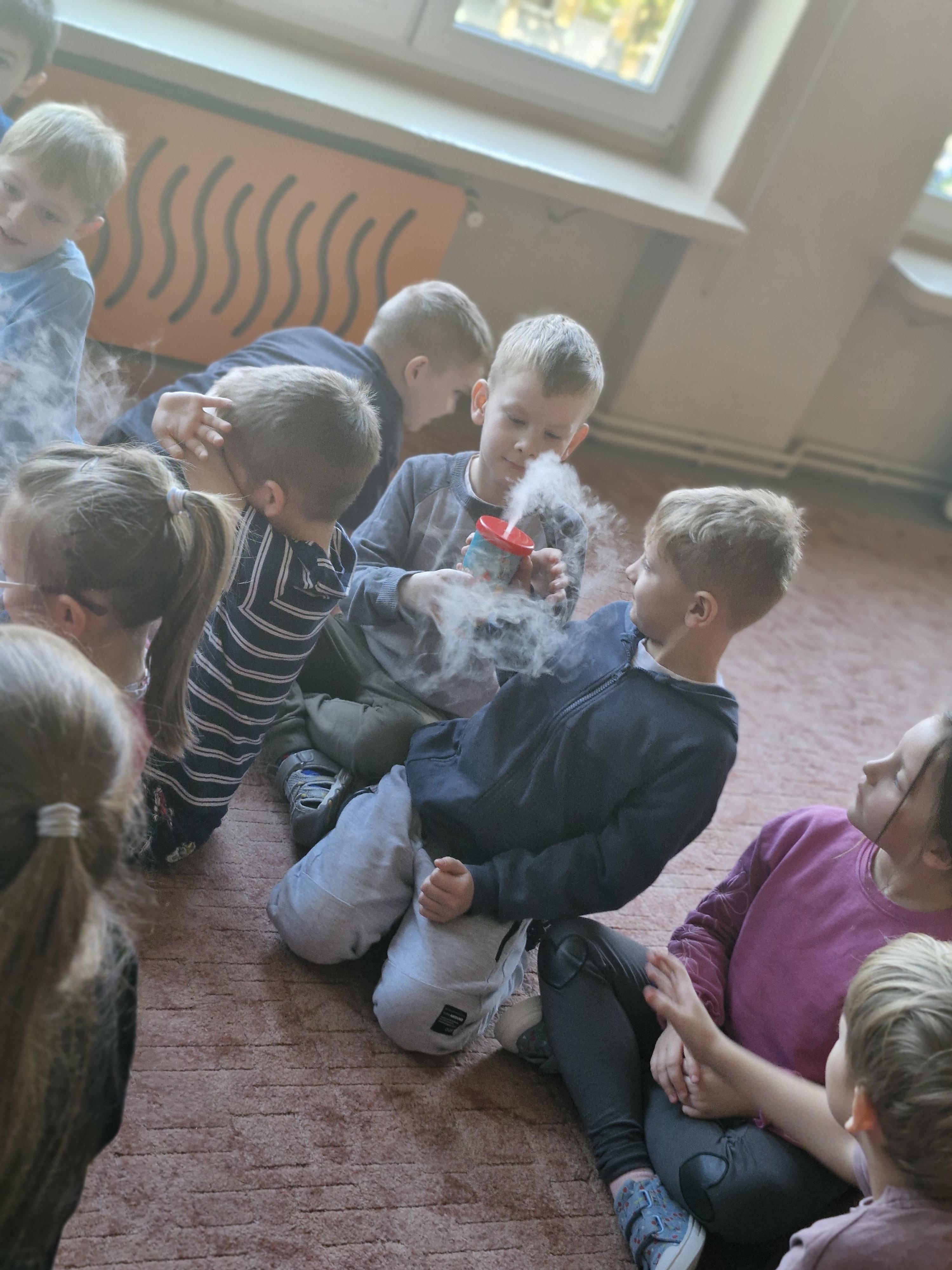 Przedszkolaki dowiedziały się, dlaczego suchy lód jest tak bardzo zimny oraz jak bezpiecznie wykonywać doświadczenia. Było mnóstwo radości, ciekawych pytań i okrzyków zachwytu.