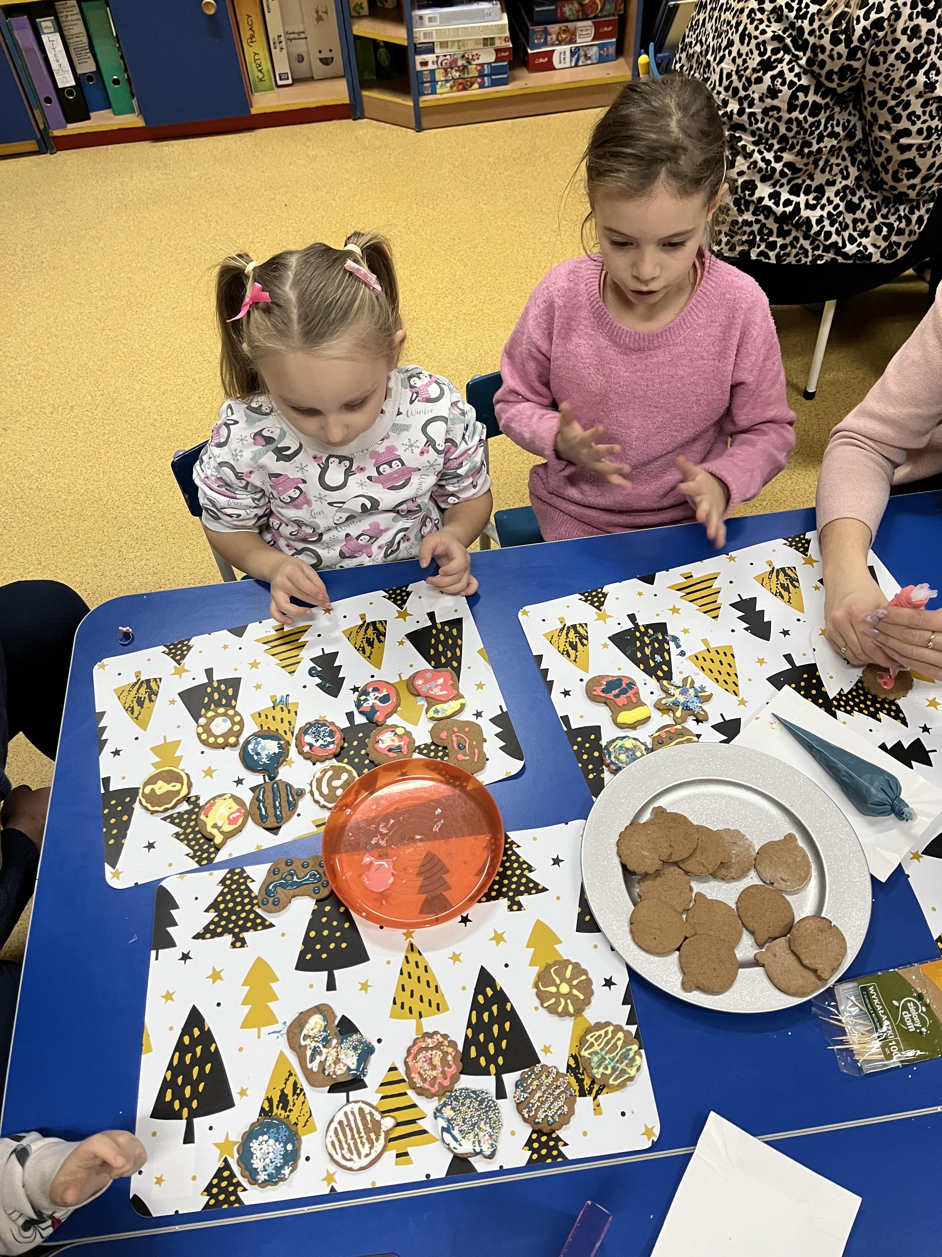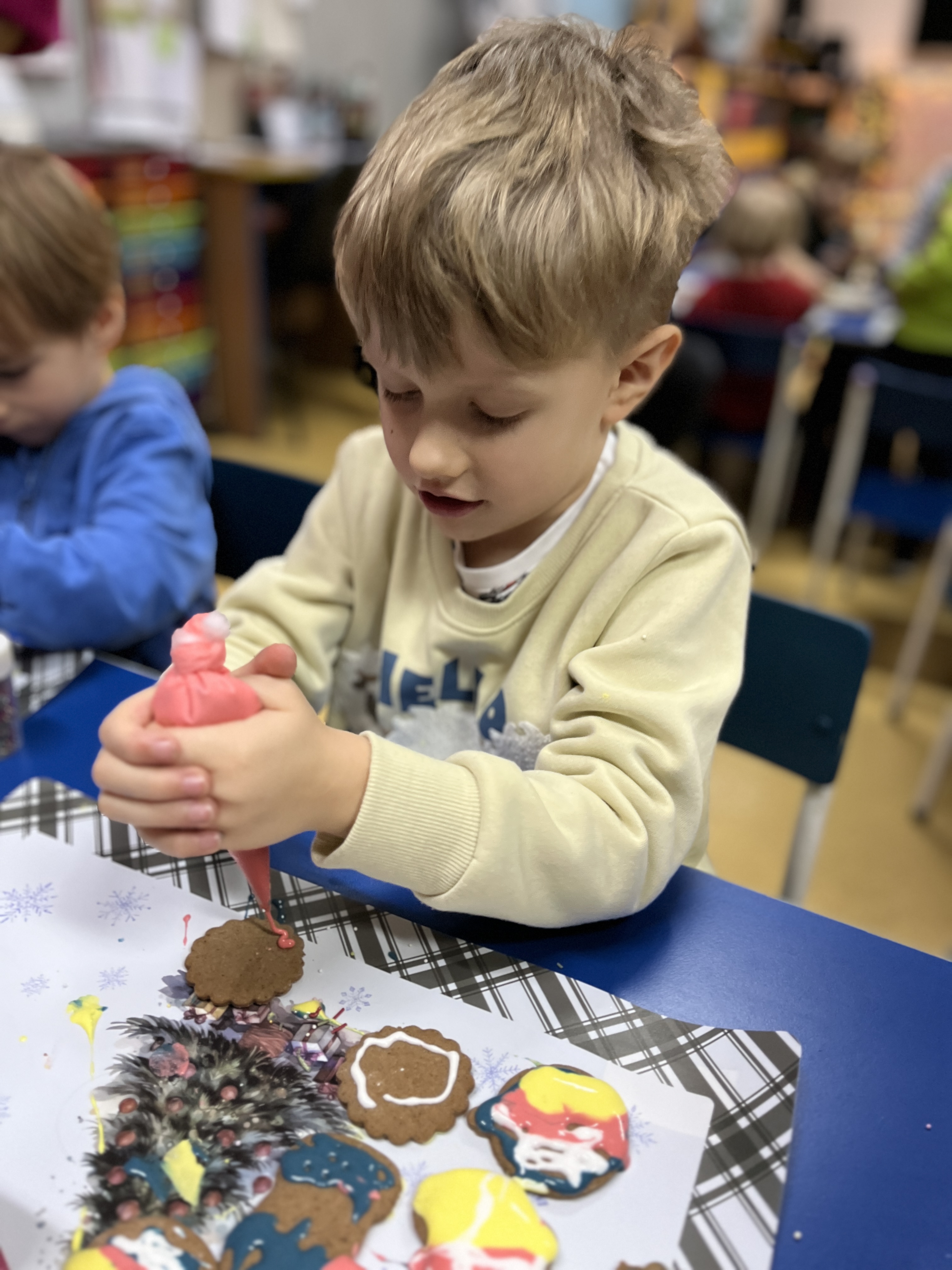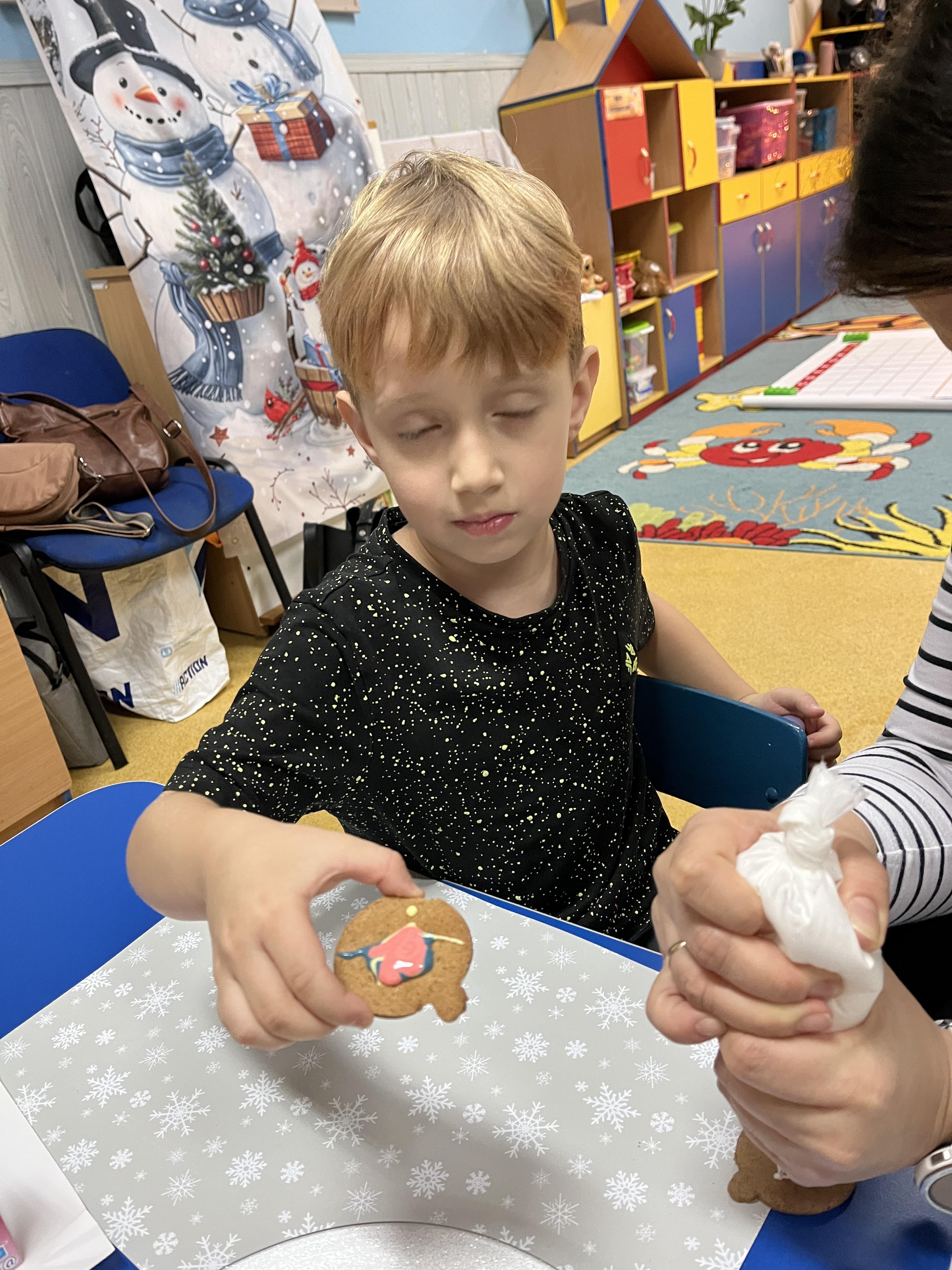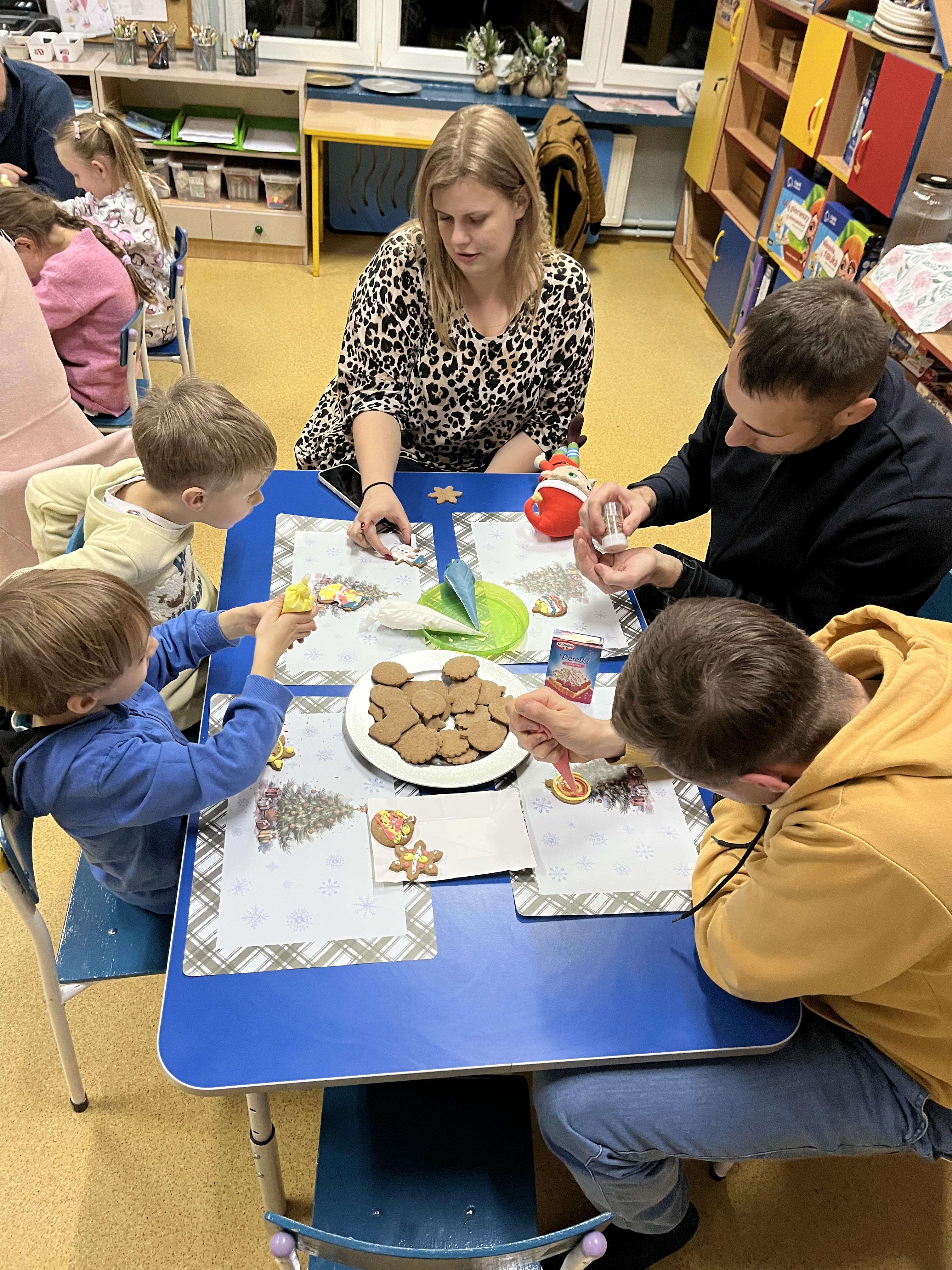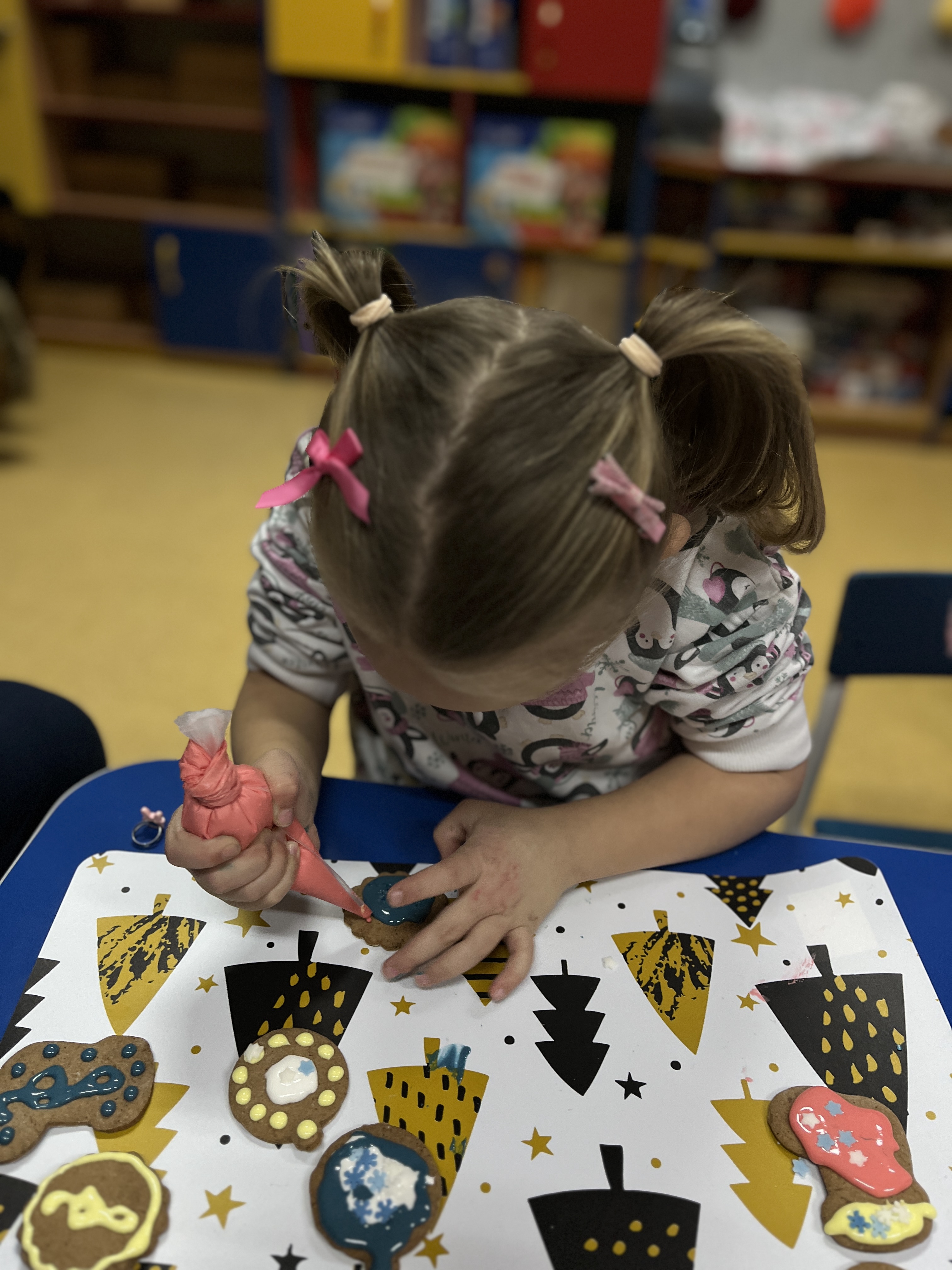 Kolejnym punktem było dekorowanie pierniczków, które dzieci przygotowały w poprzednim tygodniu. Atmosfera była swobodna, pełna uśmiechu, a zapach lukru i przypraw korzennych tylko dodawał uroku. Trudno było się powstrzymać przed spróbowaniem własnych dzieł. Te słodkości trafią na przedszkolny kiermasz już 8 grudnia.