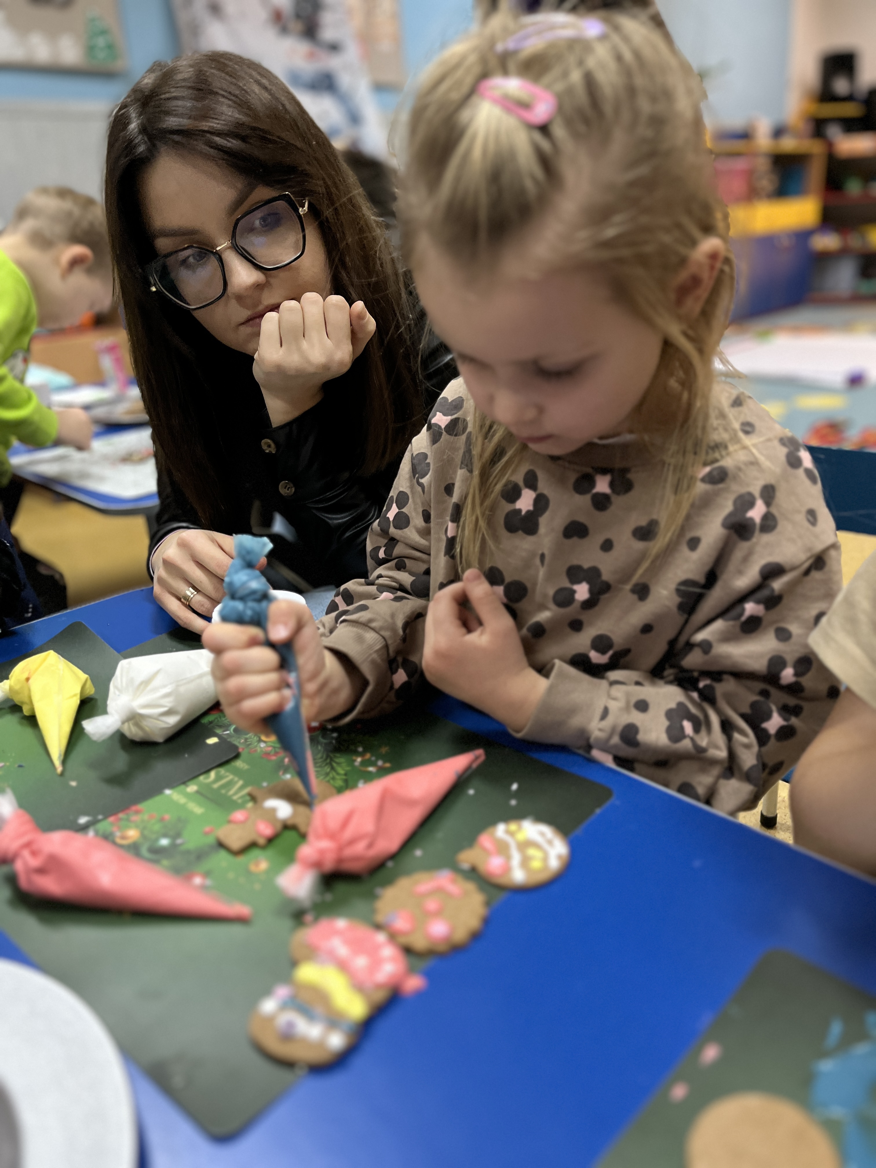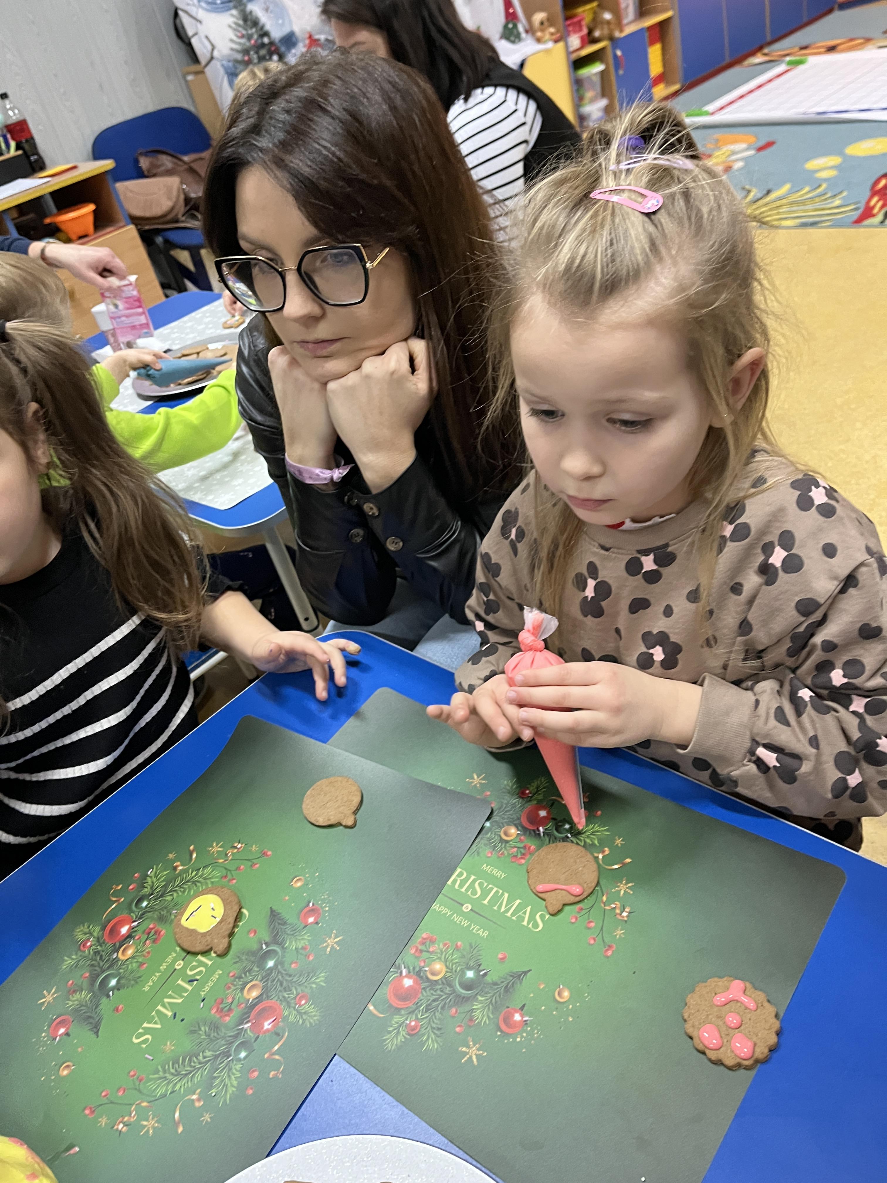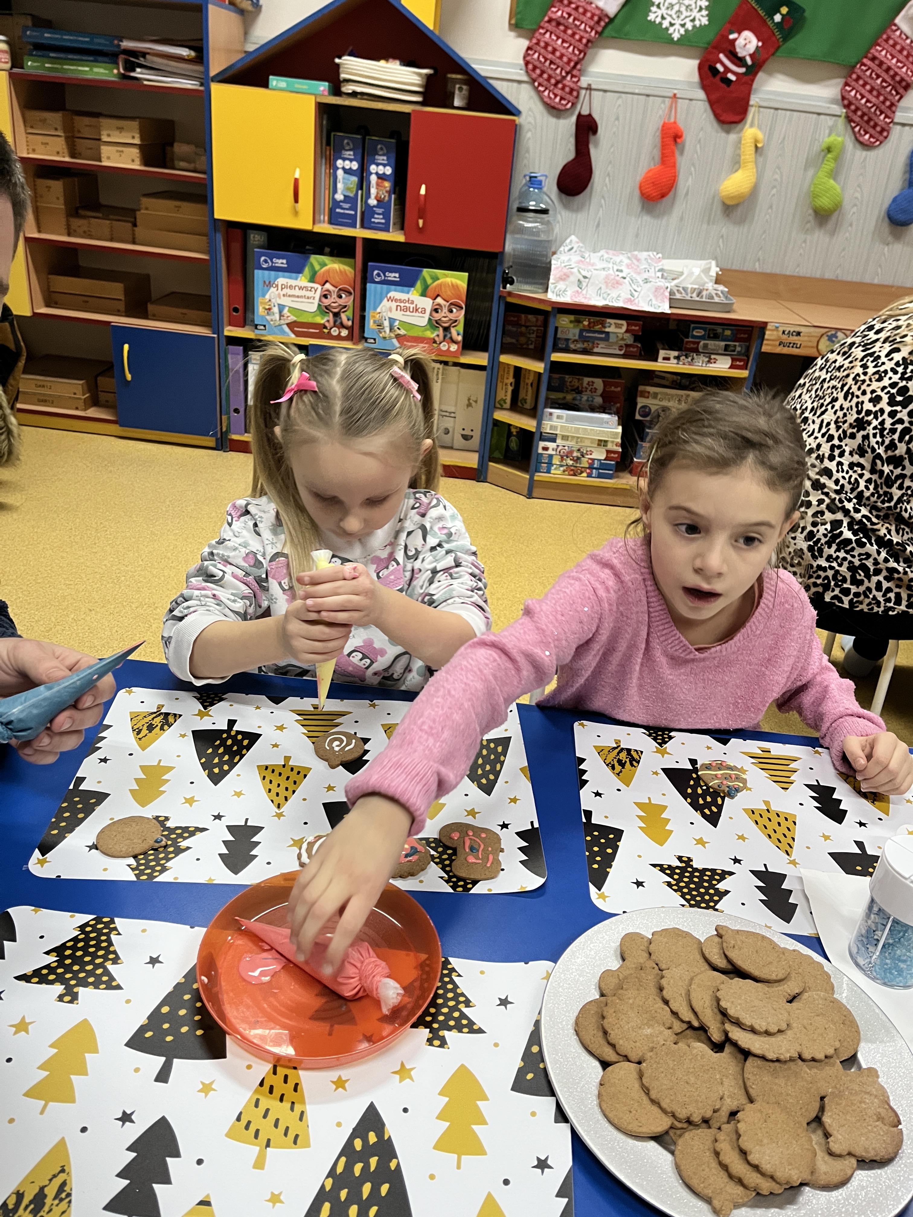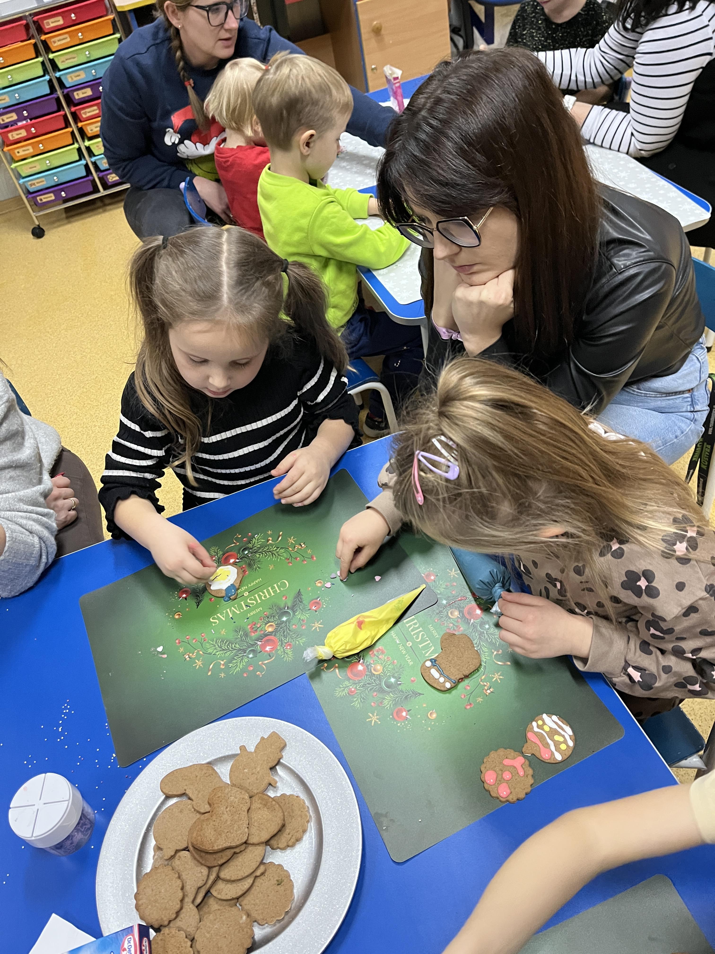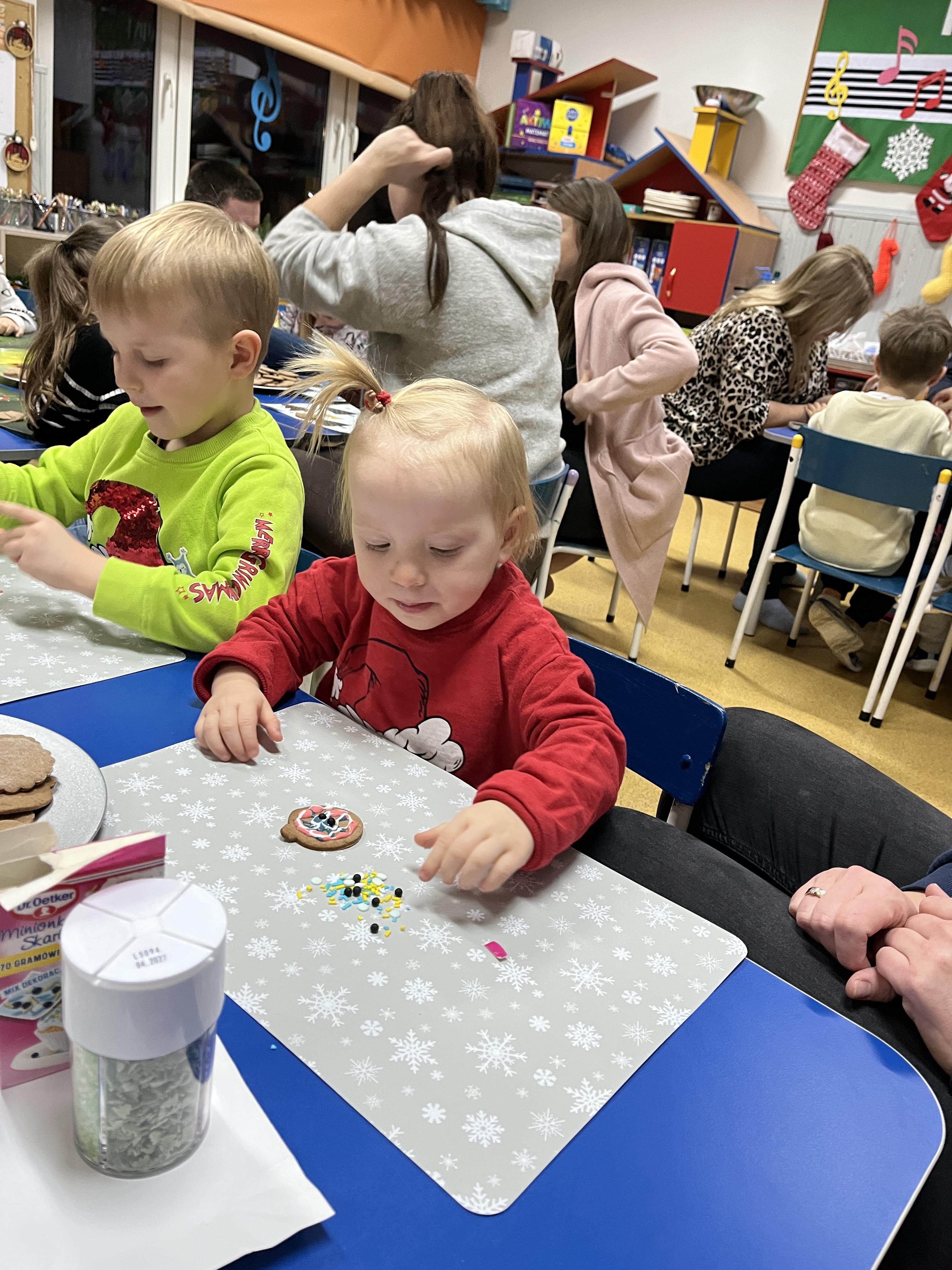 Kolejnym punktem było dekorowanie pierniczków, które dzieci przygotowały w poprzednim tygodniu. Atmosfera była swobodna, pełna uśmiechu, a zapach lukru i przypraw korzennych tylko dodawał uroku. Trudno było się powstrzymać przed spróbowaniem własnych dzieł. Te słodkości trafią na przedszkolny kiermasz już 8 grudnia.