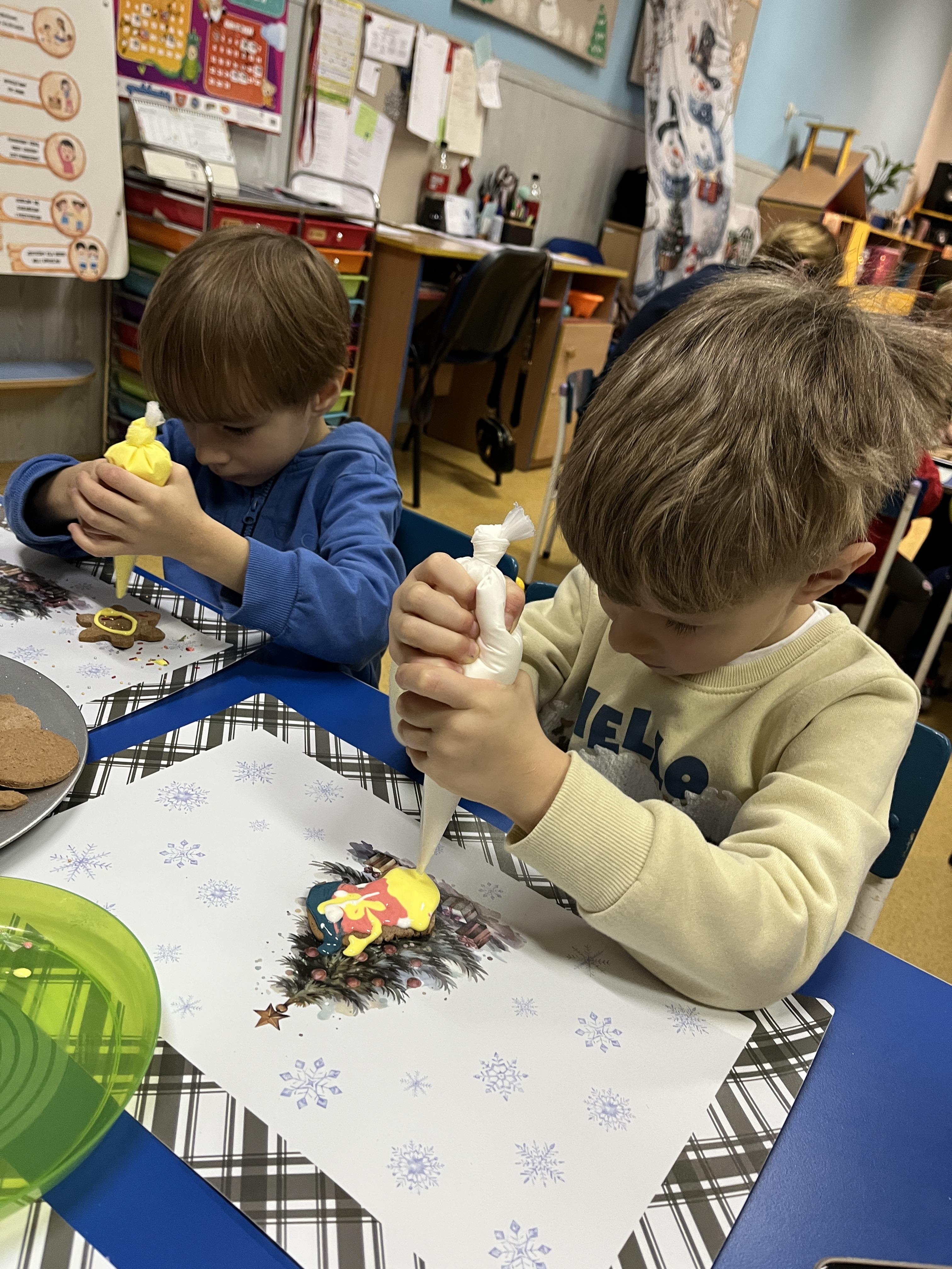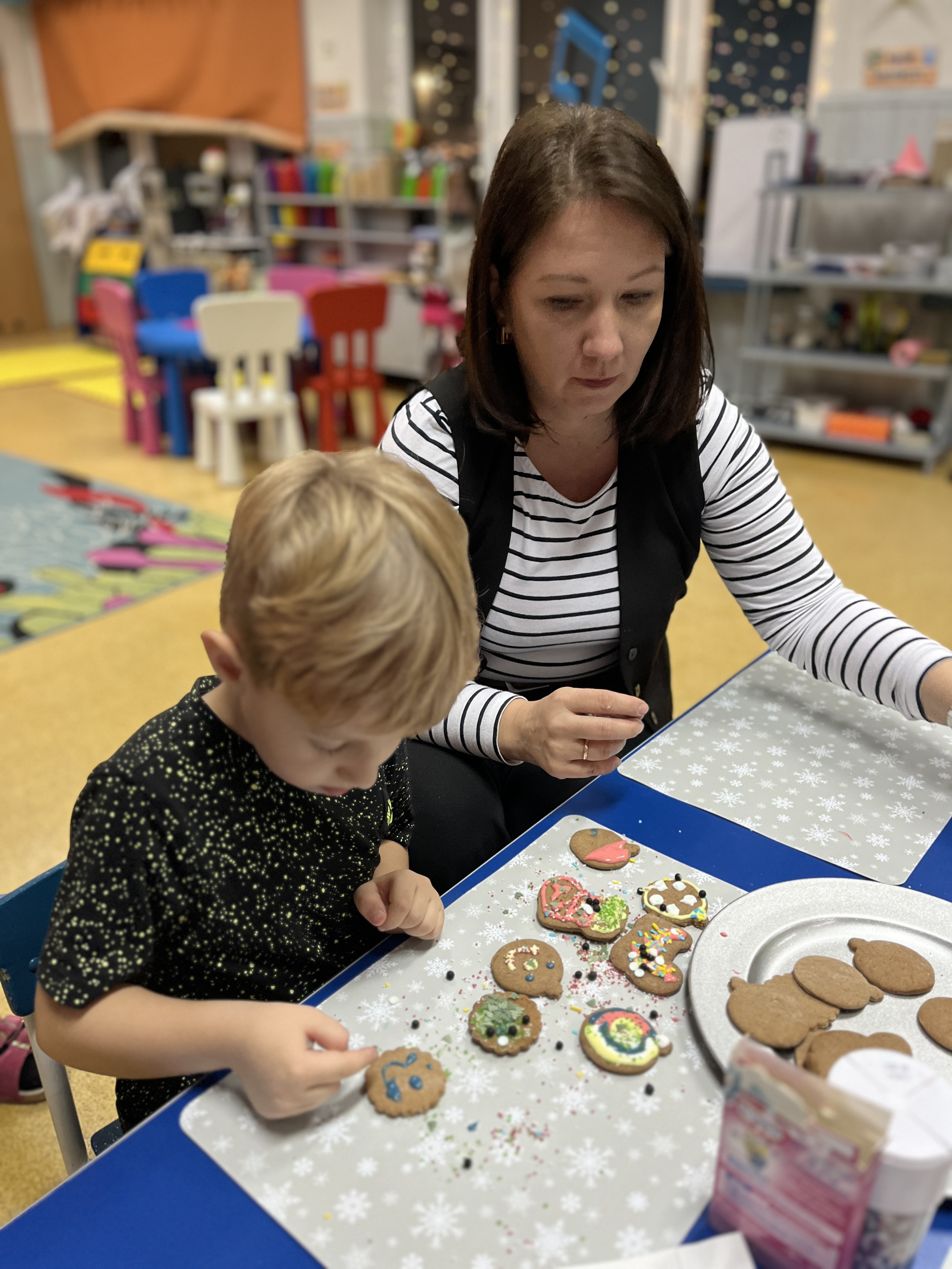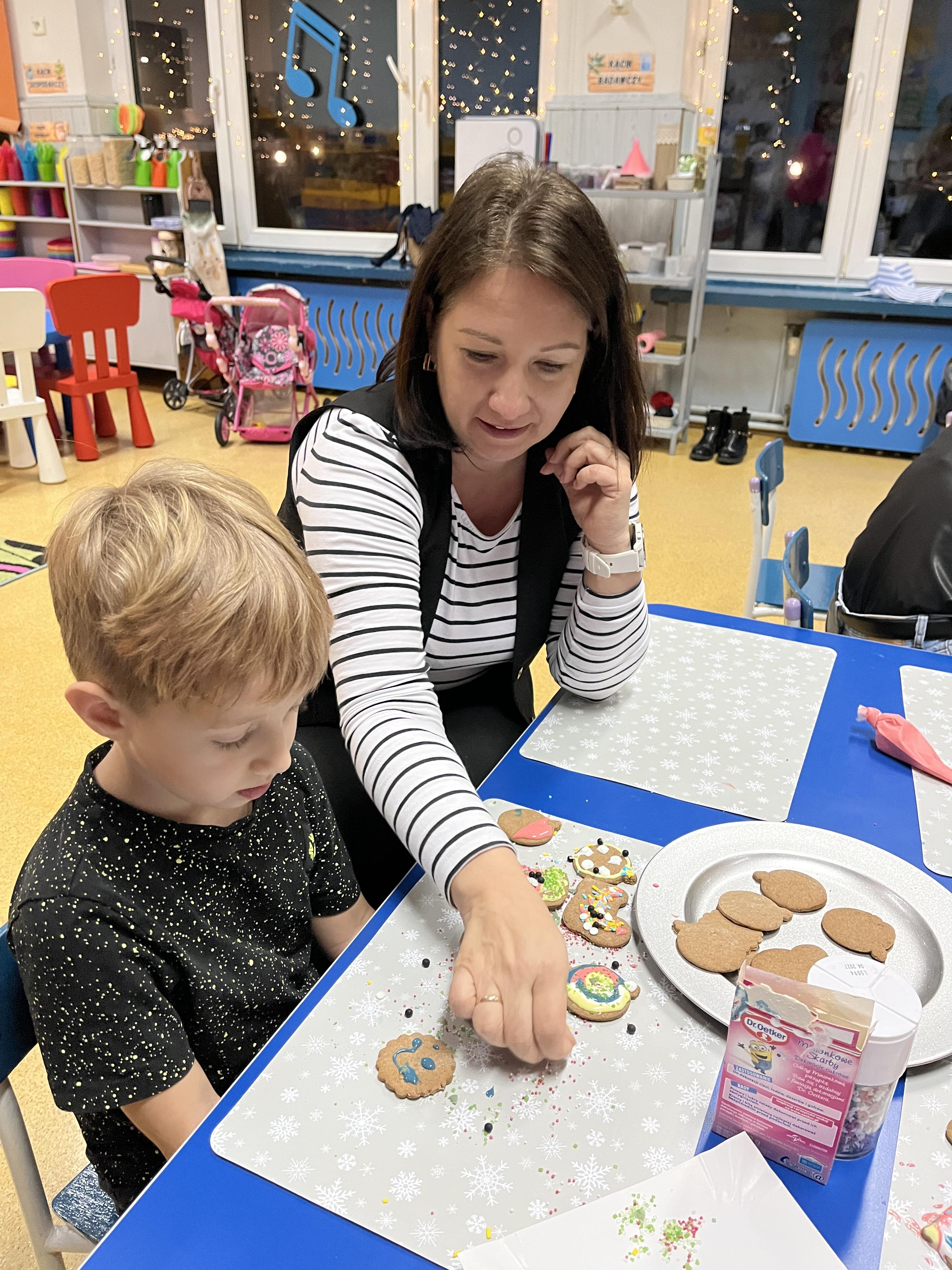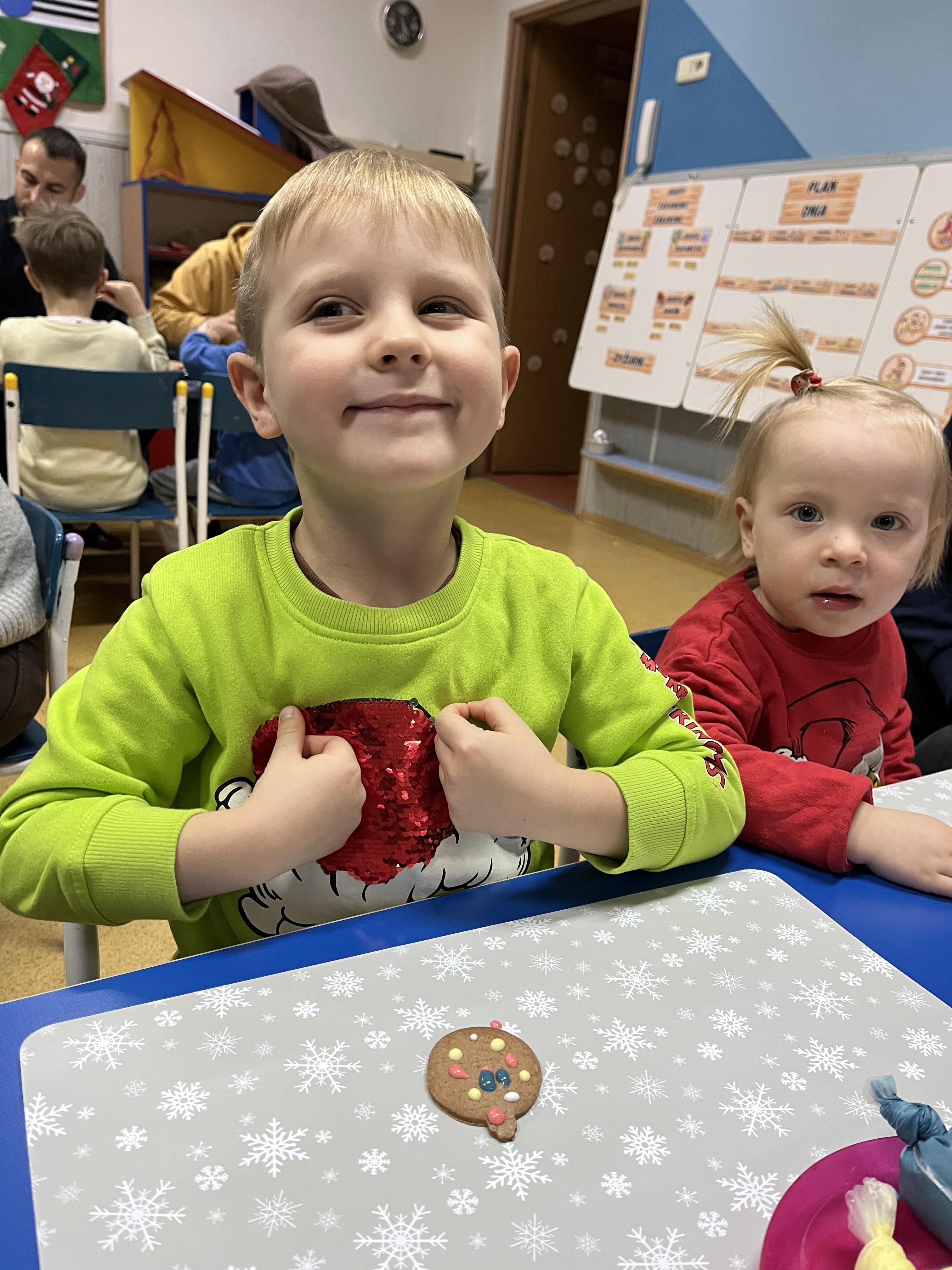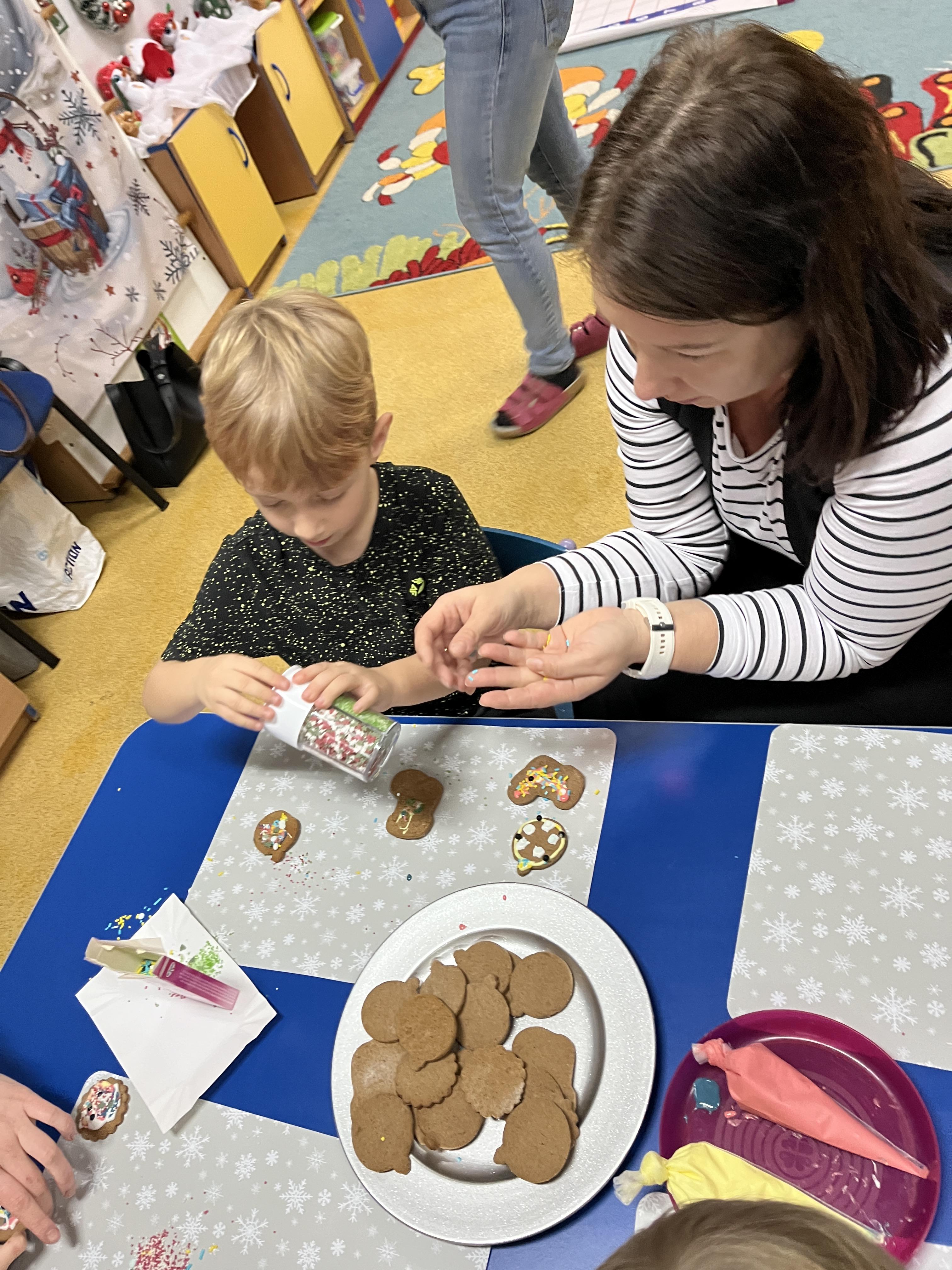 Kolejnym punktem było dekorowanie pierniczków, które dzieci przygotowały w poprzednim tygodniu. Atmosfera była swobodna, pełna uśmiechu, a zapach lukru i przypraw korzennych tylko dodawał uroku. Trudno było się powstrzymać przed spróbowaniem własnych dzieł. Te słodkości trafią na przedszkolny kiermasz już 8 grudnia.