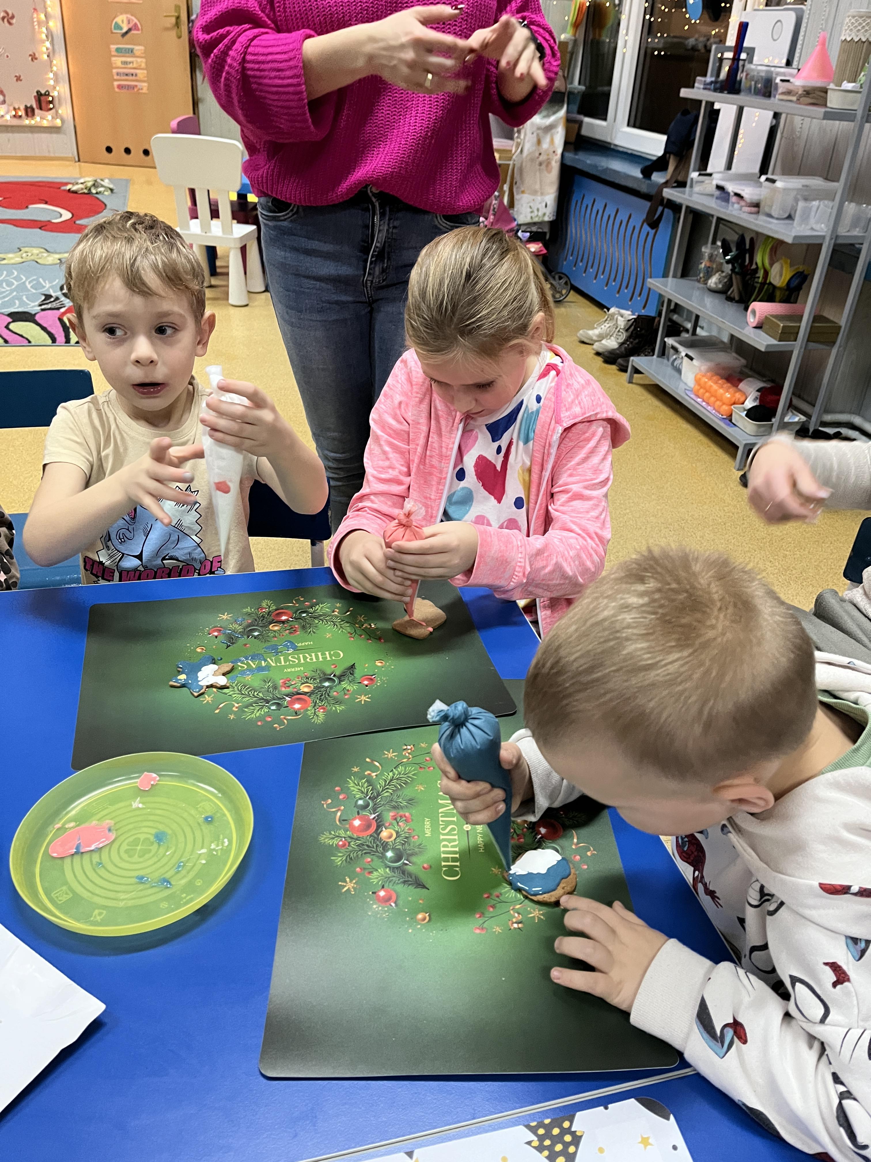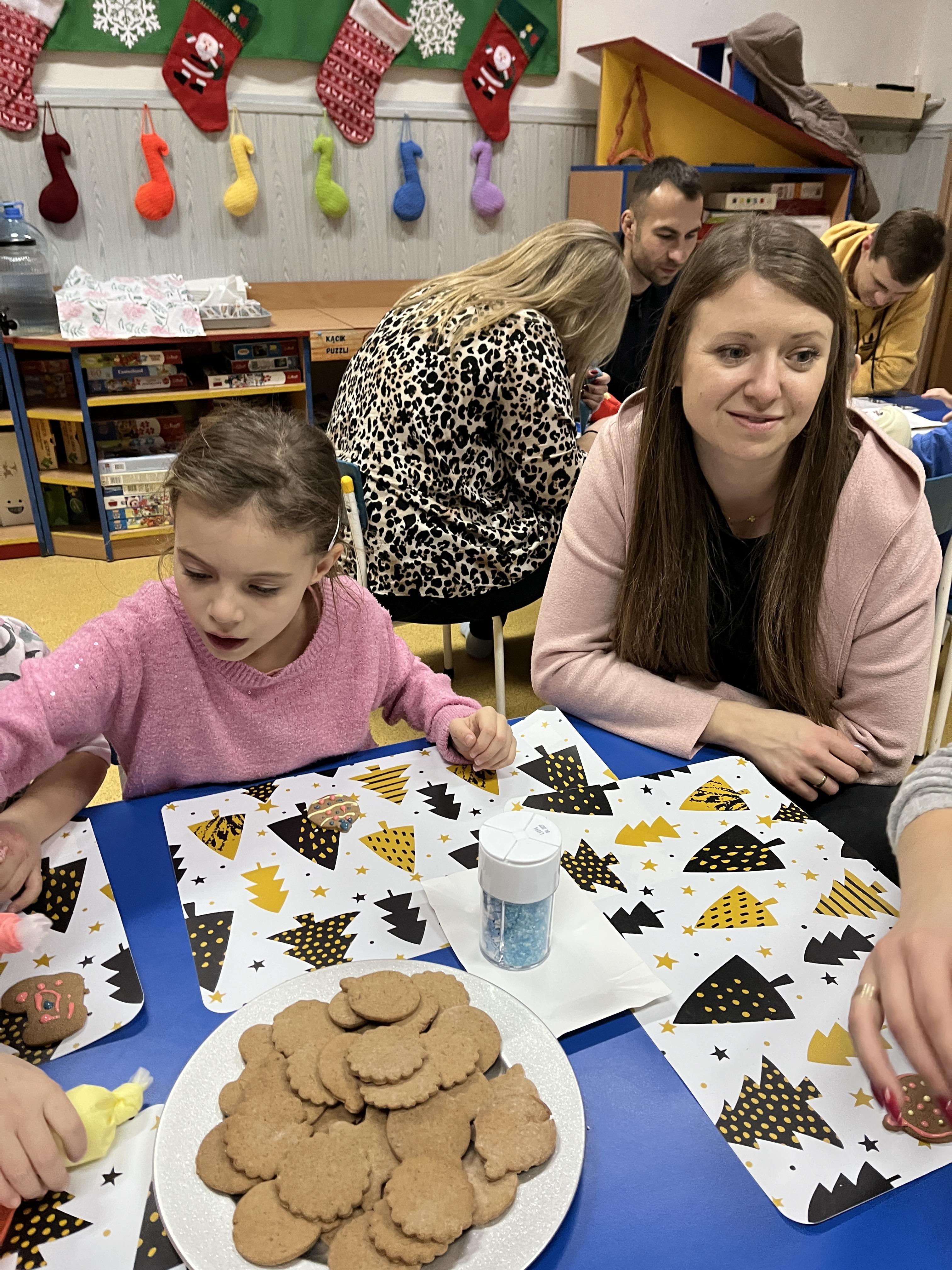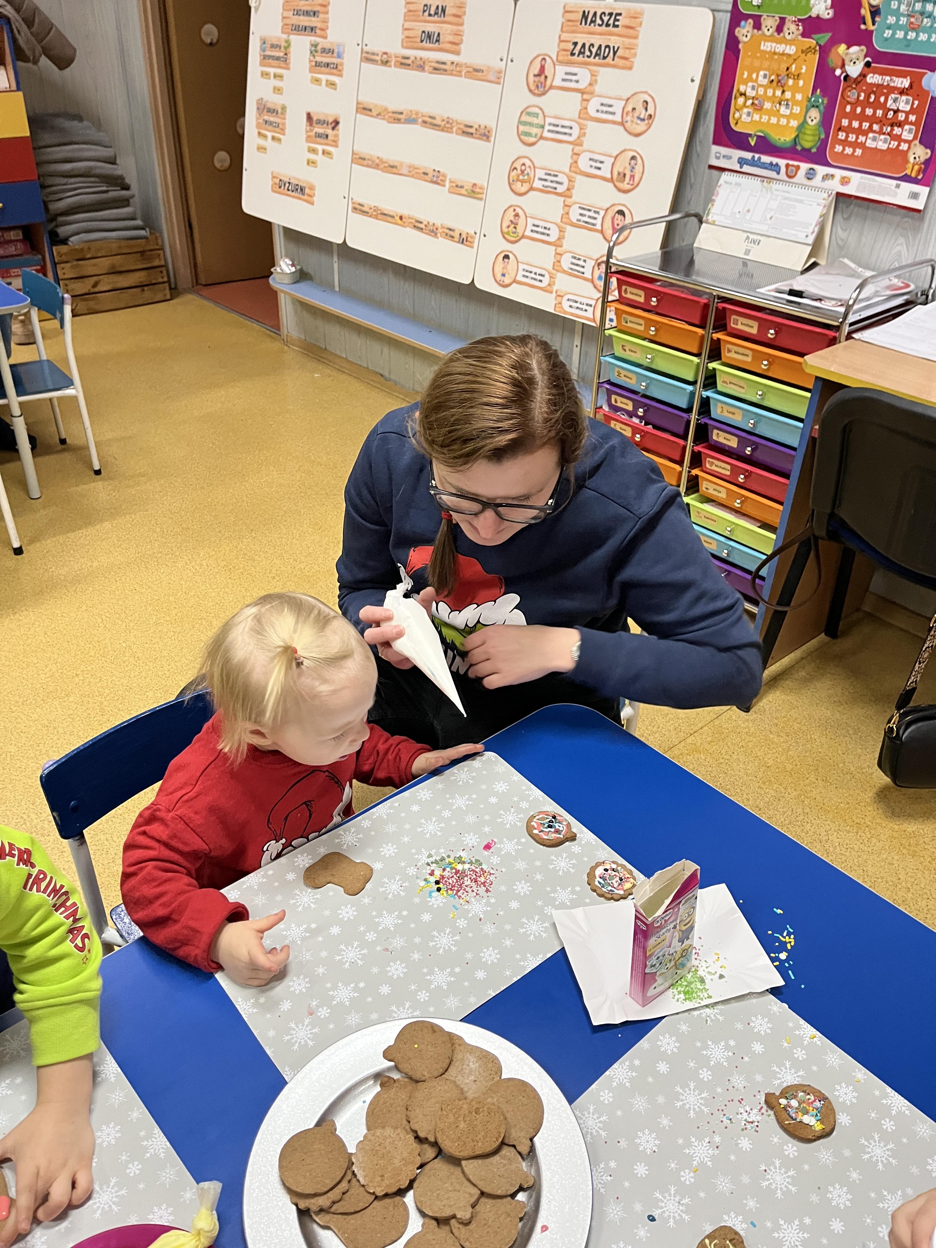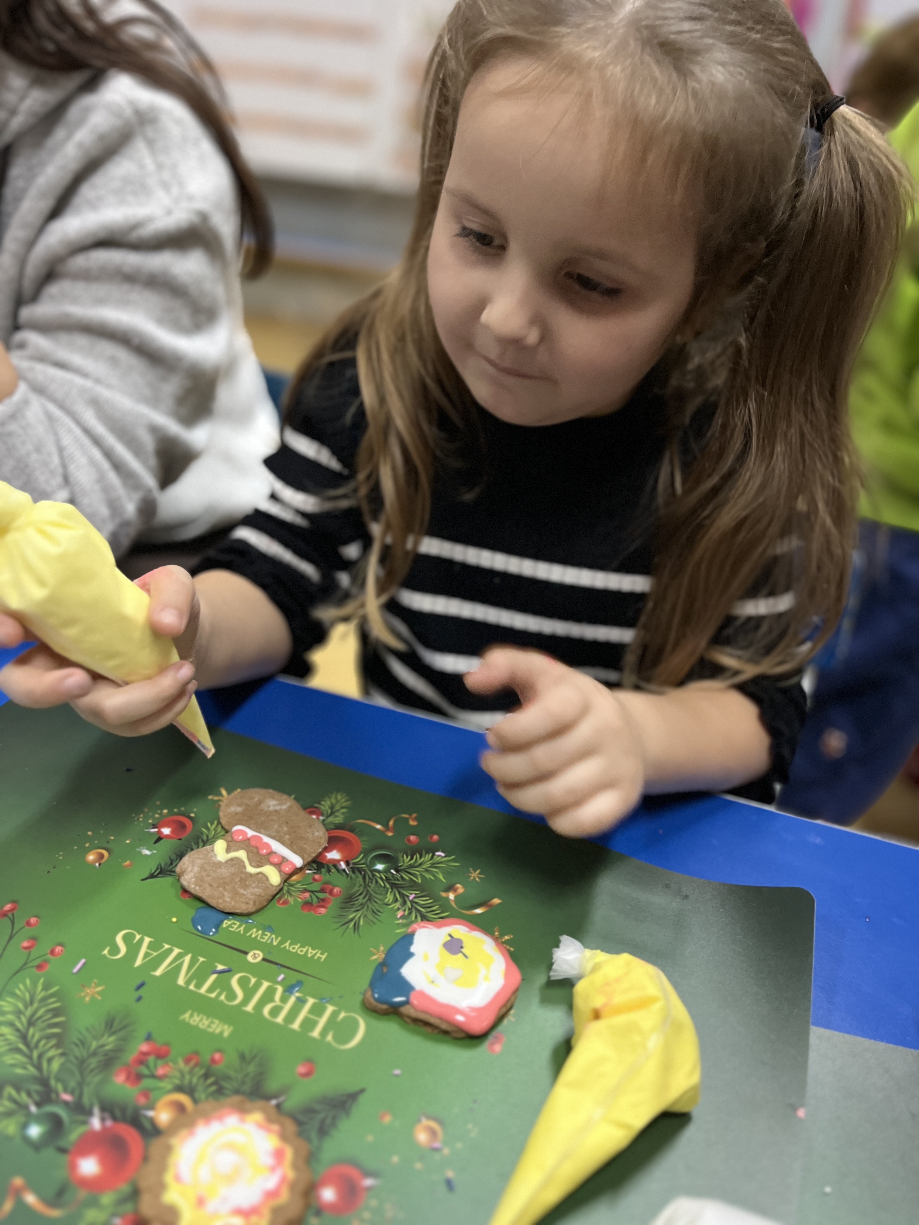 Kolejnym punktem było dekorowanie pierniczków, które dzieci przygotowały w poprzednim tygodniu. Atmosfera była swobodna, pełna uśmiechu, a zapach lukru i przypraw korzennych tylko dodawał uroku. Trudno było się powstrzymać przed spróbowaniem własnych dzieł. Te słodkości trafią na przedszkolny kiermasz już 8 grudnia.