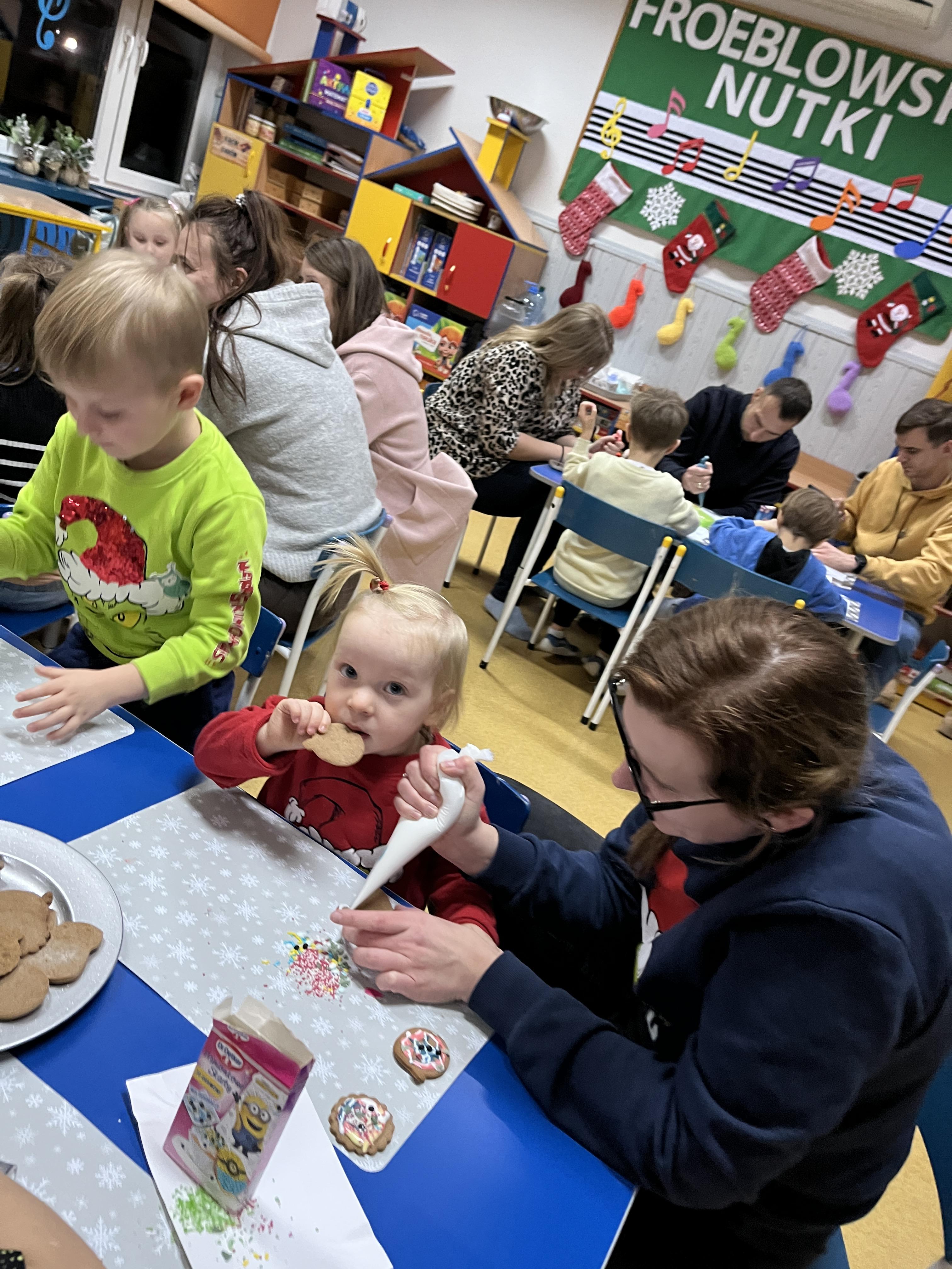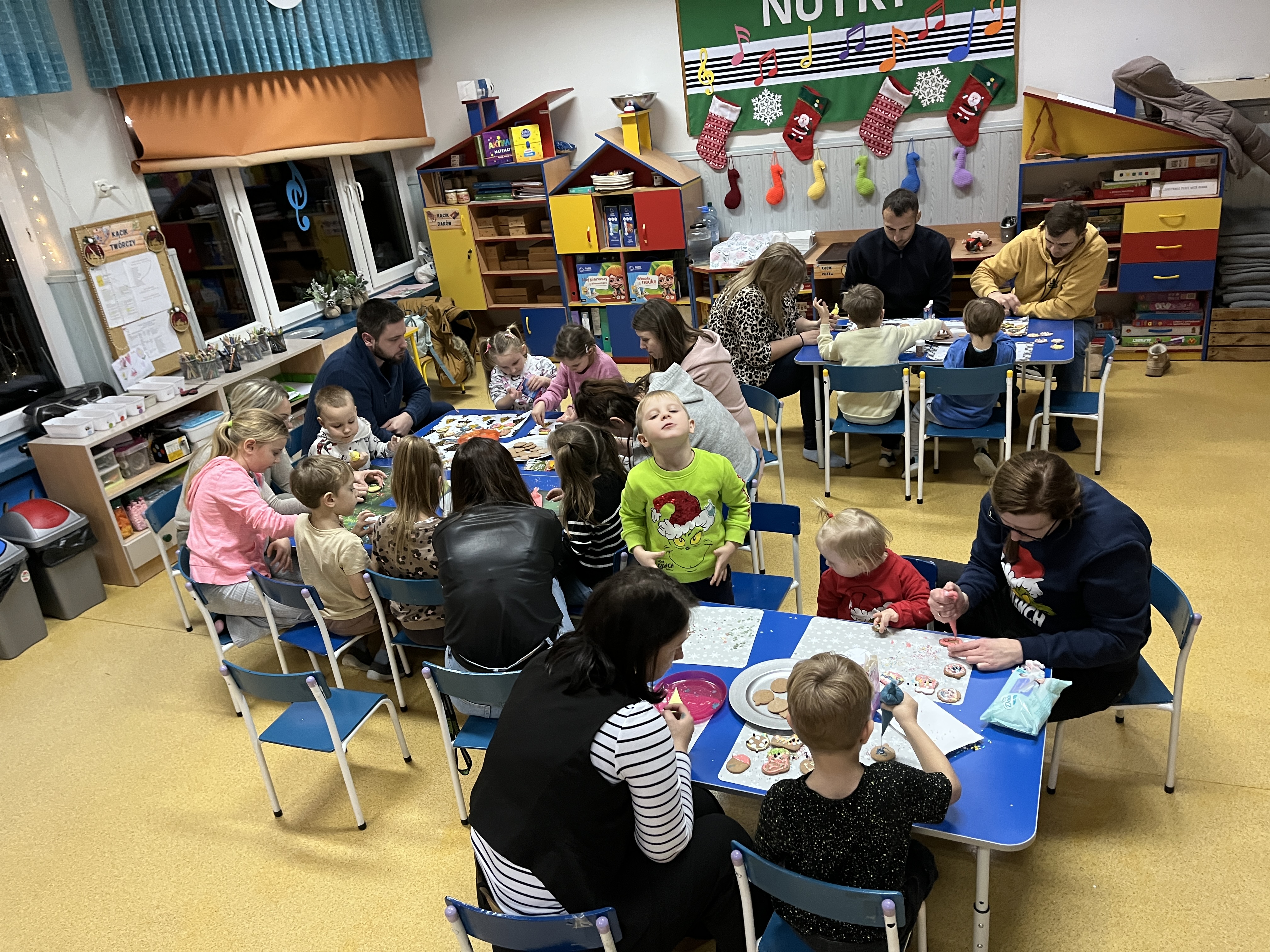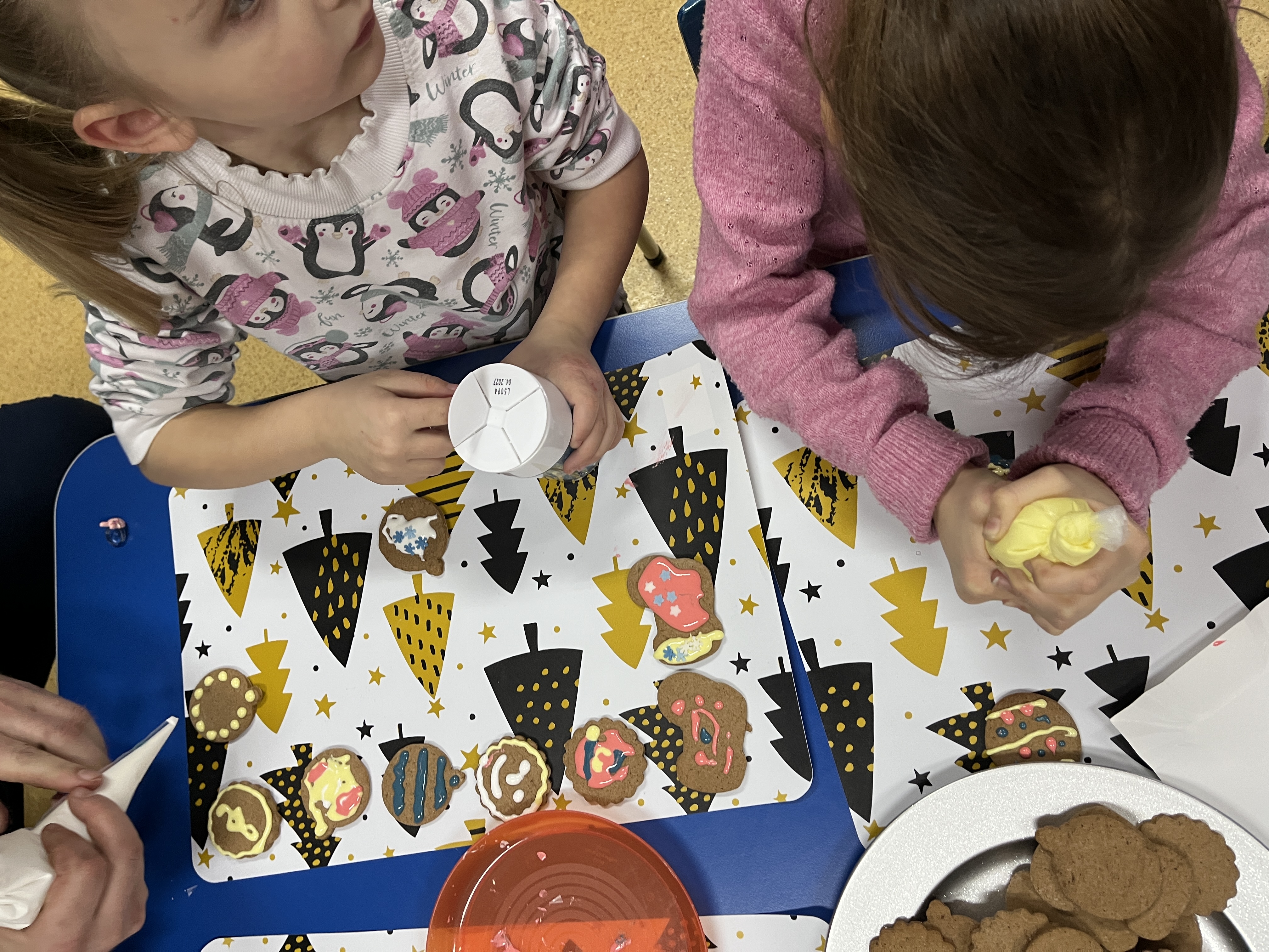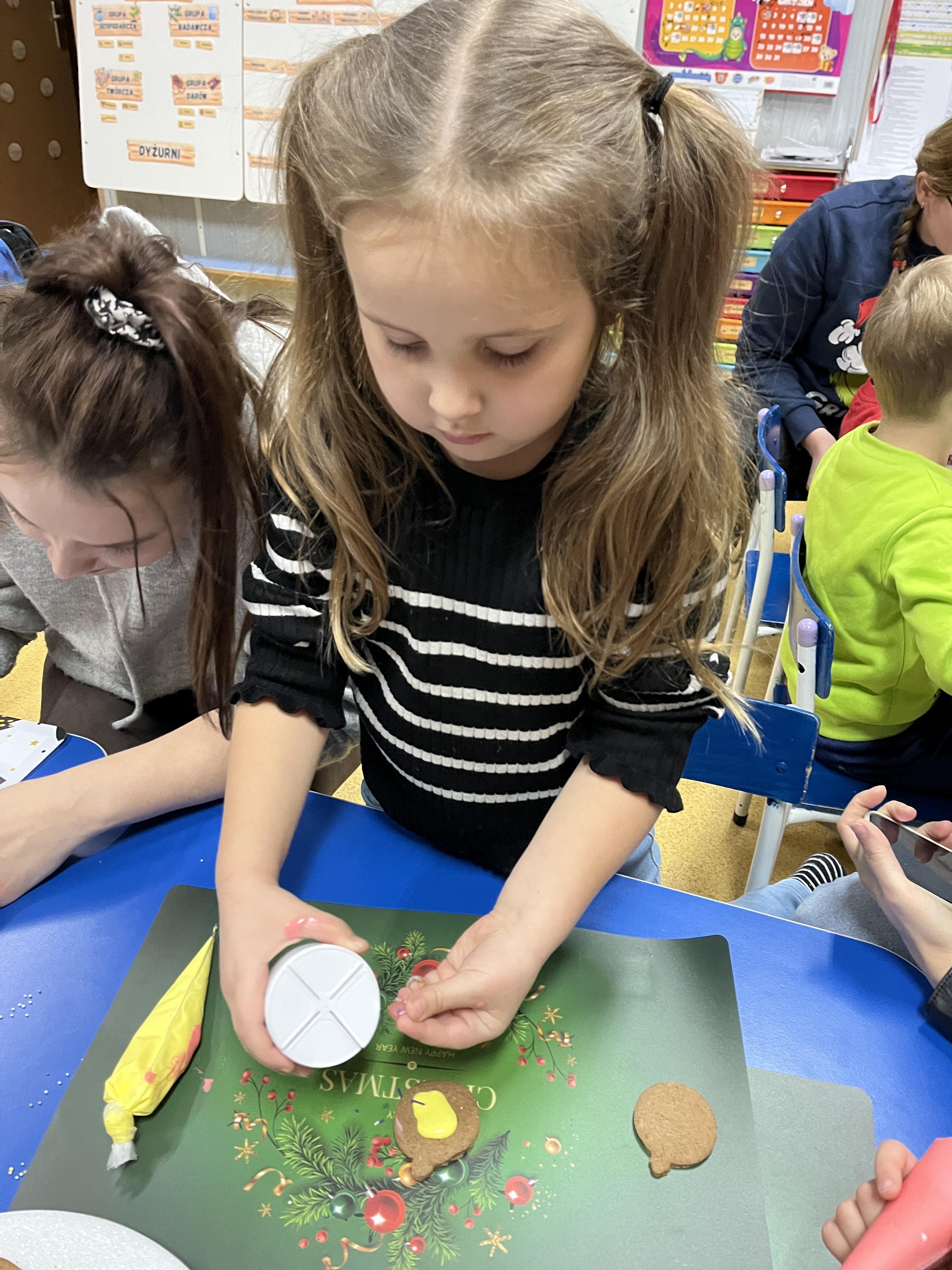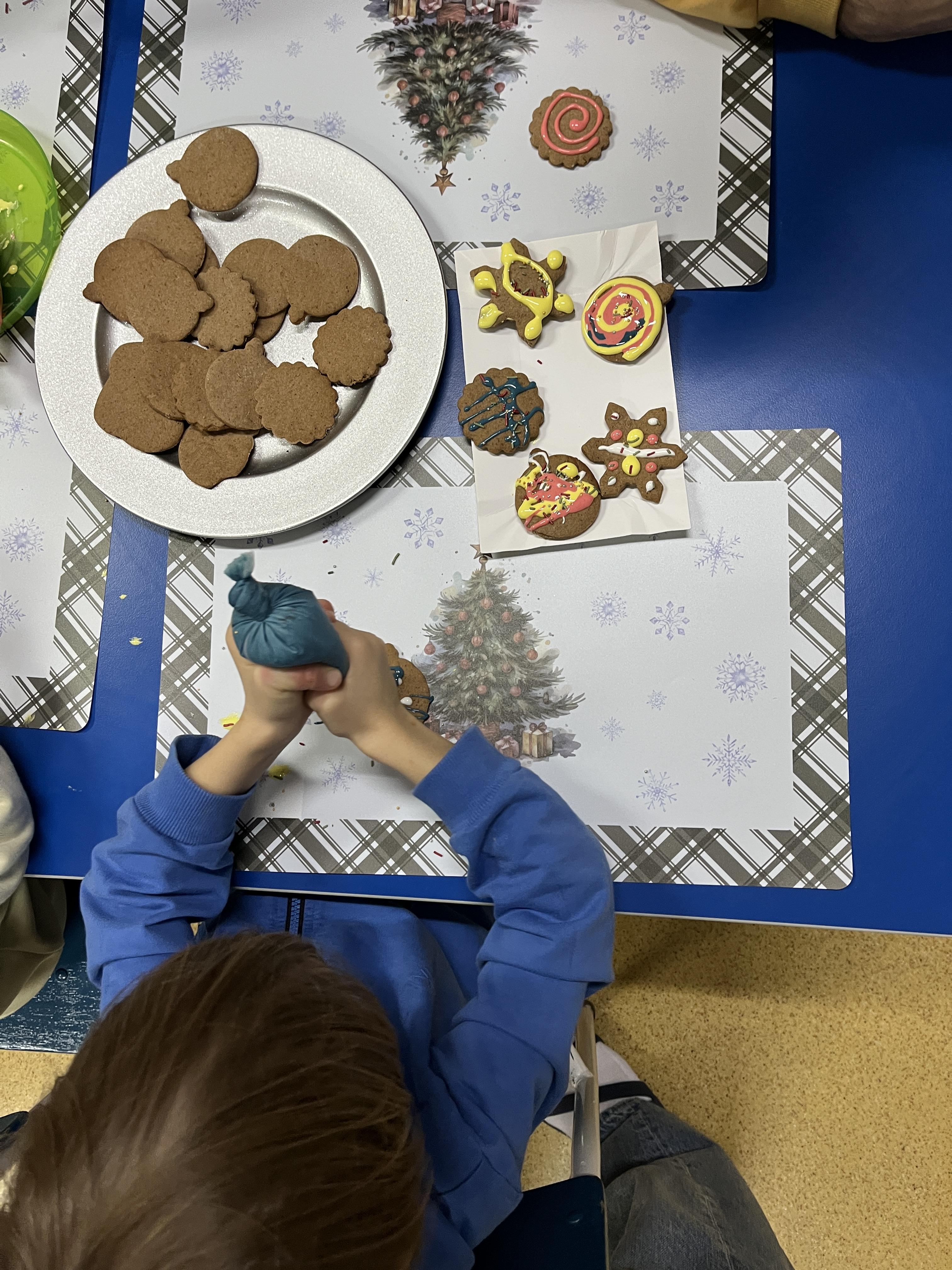 Kolejnym punktem było dekorowanie pierniczków, które dzieci przygotowały w poprzednim tygodniu. Atmosfera była swobodna, pełna uśmiechu, a zapach lukru i przypraw korzennych tylko dodawał uroku. Trudno było się powstrzymać przed spróbowaniem własnych dzieł. Te słodkości trafią na przedszkolny kiermasz już 8 grudnia.