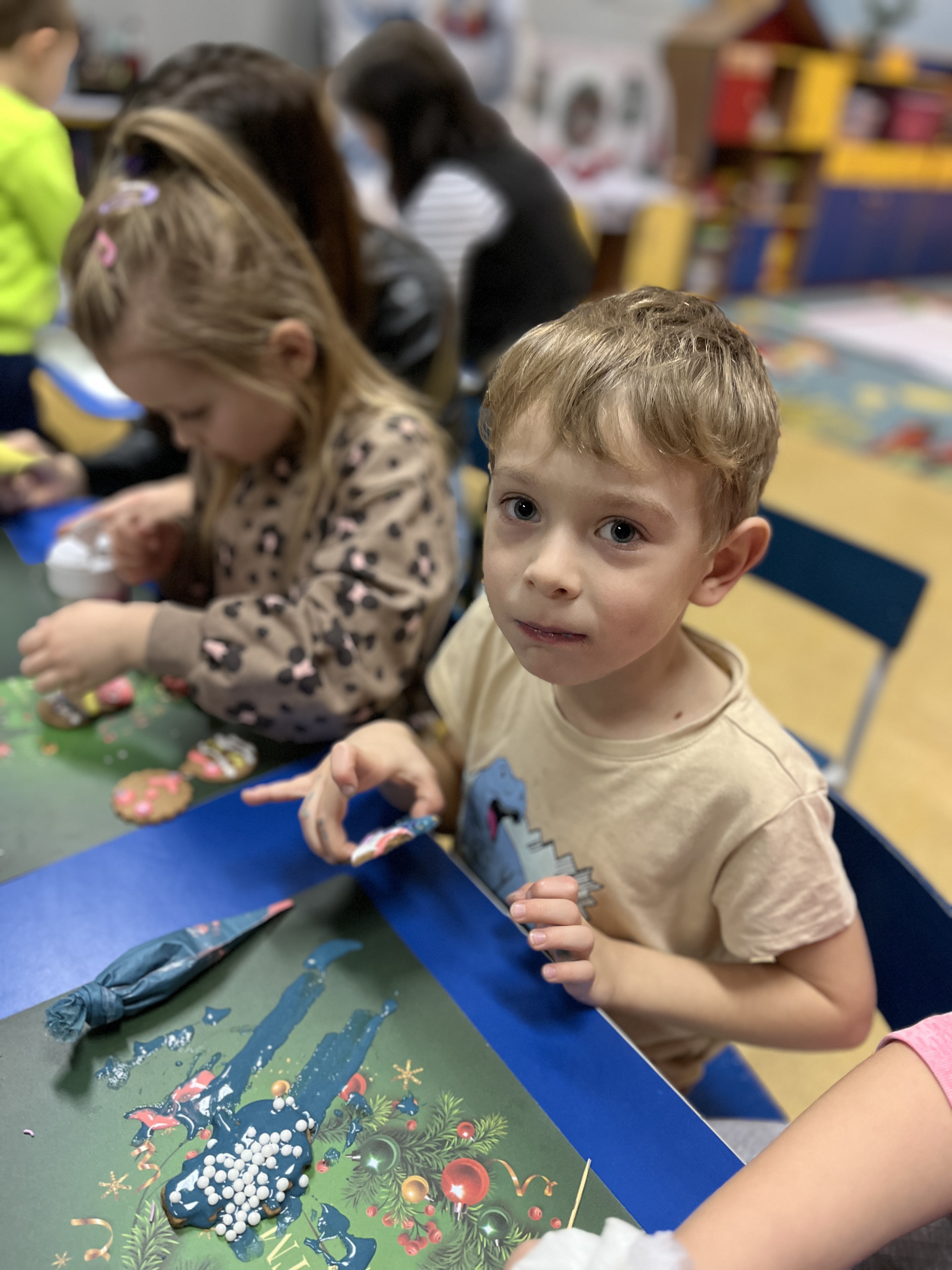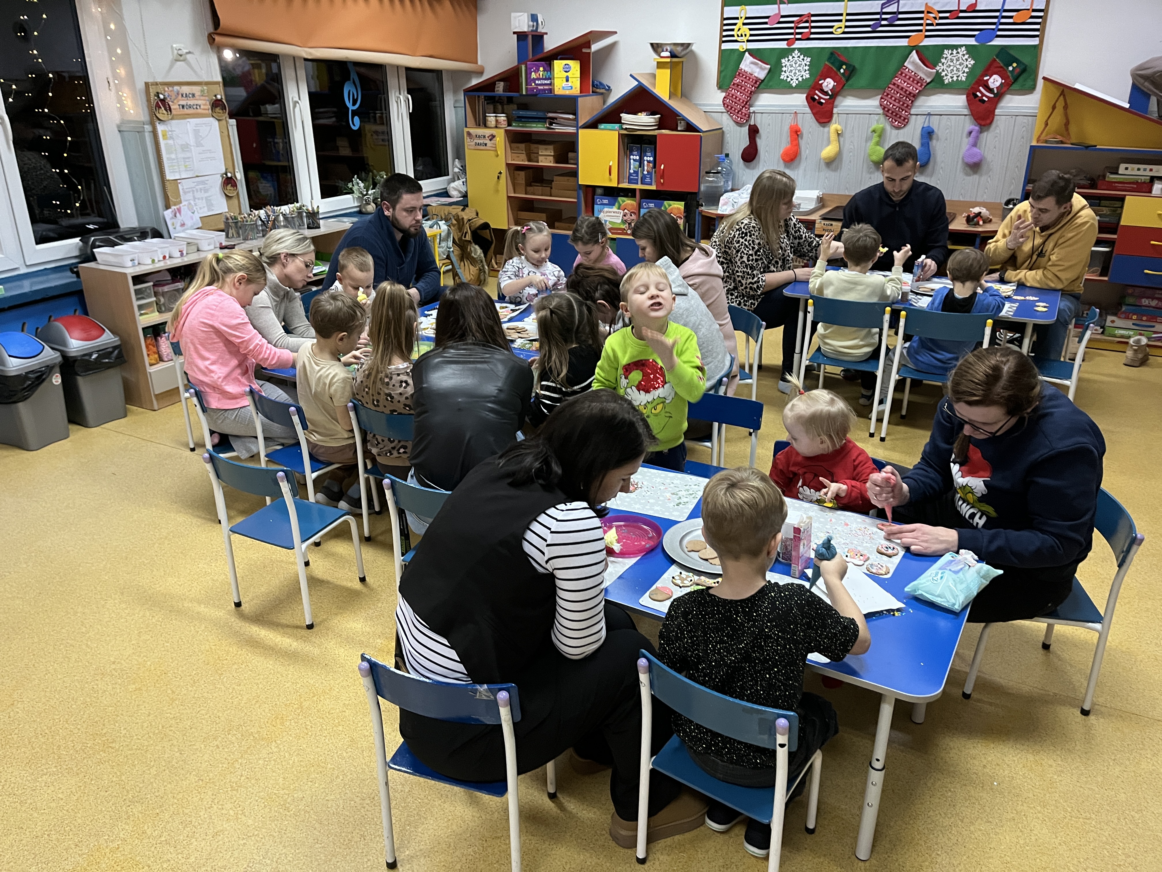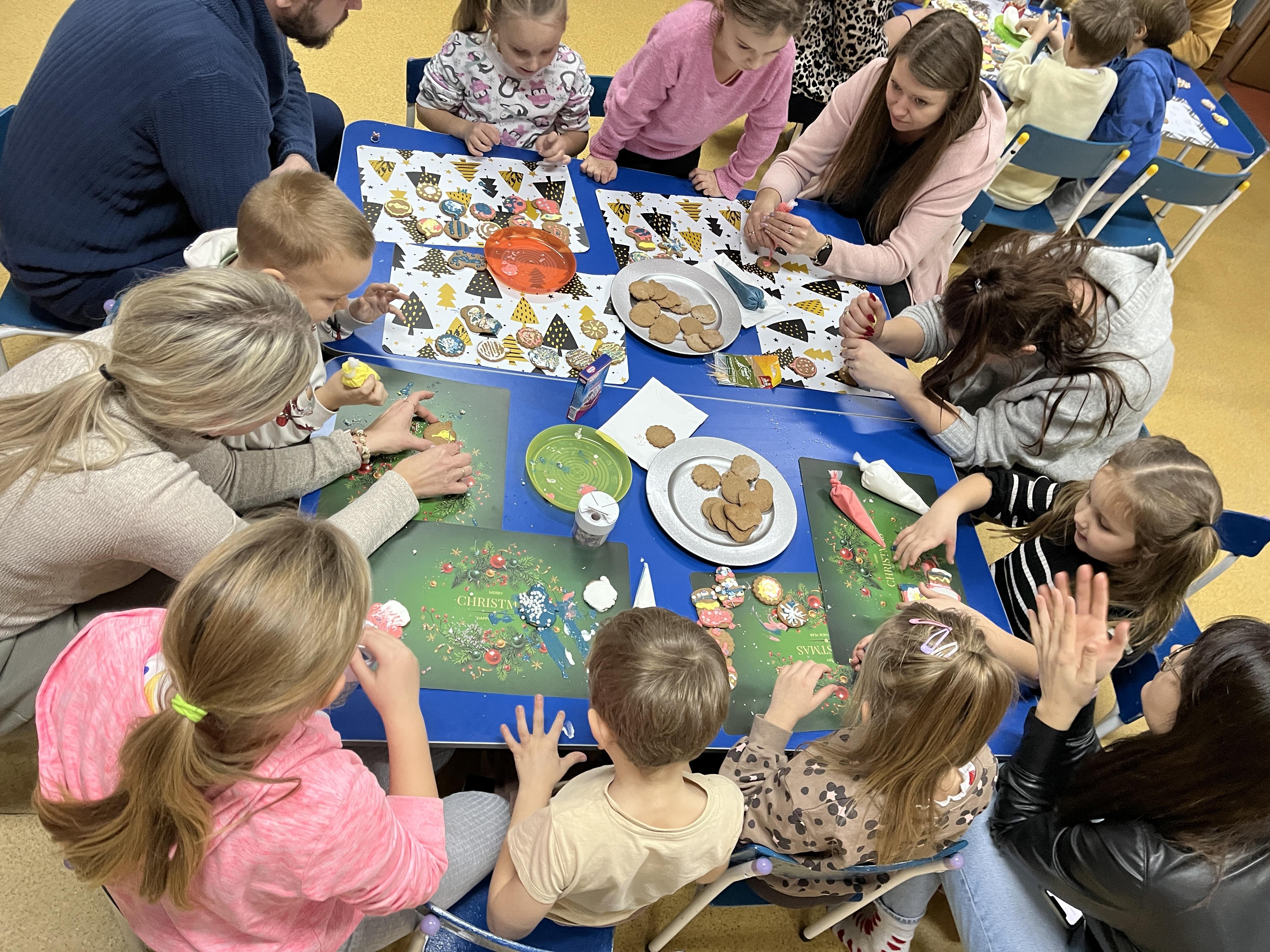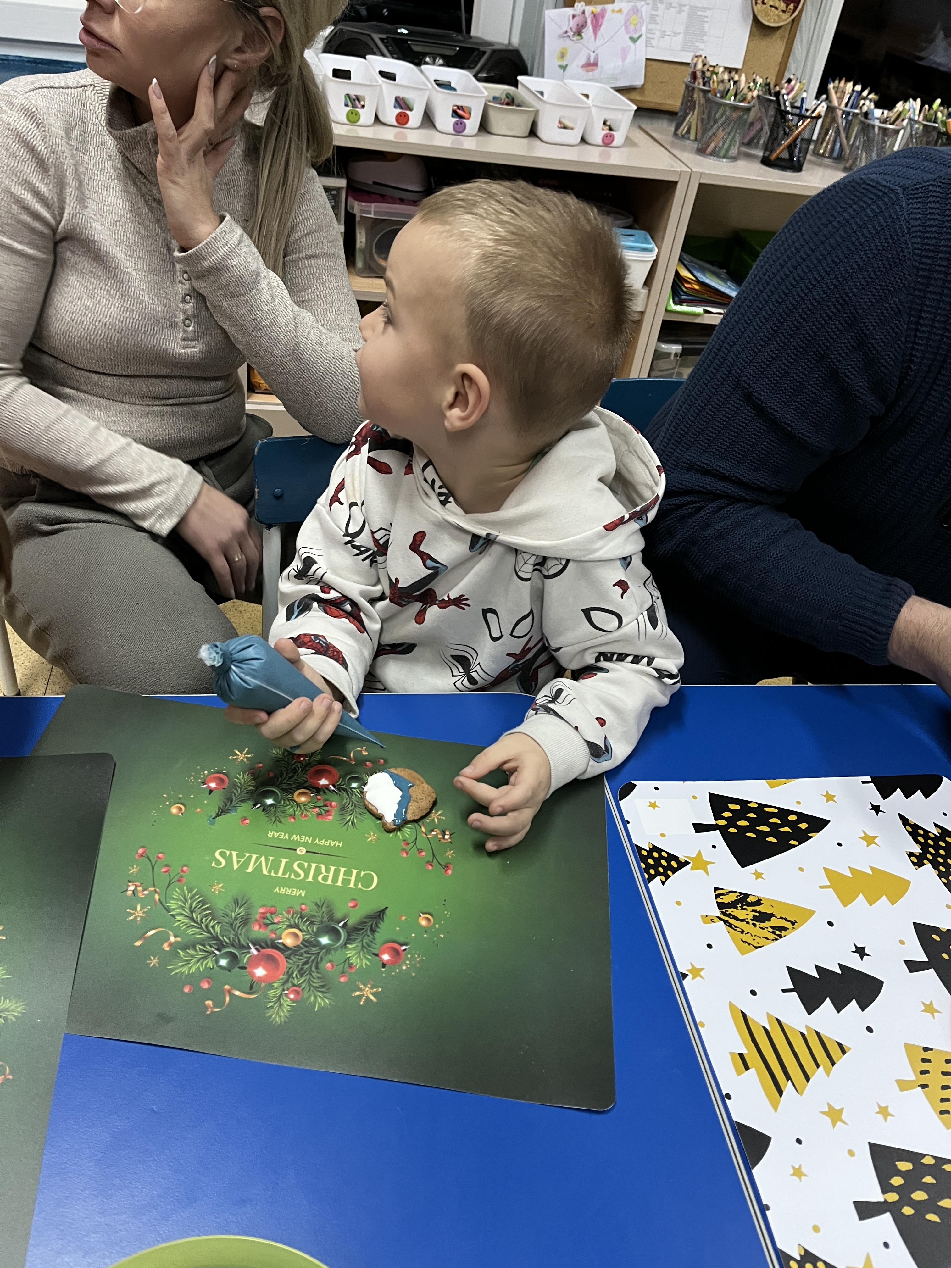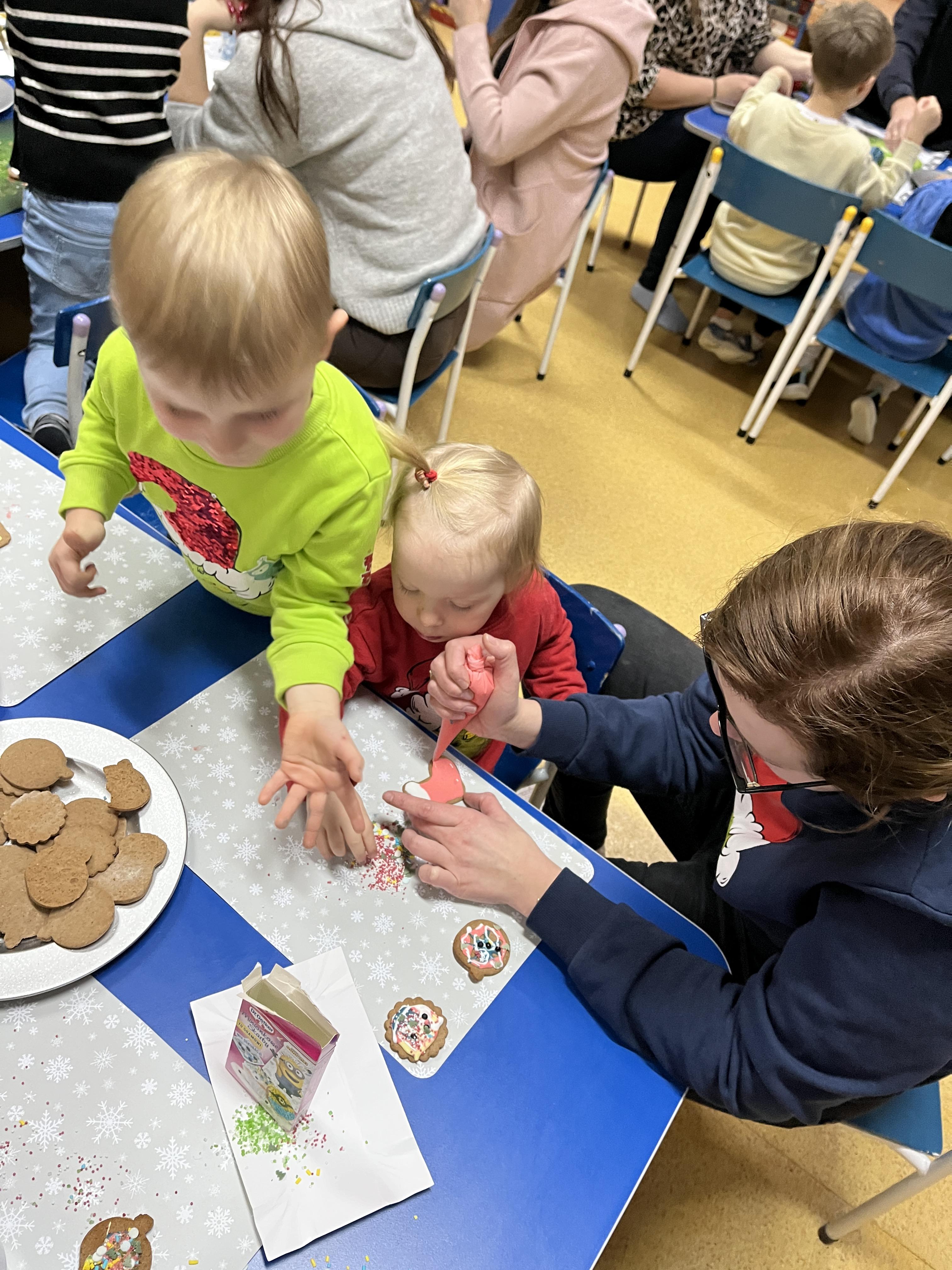 Kolejnym punktem było dekorowanie pierniczków, które dzieci przygotowały w poprzednim tygodniu. Atmosfera była swobodna, pełna uśmiechu, a zapach lukru i przypraw korzennych tylko dodawał uroku. Trudno było się powstrzymać przed spróbowaniem własnych dzieł. Te słodkości trafią na przedszkolny kiermasz już 8 grudnia.