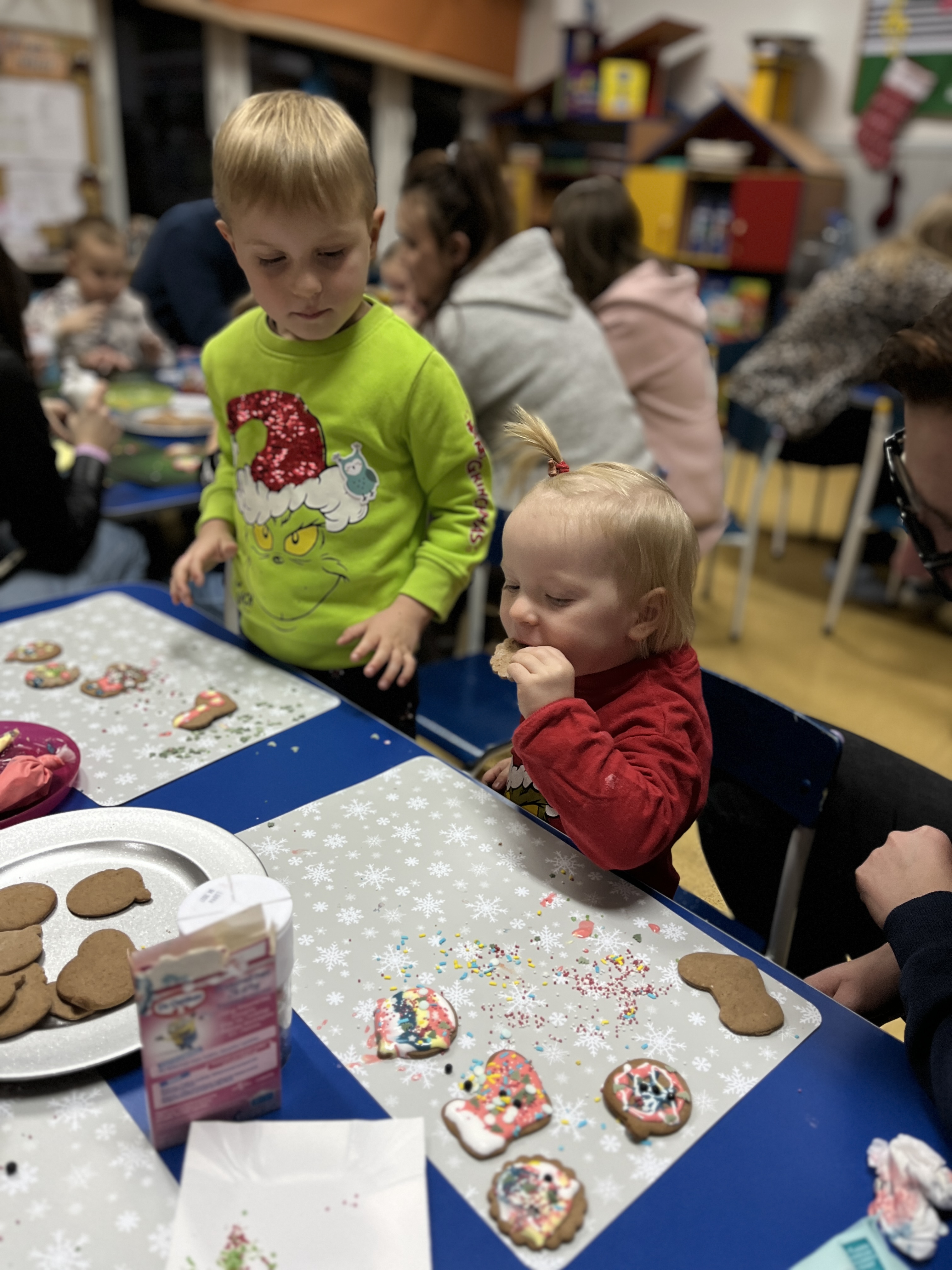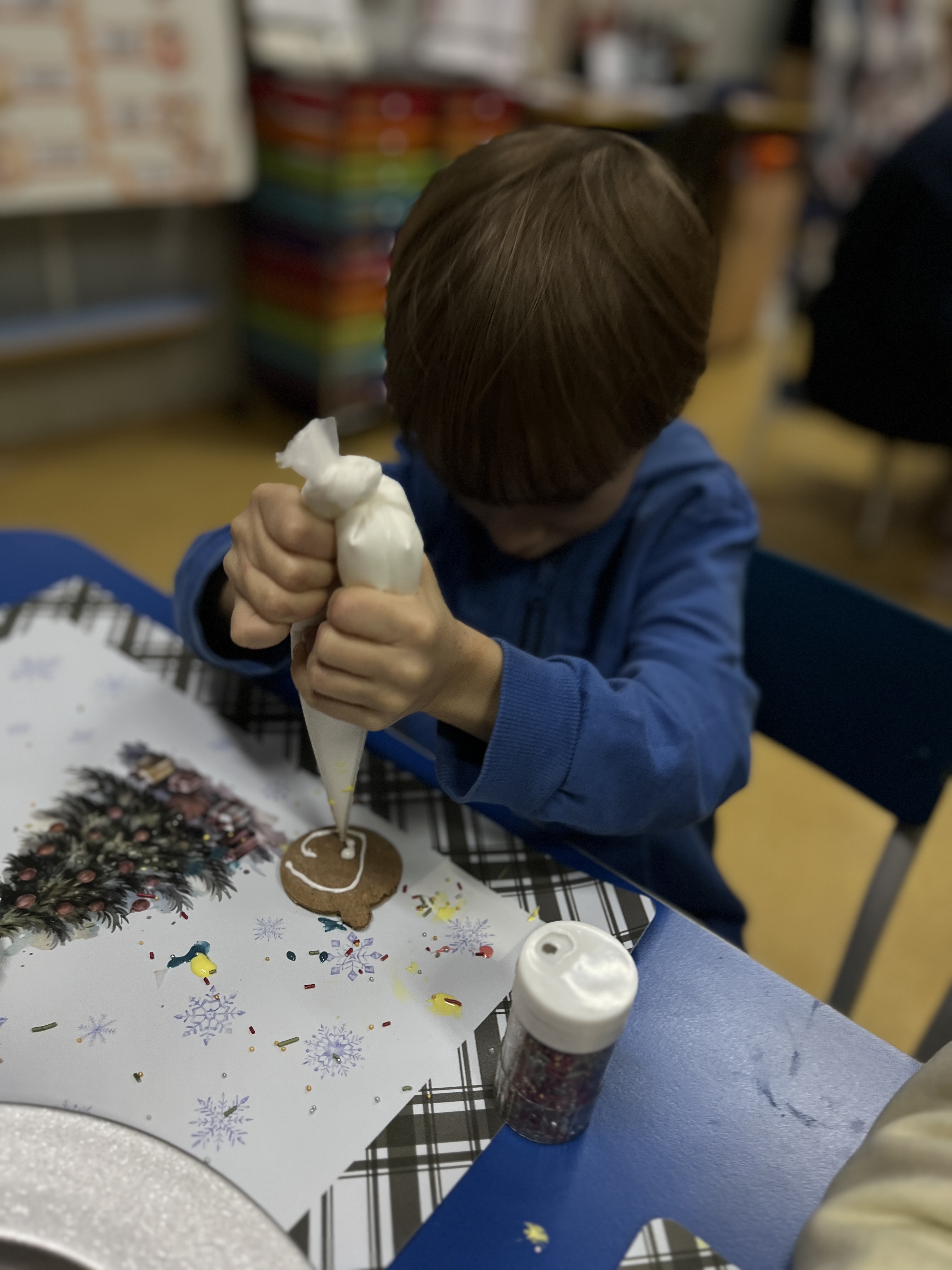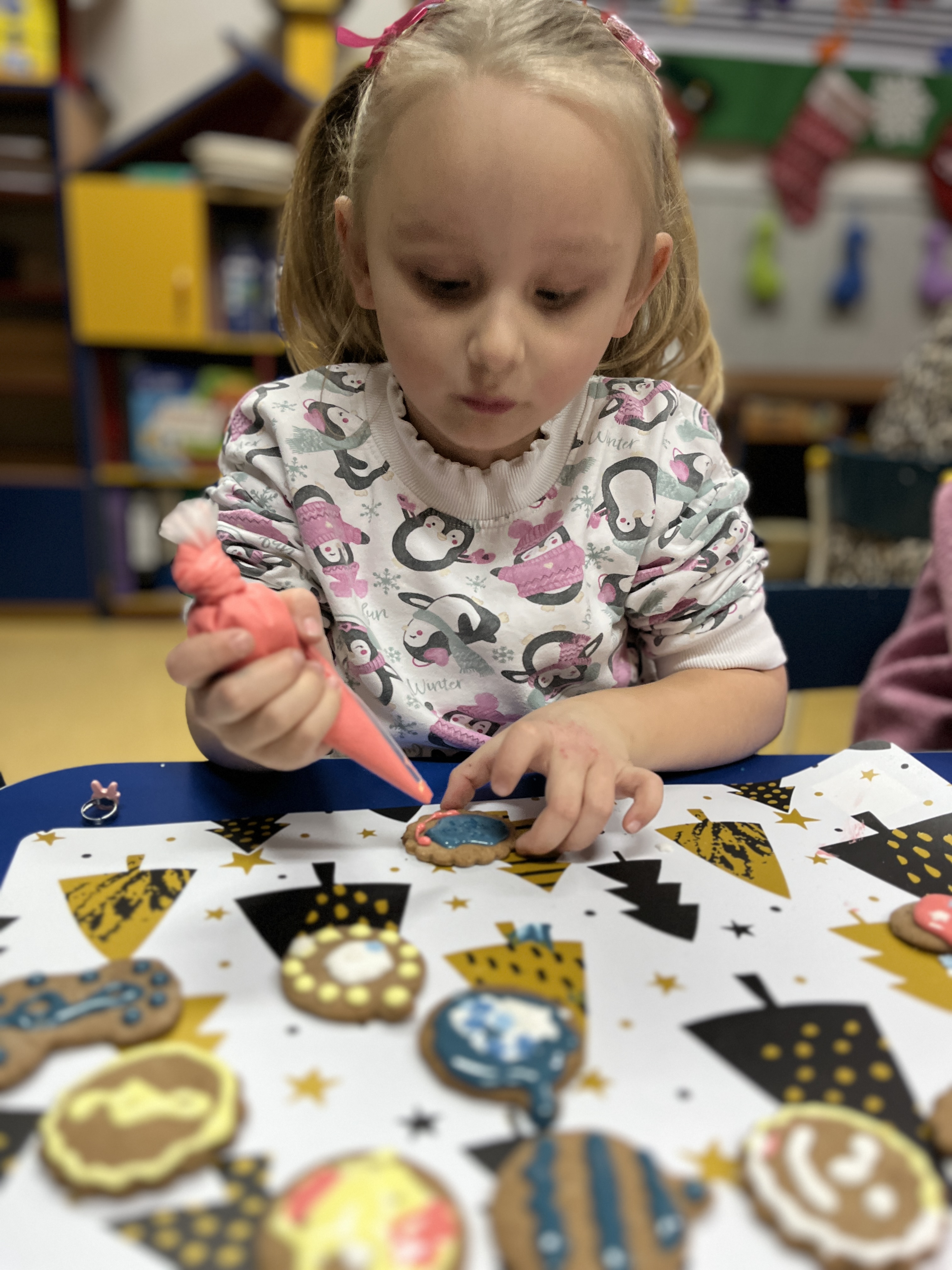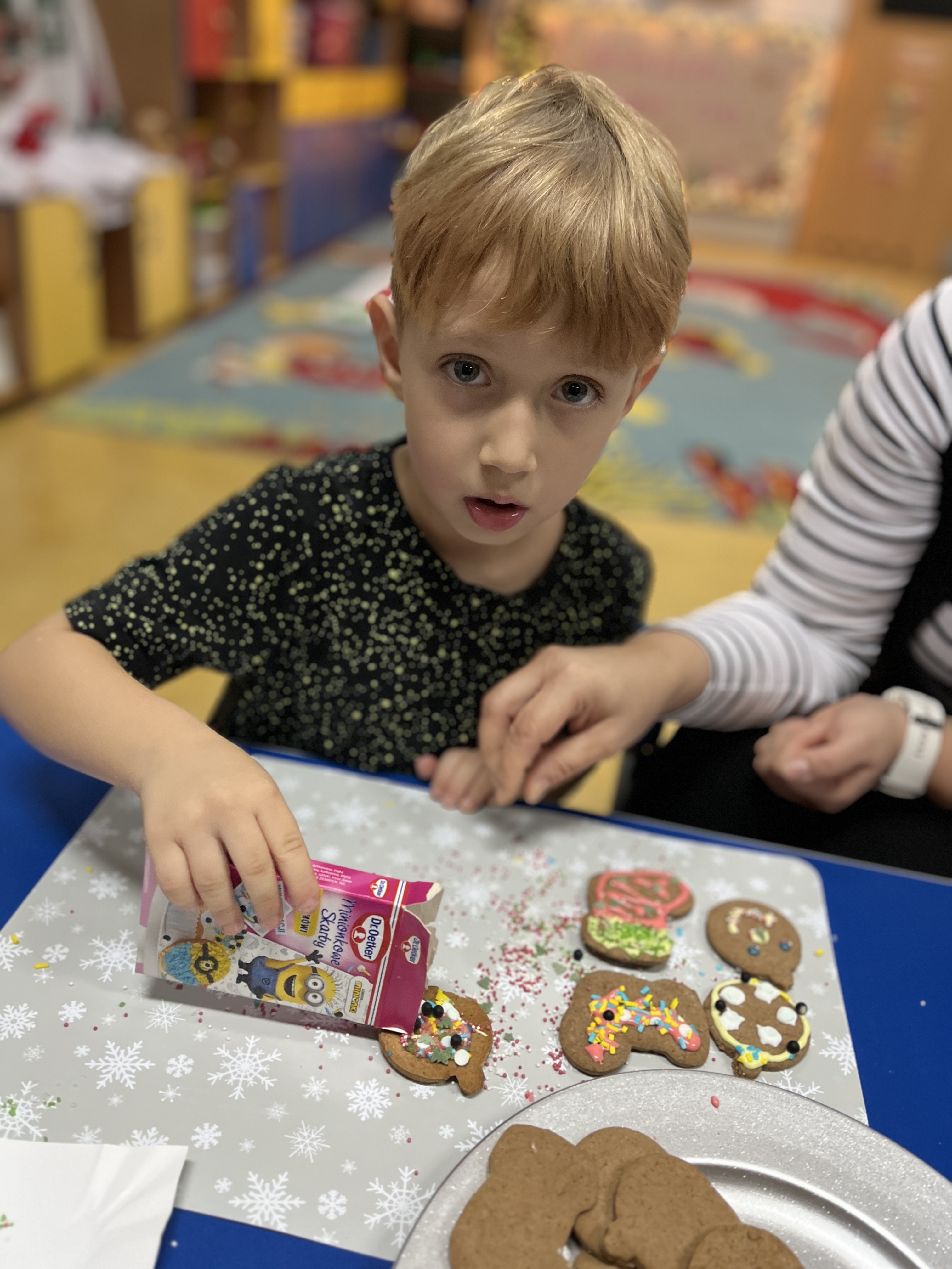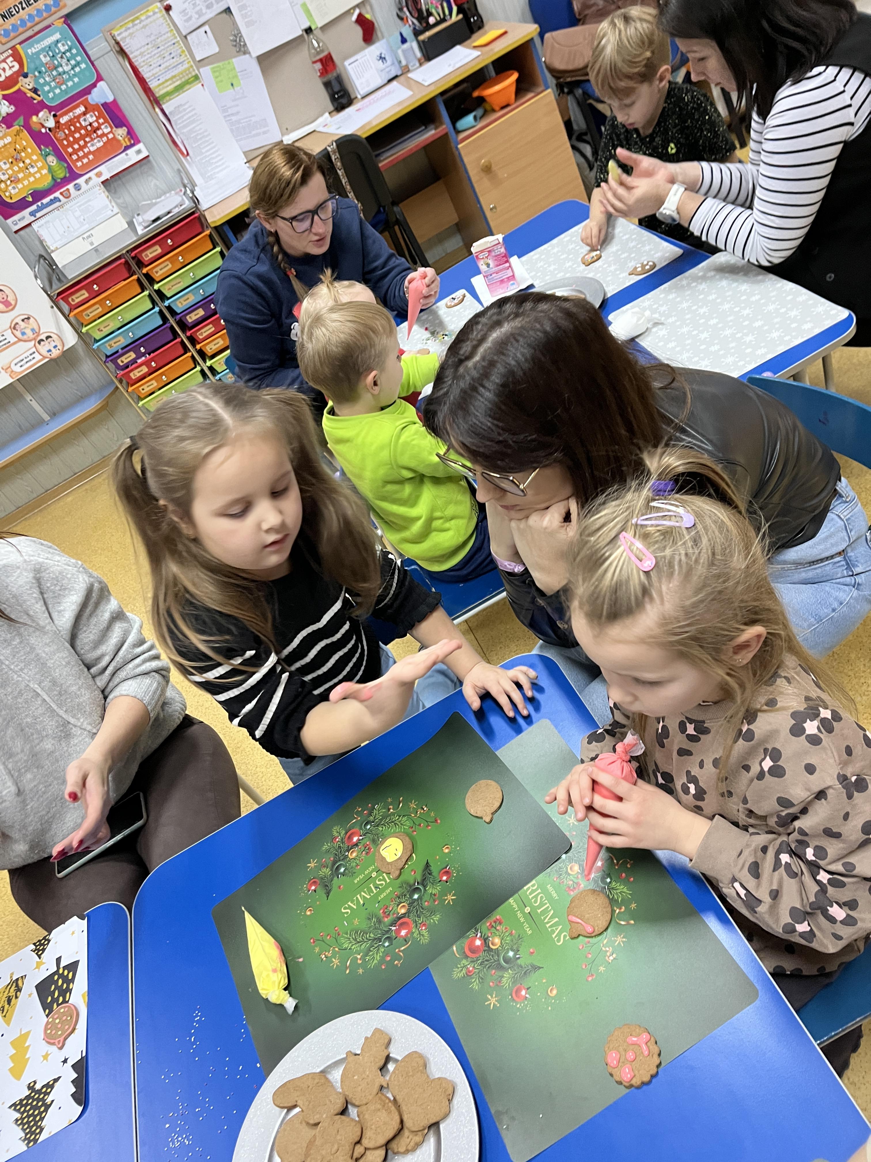 Kolejnym punktem było dekorowanie pierniczków, które dzieci przygotowały w poprzednim tygodniu. Atmosfera była swobodna, pełna uśmiechu, a zapach lukru i przypraw korzennych tylko dodawał uroku. Trudno było się powstrzymać przed spróbowaniem własnych dzieł. Te słodkości trafią na przedszkolny kiermasz już 8 grudnia.