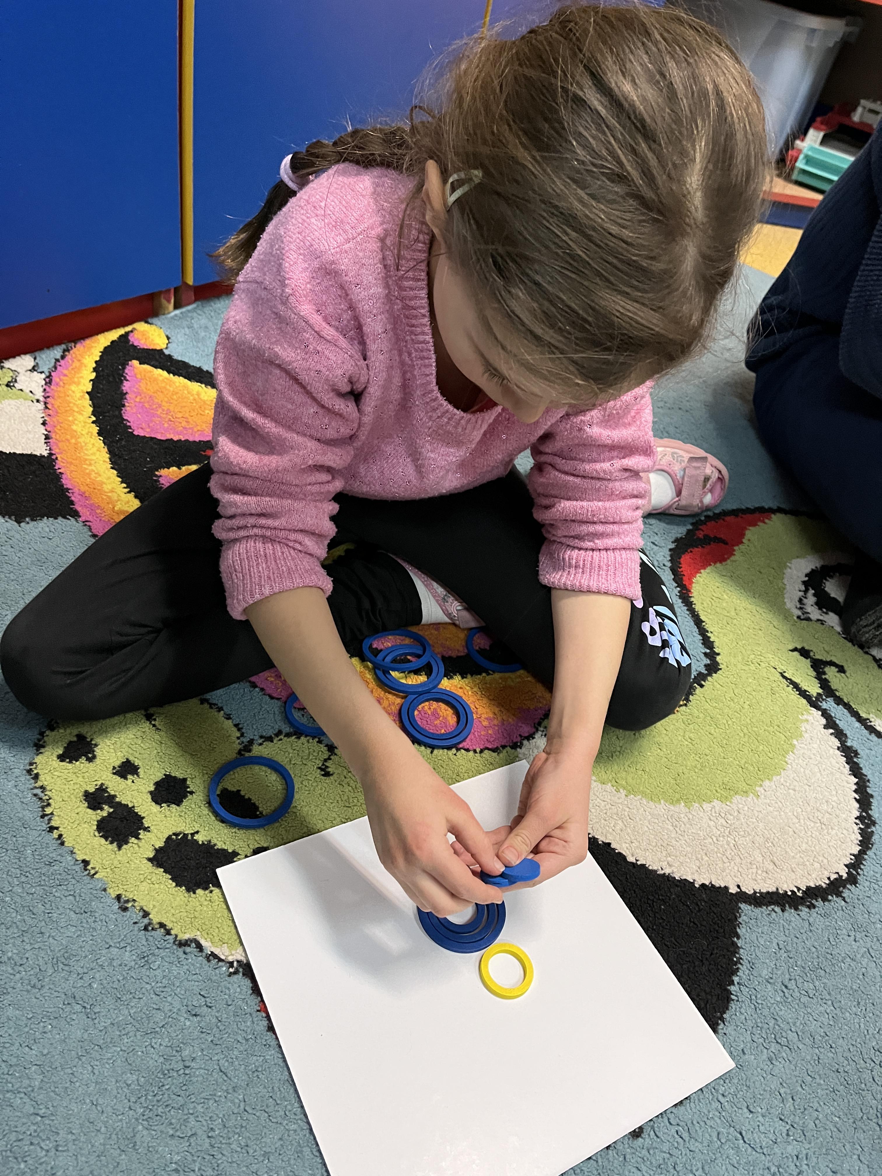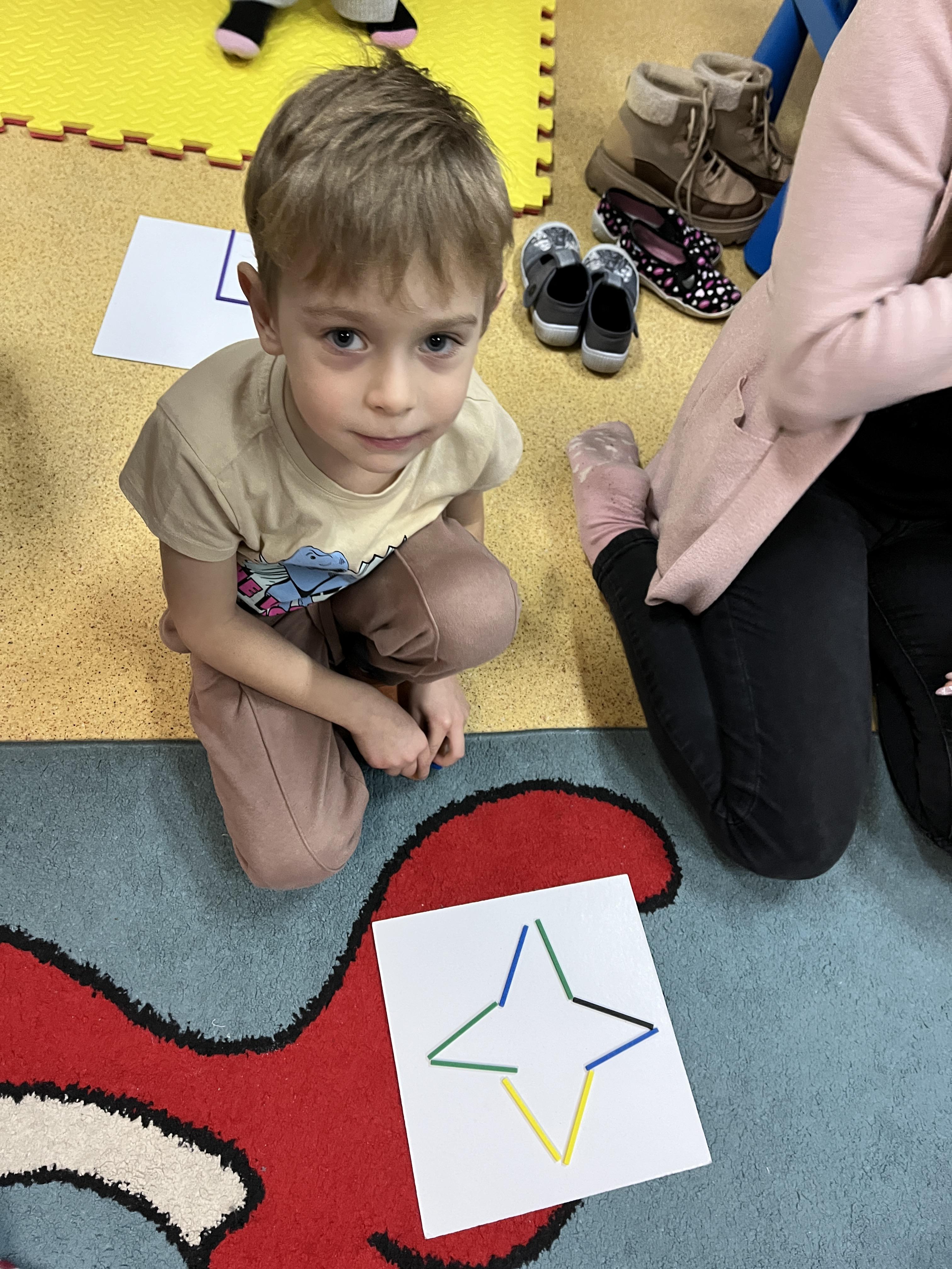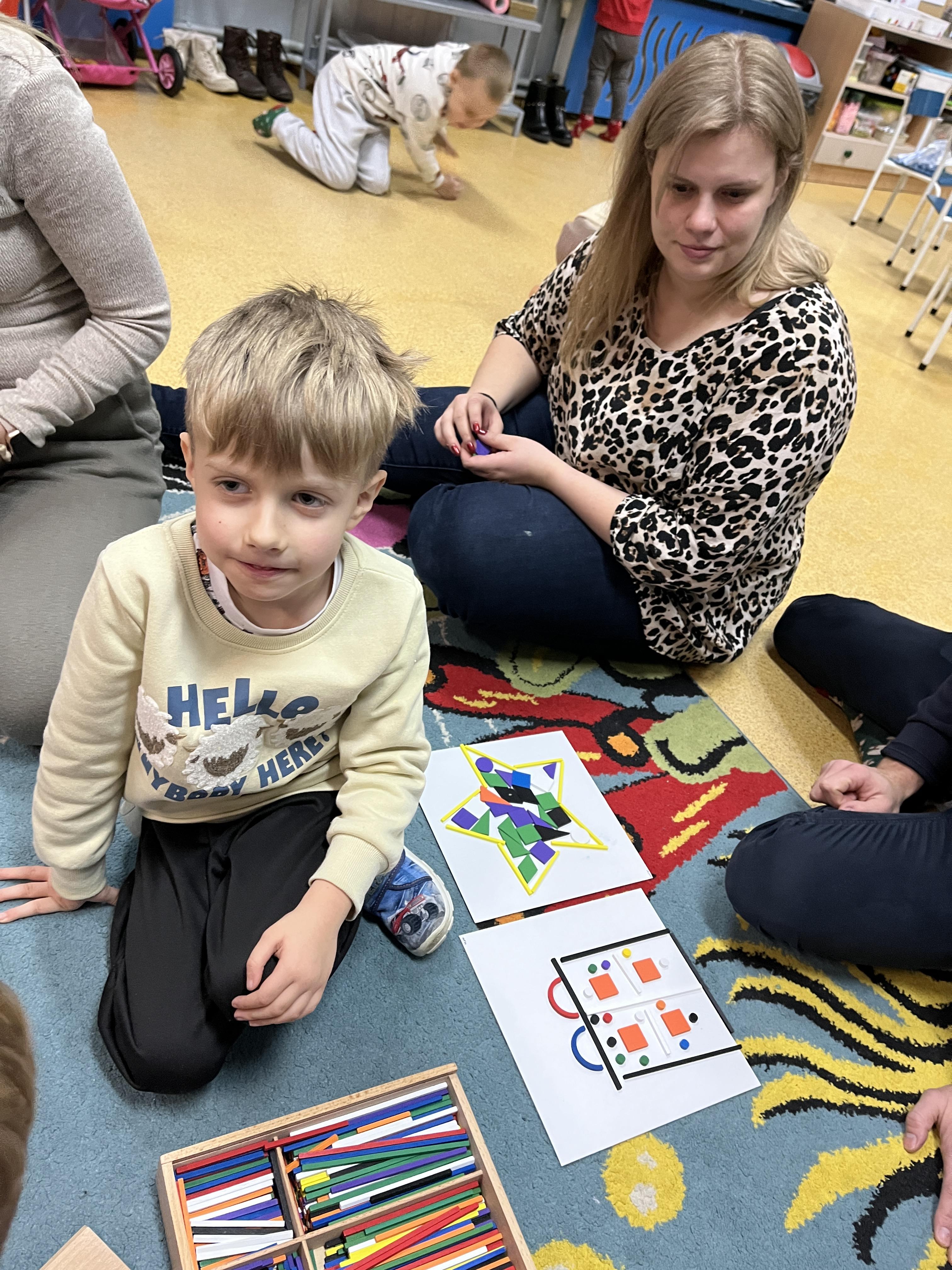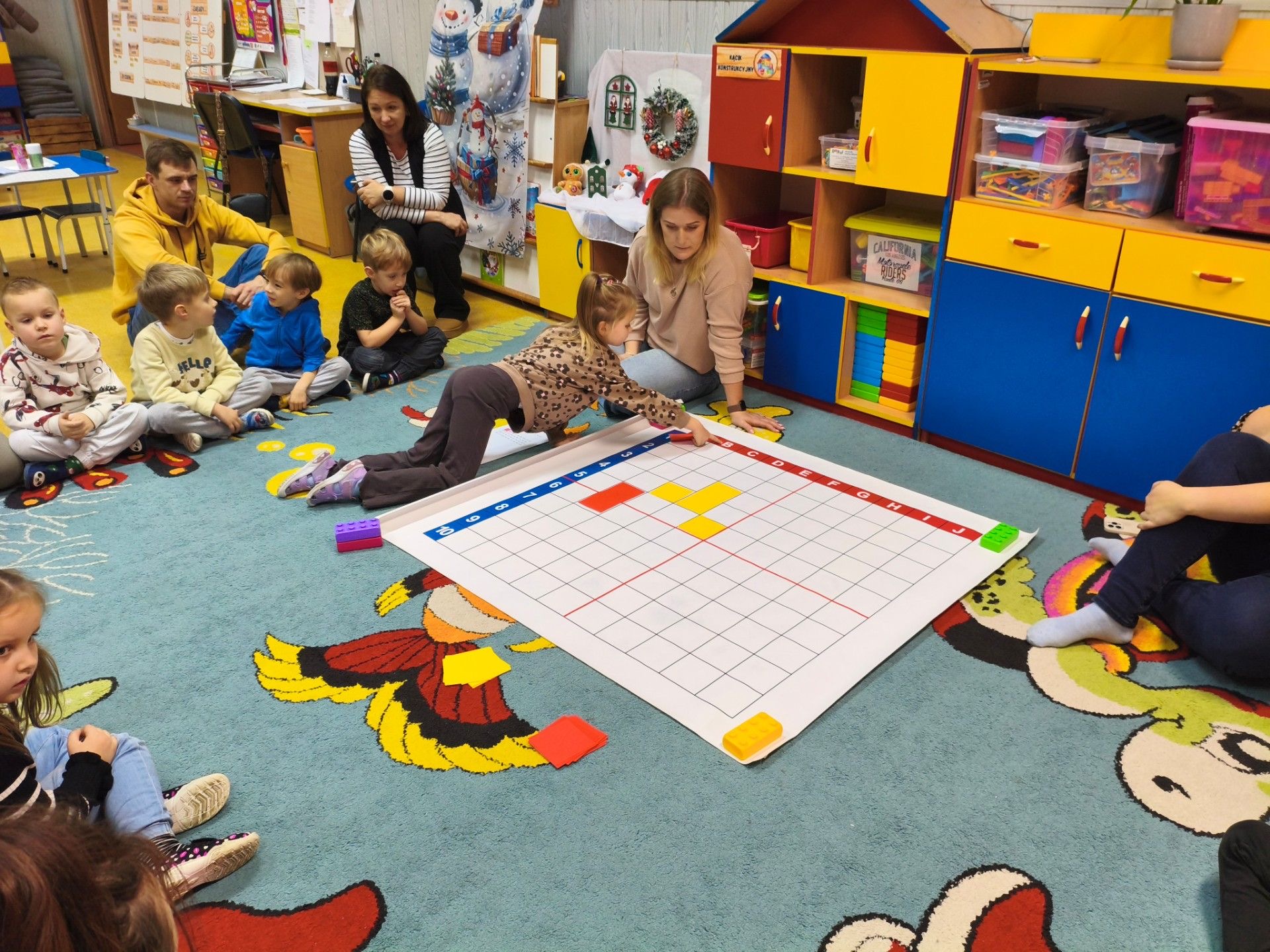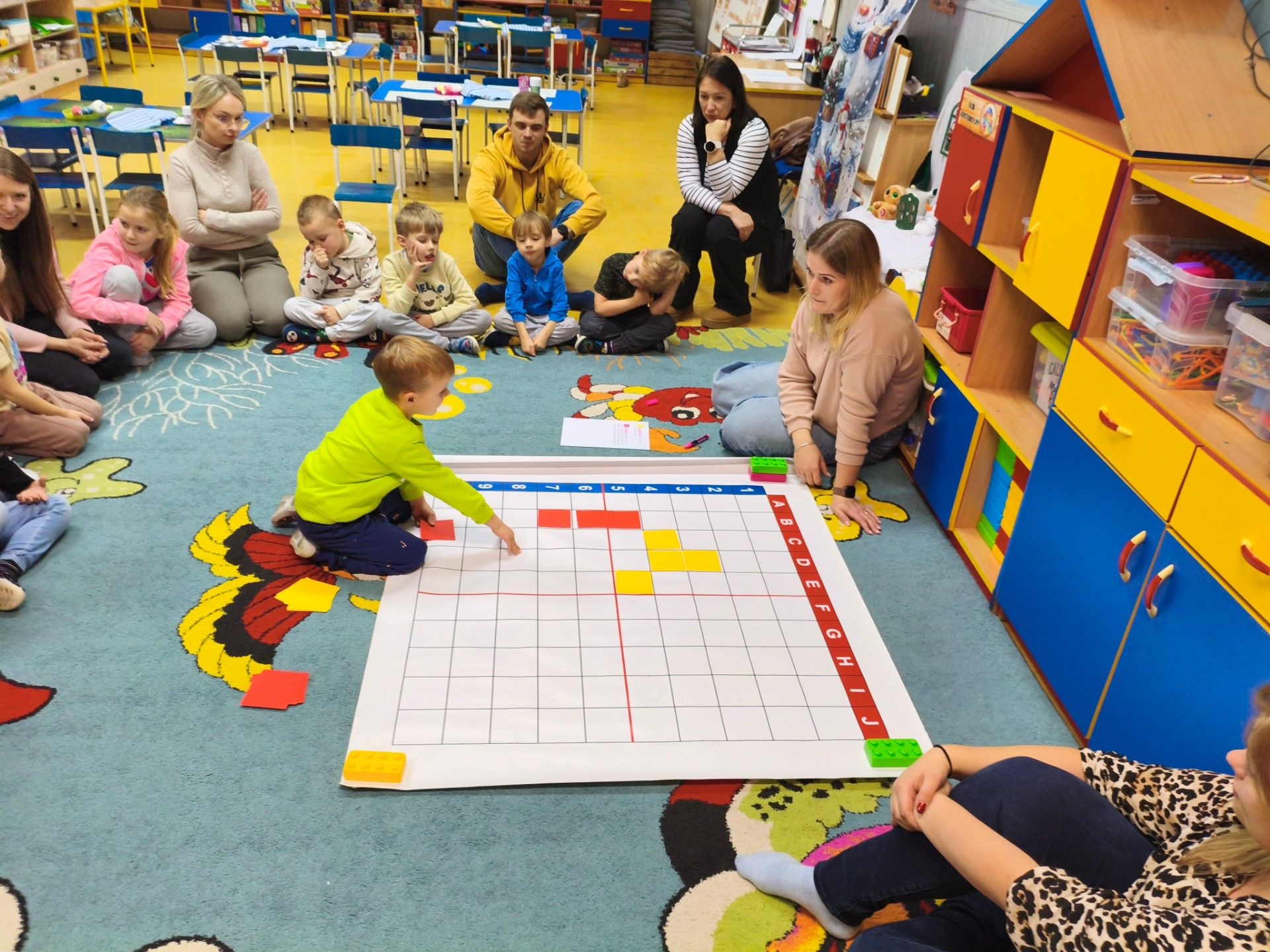 Na początku dzieci losowały z prawej lub lewej ręki nauczycielki kartę z kodem. Potem razem z rodzicami układały na macie kolorowe kwadraty tak, aby powstał układ zgodny z tym, co widzieli na karcie. Wprowadziło to wszystkich w świat kodowania w prosty i zabawny sposób, a przy okazji pozwoliło ćwiczyć spostrzegawczość i planowanie.